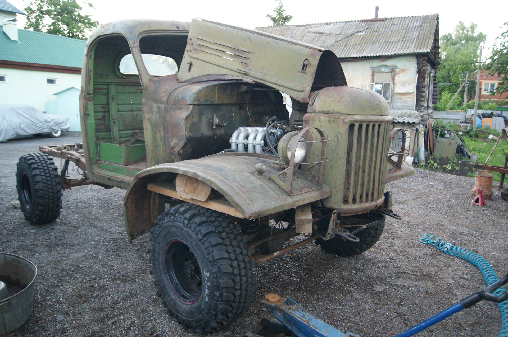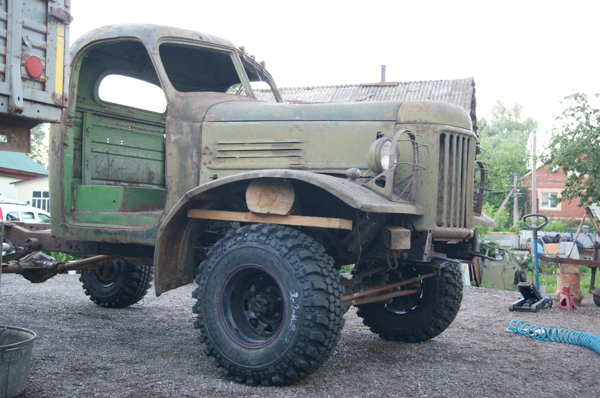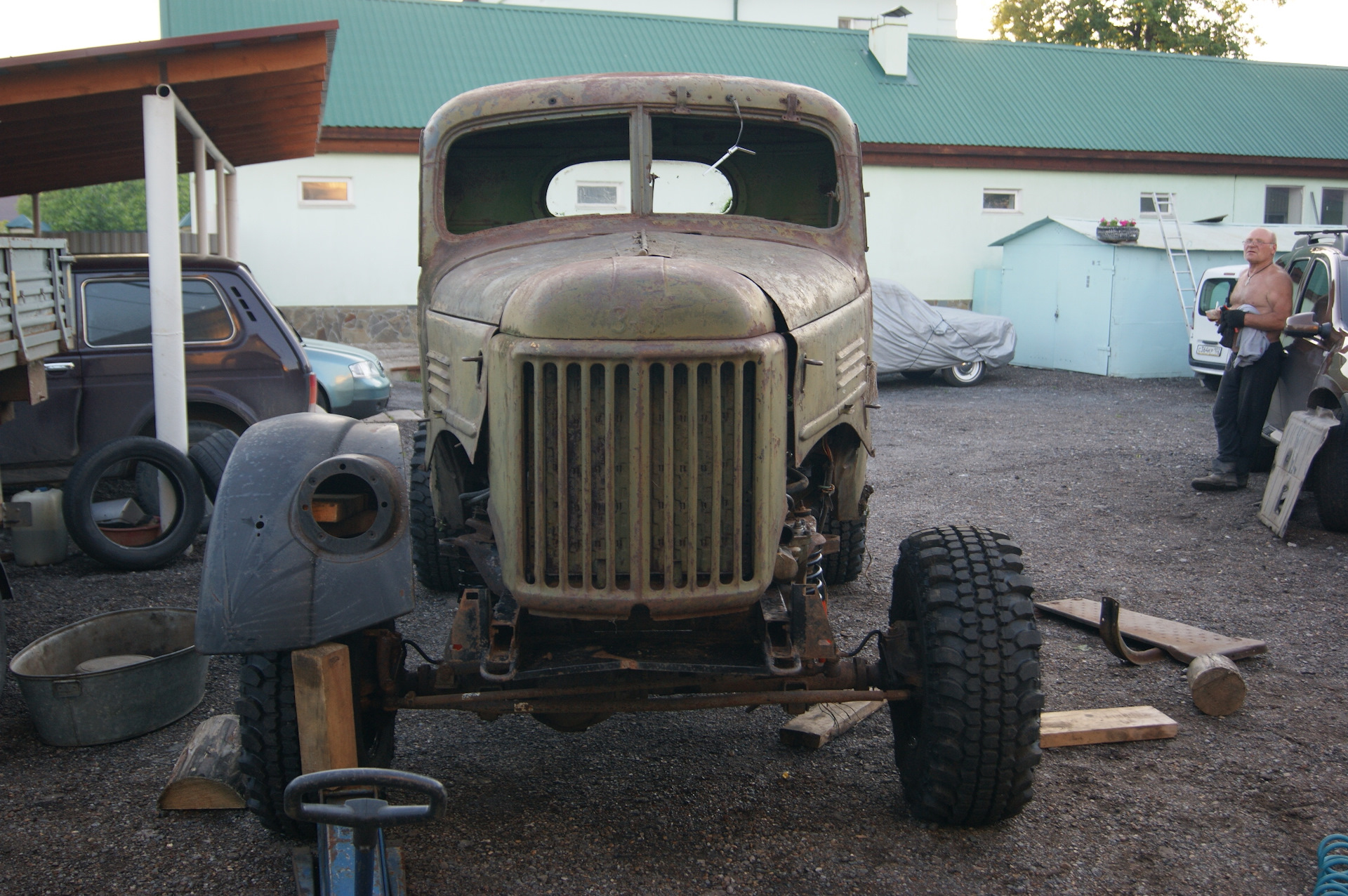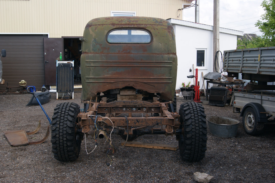 После установки колес на шасси, я не утерпел и сняв со старой кабины двери и стекла, накинул её для примерки. В след за кабиной свое место заняли решетка радиатора и капот. Болты крепления рамки радиатора ЗиЛ 157 идеально вошли в штатные крепежные места радиатора УАЗа…я удивился…Прикинул по месту, какие кронштейны крепления кабины придется изготавливать. Образ машины начинает вырисовываться. Пока непонятки с передними крыльями…больно уж они велики для таких колес. Будем либо переделывать, либо применять от ГаЗ 51, но тогда весь образ и харизма морды 157-ого потеряются…Правое крыло 157-го у меня лопнутое, я его подогнул по окружности и примерил, стало немного лучше.В общем, время покажет. А пока просто фото. Прошу строго пока не судить. Ну и конечно добавляю пару фото со стройки бани.