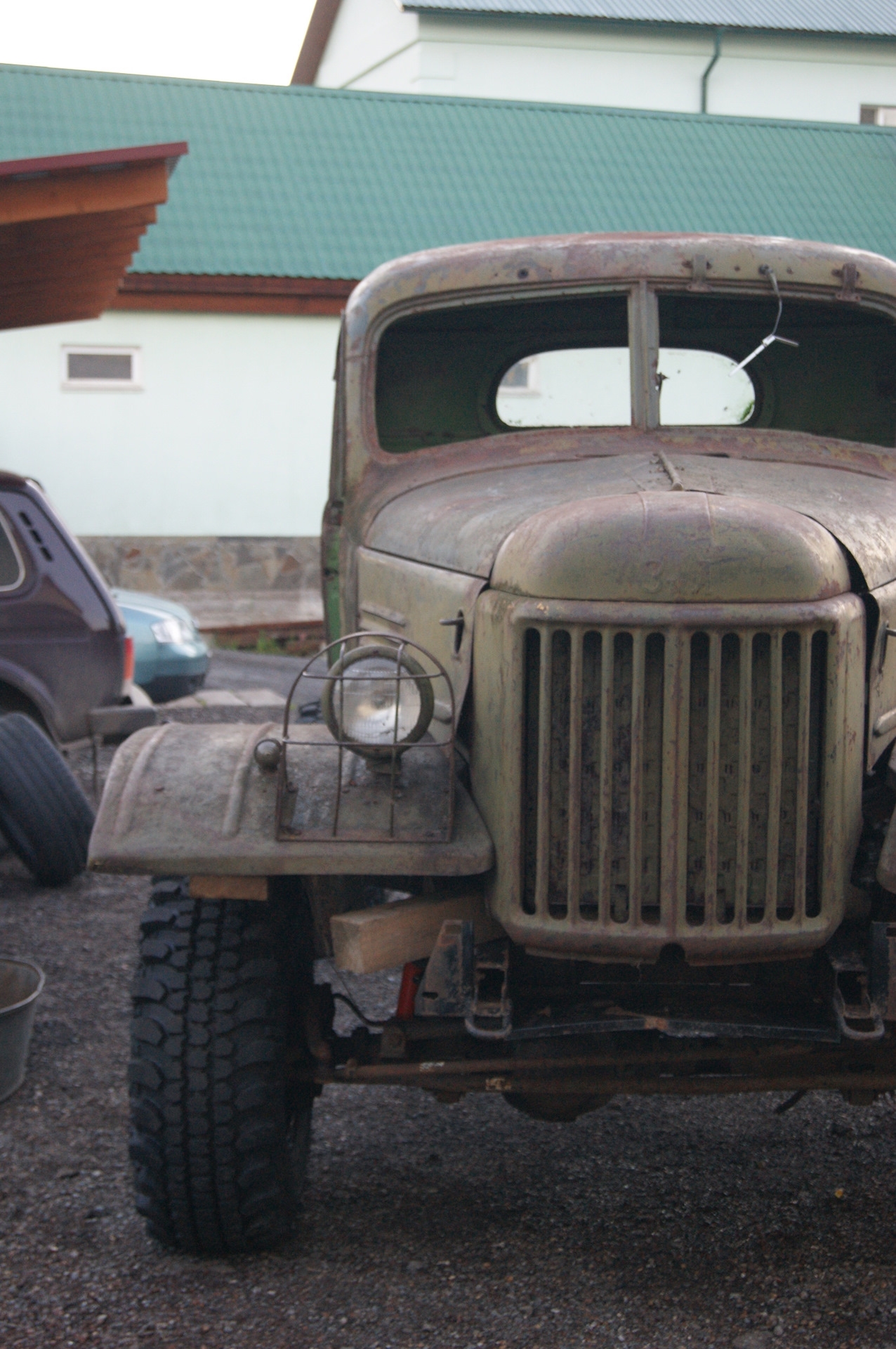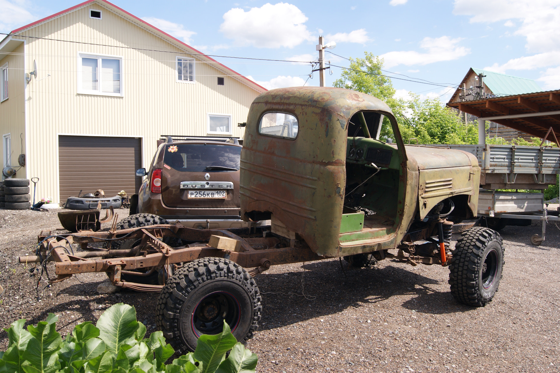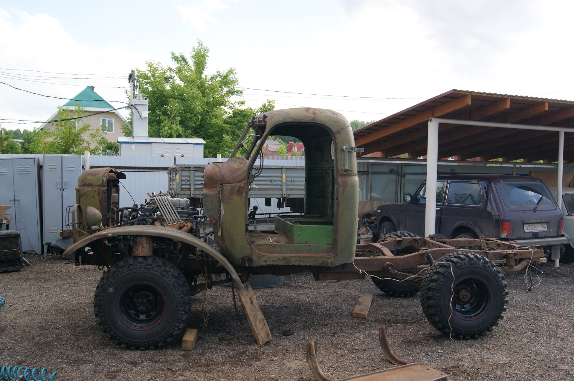 После установки колес на шасси, я не утерпел и сняв со старой кабины двери и стекла, накинул её для примерки. В след за кабиной свое место заняли решетка радиатора и капот. Болты крепления рамки радиатора ЗиЛ 157 идеально вошли в штатные крепежные места радиатора УАЗа…я удивился…Прикинул по месту, какие кронштейны крепления кабины придется изготавливать. Образ машины начинает вырисовываться. Пока непонятки с передними крыльями…больно уж они велики для таких колес. Будем либо переделывать, либо применять от ГаЗ 51, но тогда весь образ и харизма морды 157-ого потеряются…Правое крыло 157-го у меня лопнутое, я его подогнул по окружности и примерил, стало немного лучше.В общем, время покажет. А пока просто фото. Прошу строго пока не судить. Ну и конечно добавляю пару фото со стройки бани.