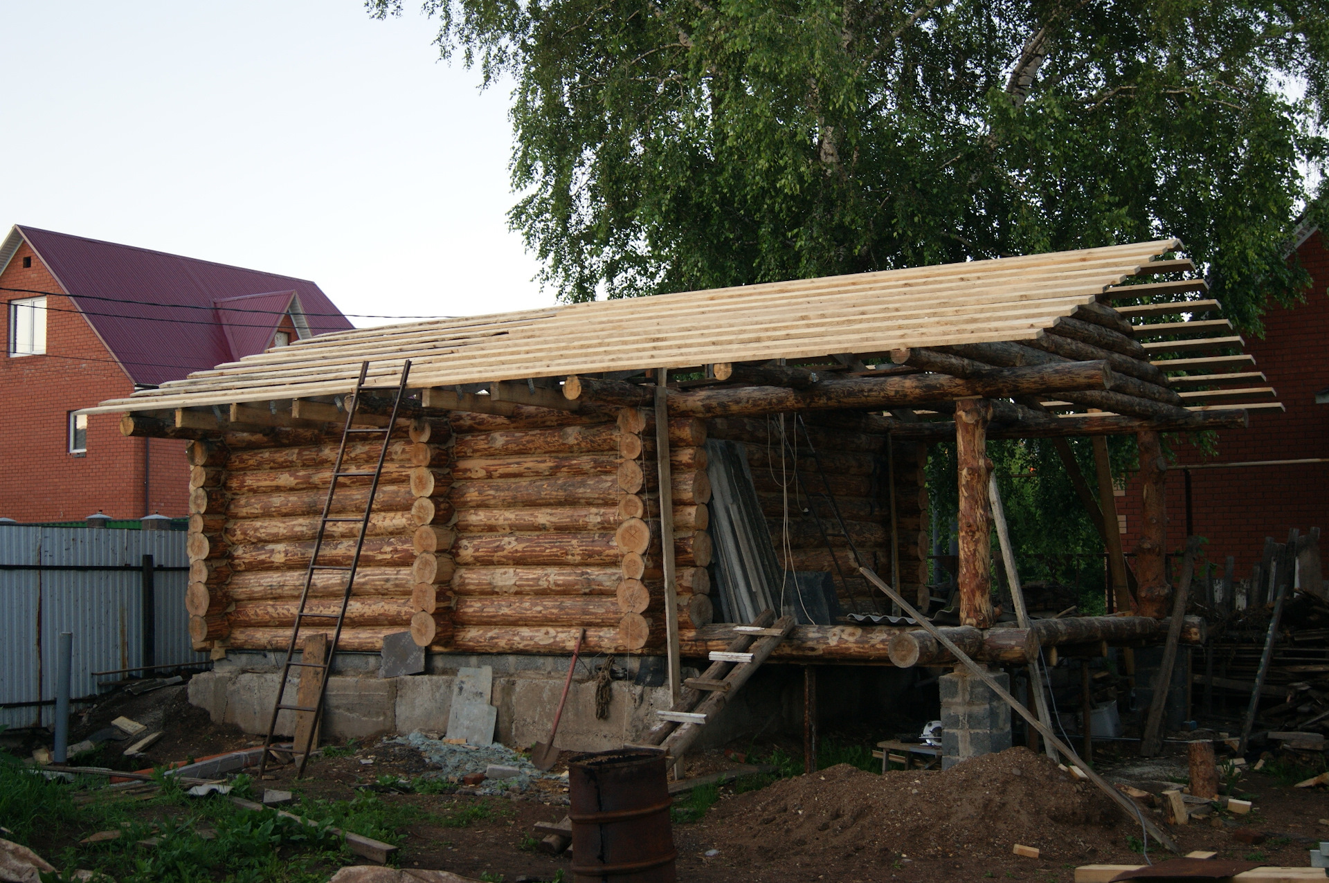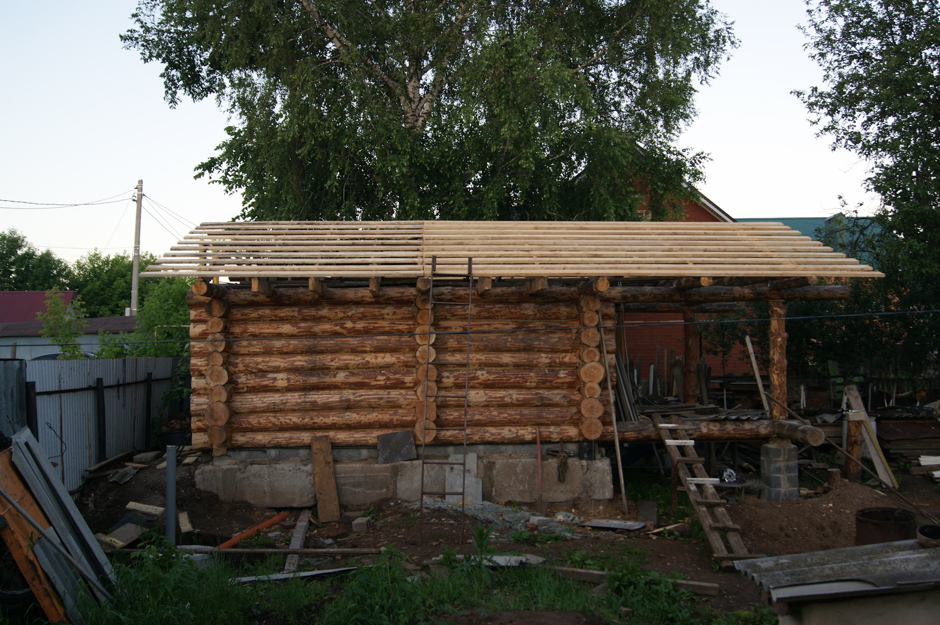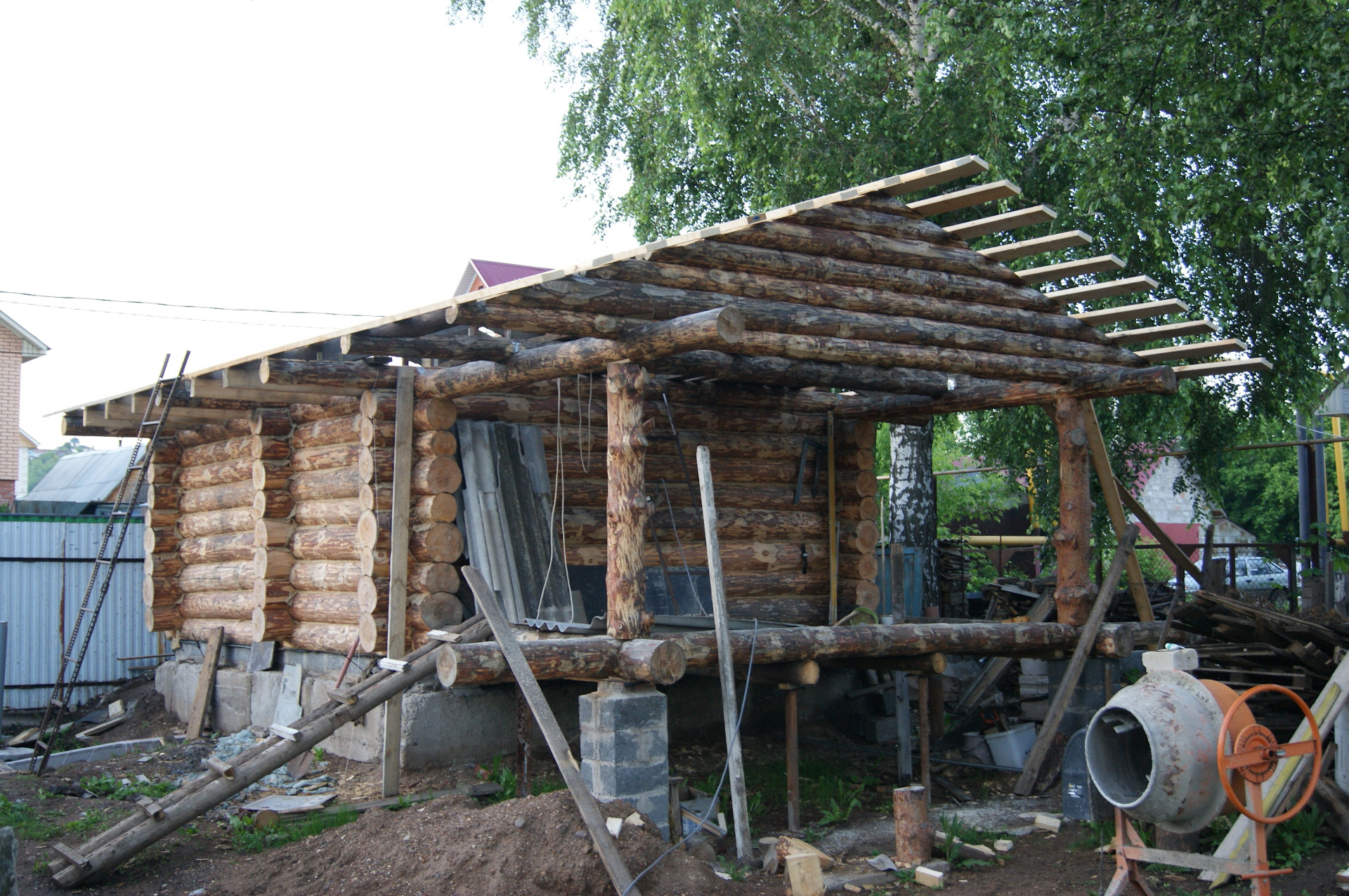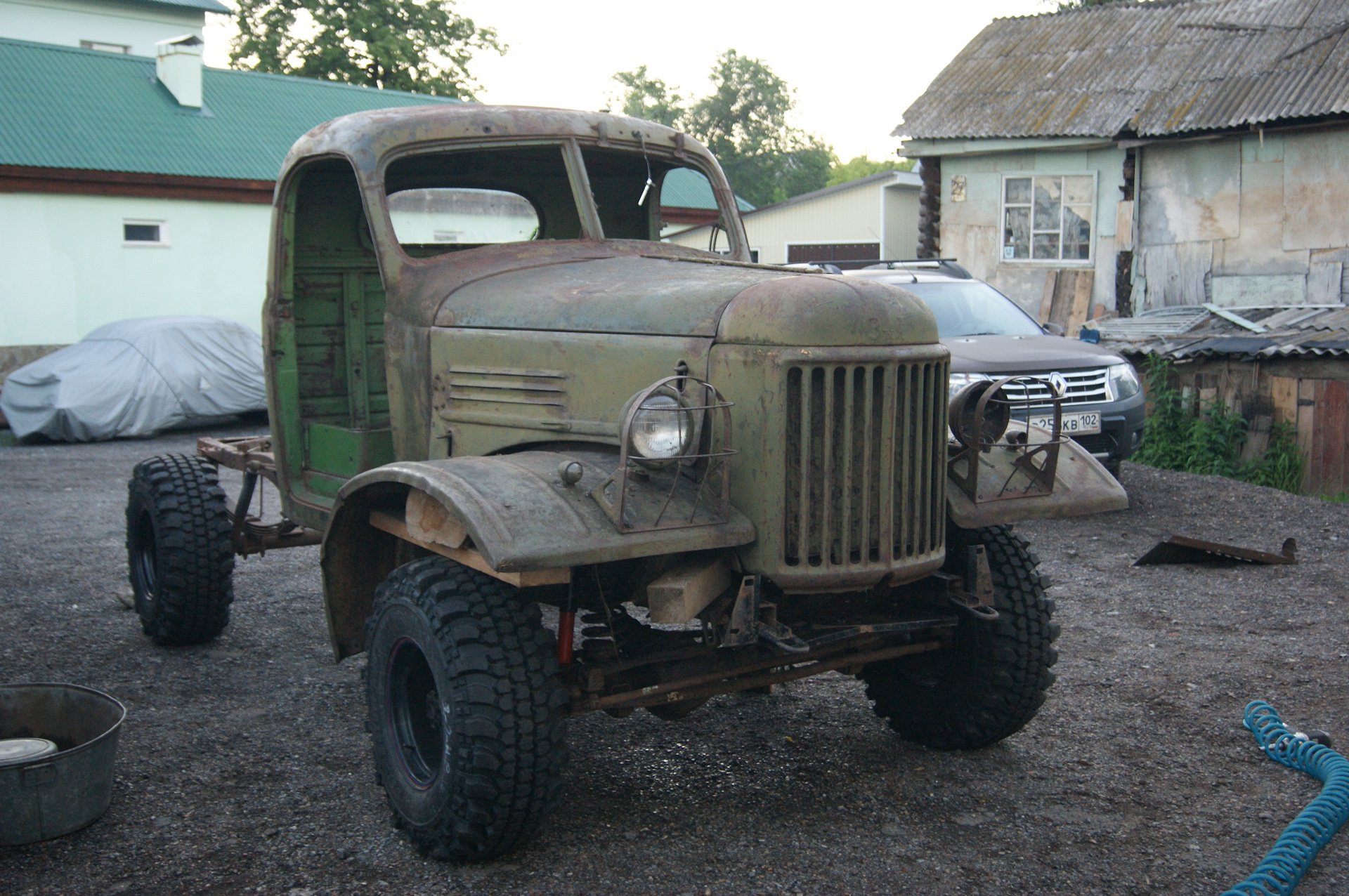 После установки колес на шасси, я не утерпел и сняв со старой кабины двери и стекла, накинул её для примерки. В след за кабиной свое место заняли решетка радиатора и капот. Болты крепления рамки радиатора ЗиЛ 157 идеально вошли в штатные крепежные места радиатора УАЗа…я удивился…Прикинул по месту, какие кронштейны крепления кабины придется изготавливать. Образ машины начинает вырисовываться. Пока непонятки с передними крыльями…больно уж они велики для таких колес. Будем либо переделывать, либо применять от ГаЗ 51, но тогда весь образ и харизма морды 157-ого потеряются…Правое крыло 157-го у меня лопнутое, я его подогнул по окружности и примерил, стало немного лучше.В общем, время покажет. А пока просто фото. Прошу строго пока не судить. Ну и конечно добавляю пару фото со стройки бани.