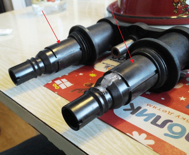 Судя по бумажкам предыдущего владельца, он менял их каждые 30 тысяч, я сменил через двадцать, и на 1 тысяче — пробитие. Свечи ставились оригинальные GM ZFR6… бензин лукойловский… когда зачищал место, пластик как пыль, именно на месте отлива двух половинок… полагаю, качество плюс агрессивная среда сделали своё дело за 7 лет жизни авто…