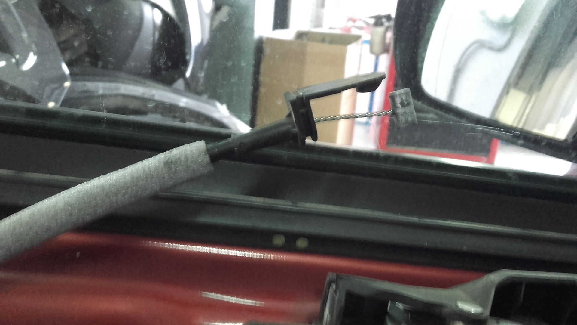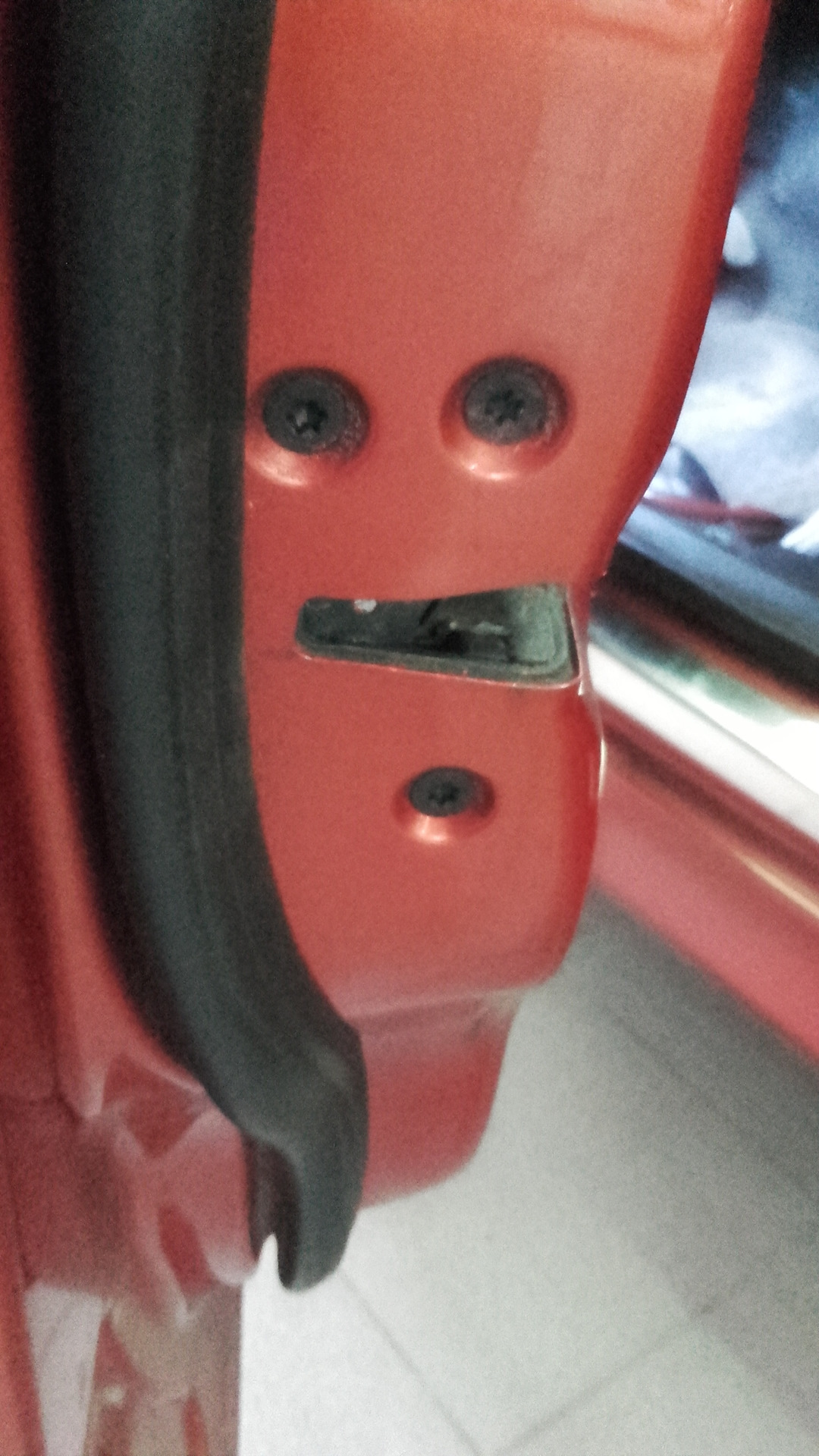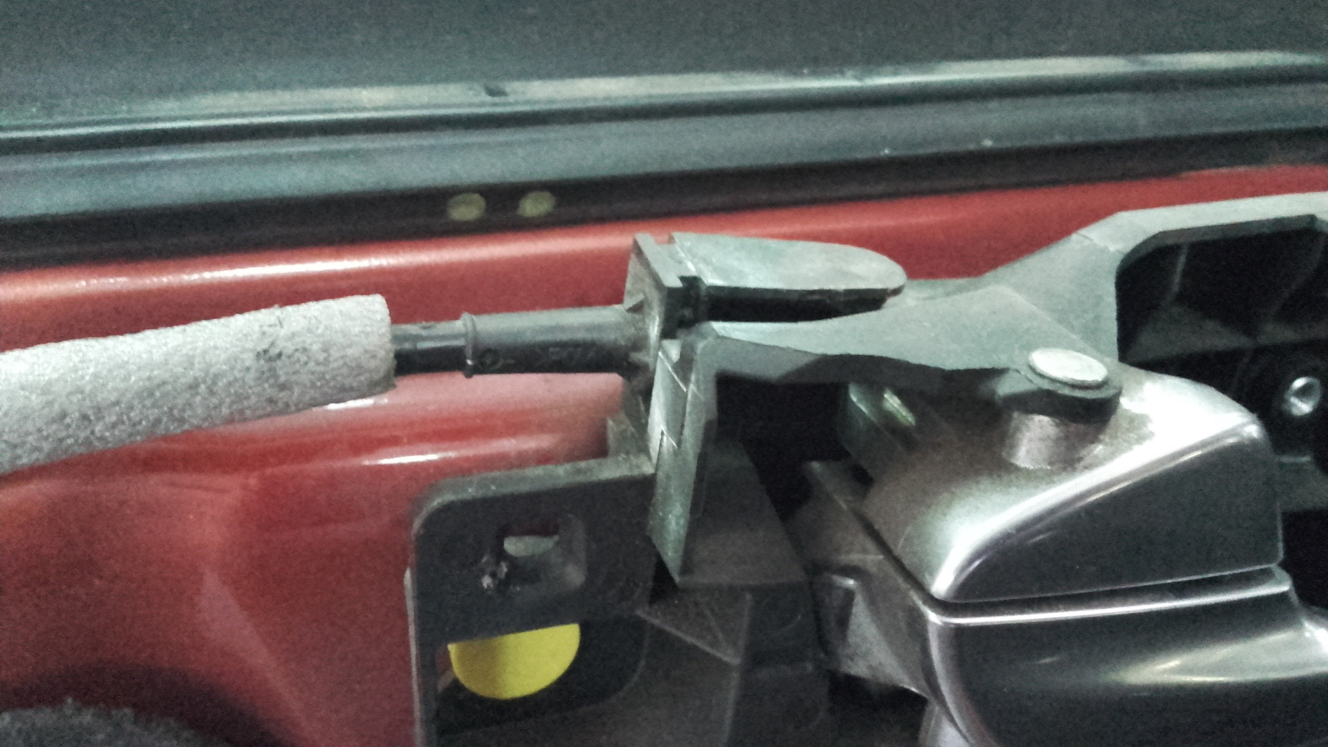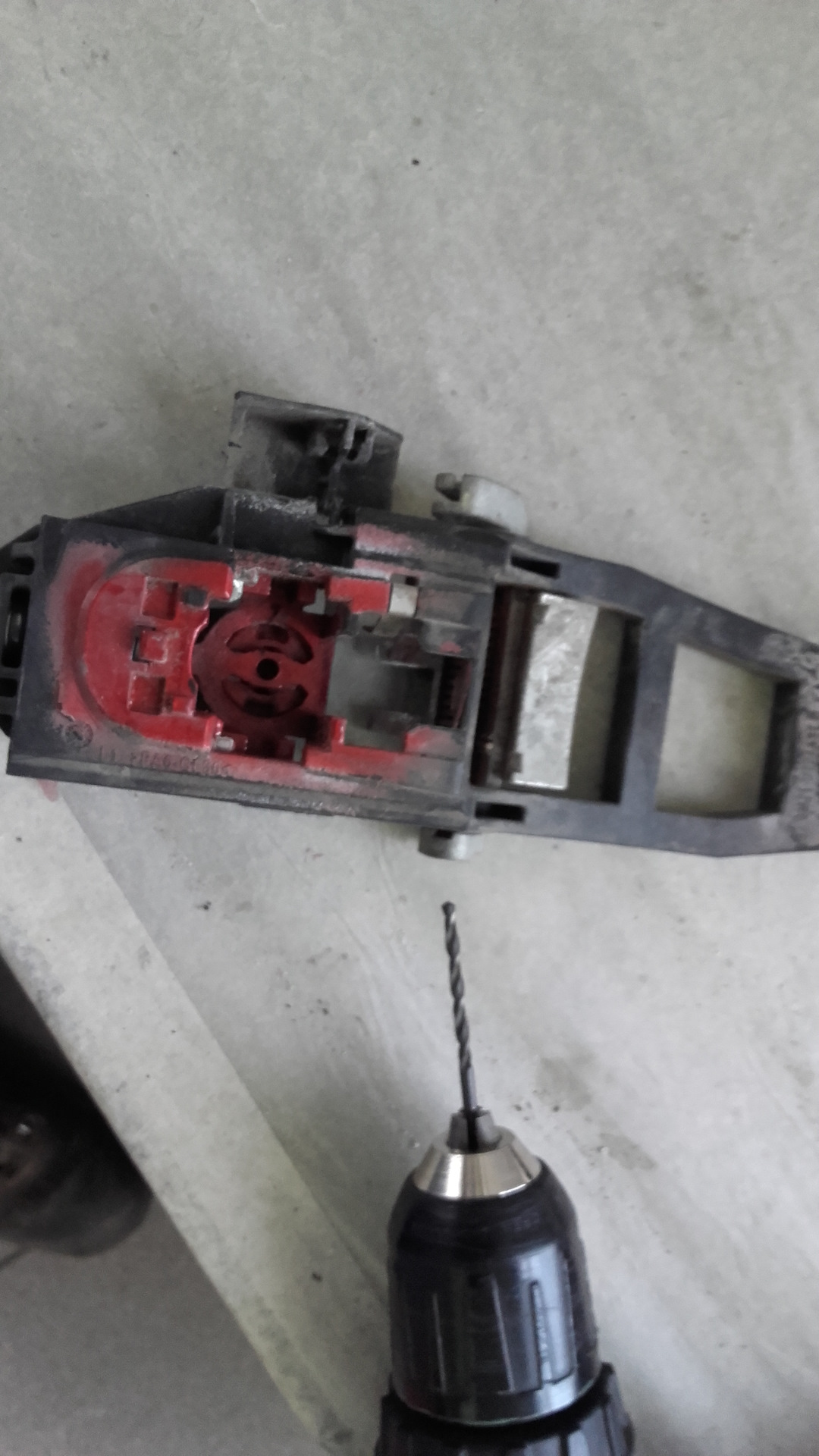 так проявляется внешне эта проблемапрокрутив против часовой ручку двери в натяг создаем щель между ручкой и вставкой в которую вставляем клин и вынимаем вставку затем выкручиваем два саморезауголок оттягиваем в сторону и вынимаемчем то тонким вынимаем заглушку в нише ручки и выкручиваем винтподдеваем заглушку и 20 торексом откручиваем пятачок наружной ручкиэтот саморез выкручиваемснимаем ручку, прокладки, и саморез30 торексом откручиваем винты замкаснимаем трос с ручки вверхвверхвот он снятыйаккуратно снимаем шумкуи вынимаем замок, стекло должно быть поднятовот так он выглядитснимаем трос с каркаса ручки, очень аккуратно, 4 защелкивот и виновник, шток на котором пружина и противовесно!для штока только одно отверстие, и как бы вынуть его уже нельзя, но цена такая что пришлось найти решениепросверлить с другой стороны отверстие на 3мм для пробойника, примерно напротив штока, сам шток 4ммсверлим и выбиваем примерно на сантиметр а потом кусачками вытаскиваем штоквот и шток, чистим наждачкой, я взял Р-220