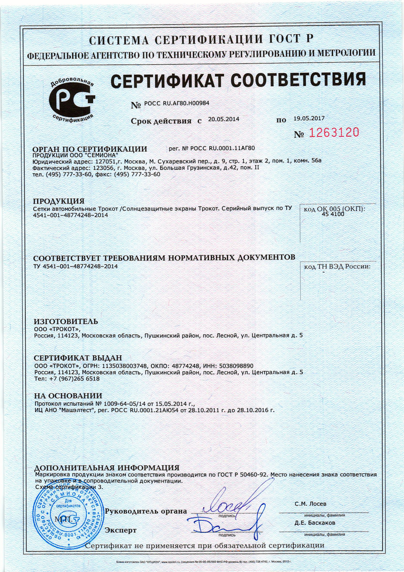 Мне этого показалось мало для аргументированной беседы с сотрудниками, и я даже нашел Сертификат соответствия на Trokot, который распечатал и положил в бардачок )))