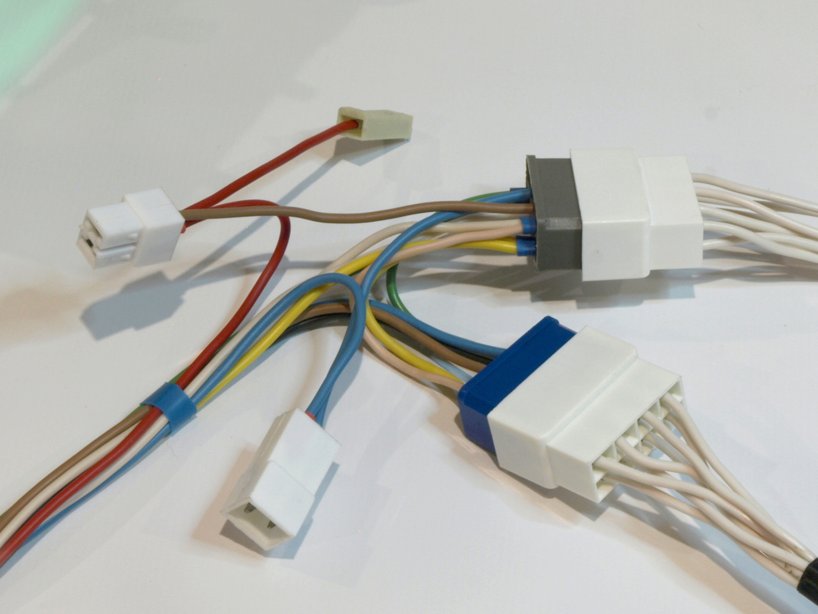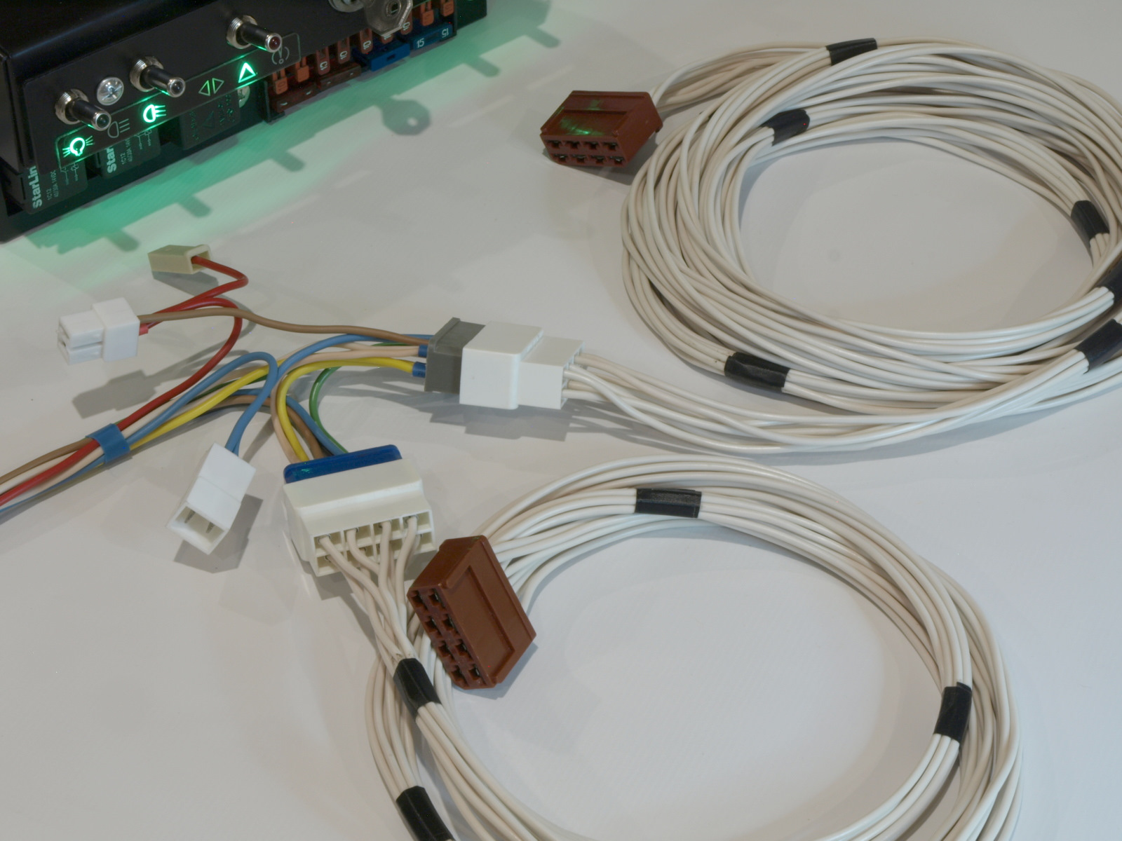 Подключаем удлинители жгутов кузова. К синему жгуту бороды подключаем короткий удлинитель – на фары (на буханочке или VW T2, например, он не нужен), к серому – длинный удлинитель – задний борт. Удлинители 8x – 8x (папа – мама).