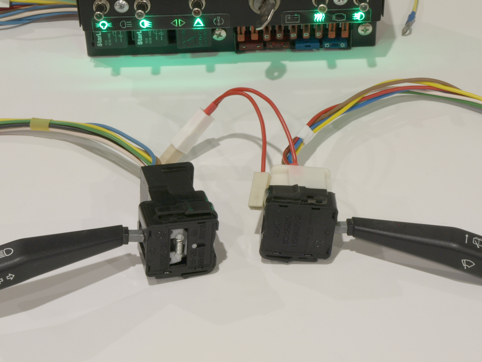 Приступаем к сборке жгутов проводки. Ноги ставим на ширине плеч, левой рукой берём разъём 1x (мама) жёлтого жгута (левого подрулевого переключателя), правой рукой берём разъём 1x (папа) белого жгута (правый подрулевой переключатель) и соединяем. Делаем раз, делаем два. Упражнение закончено.