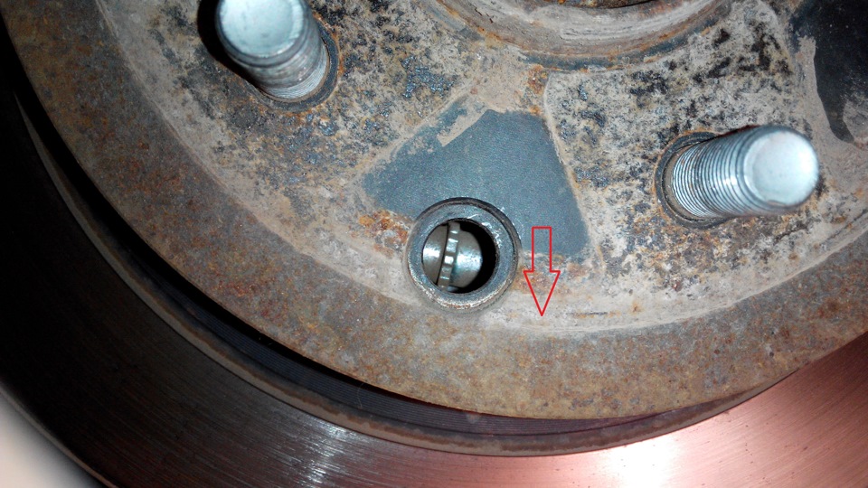 4. Шлицевой отверткой через отверстие в тормозном диске вращаем регулятор вверх, раздвигая колодки, пока в отверстии не покажется резьба регулятора.