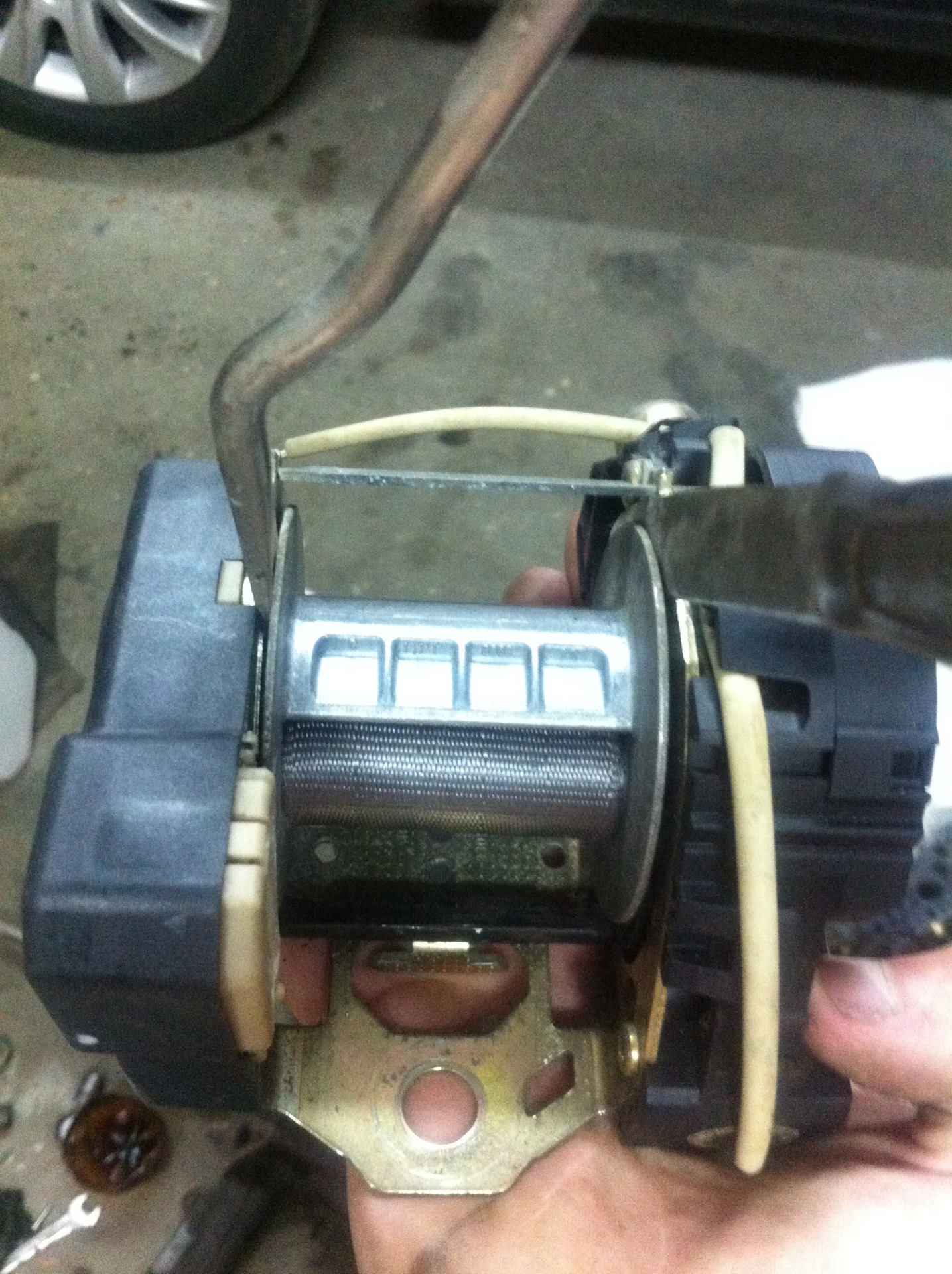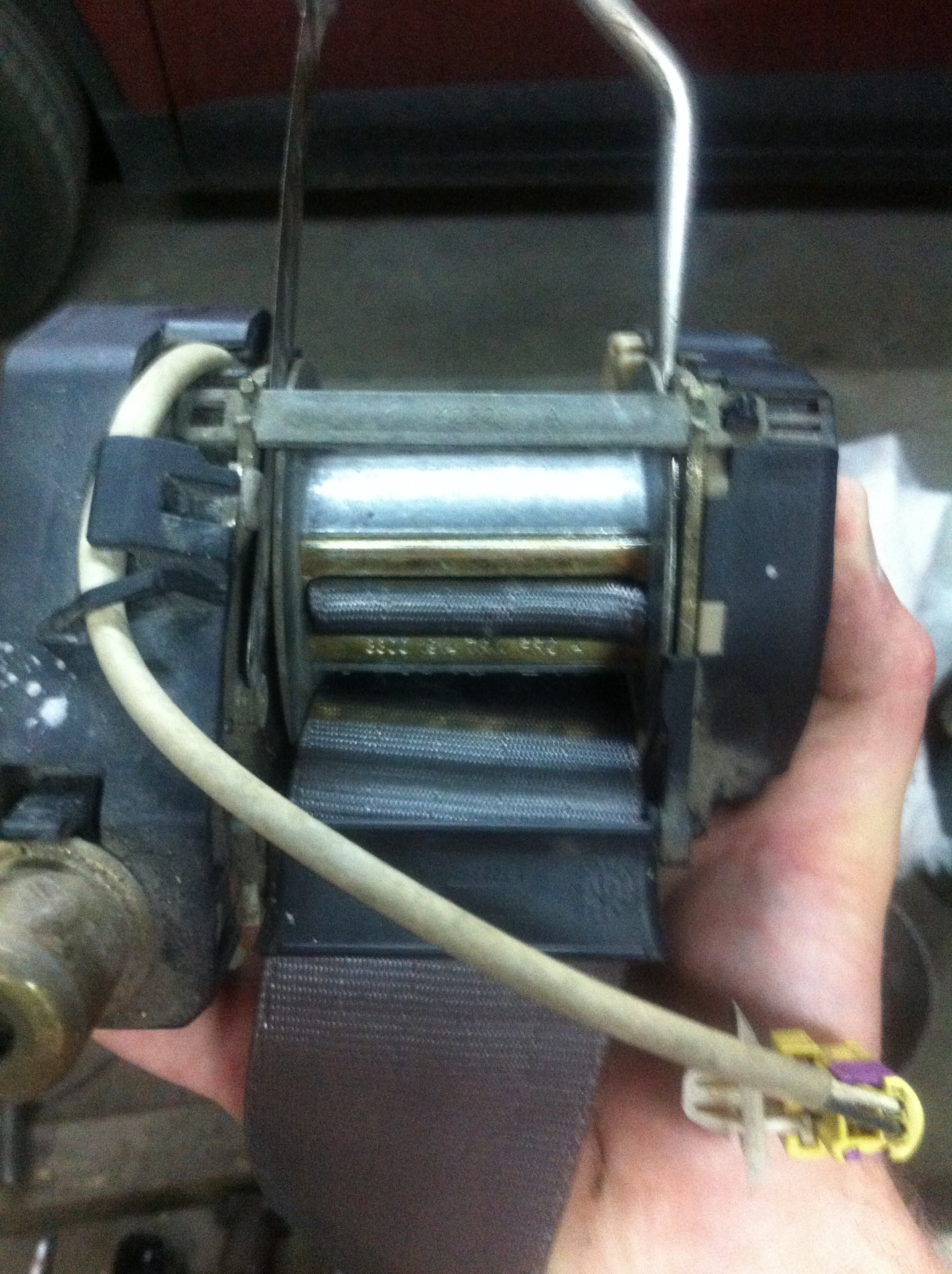 Чтобы вытащить, нужно полностью разобрать механизм.Там очень злая система крепления ремня, чтобы выдерживать большое рывковое усилие.