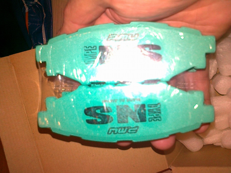 Так было решено, что тормозилки подлежат для начала минимальной замене. Были заказаны с аука из япии колодки от Прожекта тип NS перед-зад и армированные шланги с атомика. Устанавливать пришлось на сток тормозные диски, т.к. неожиданно к Новому году подвело материальное положение и выкидывать четвертак на диски от Прожекта не получилось…