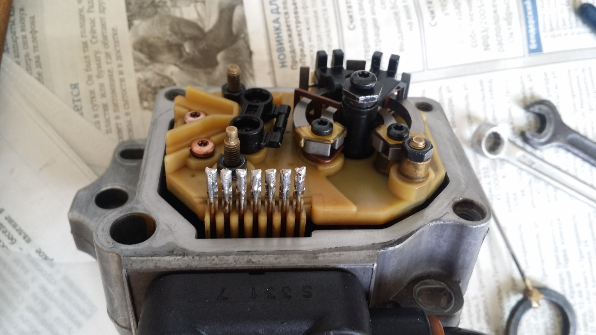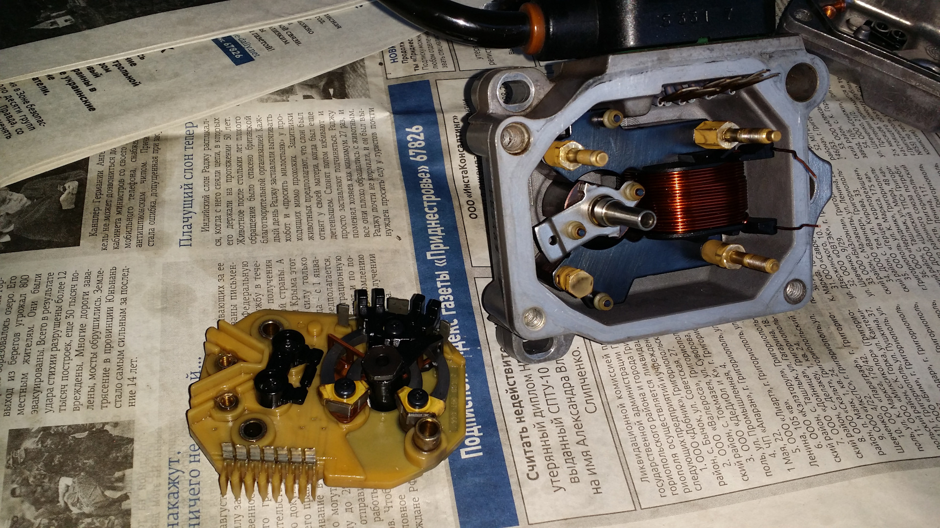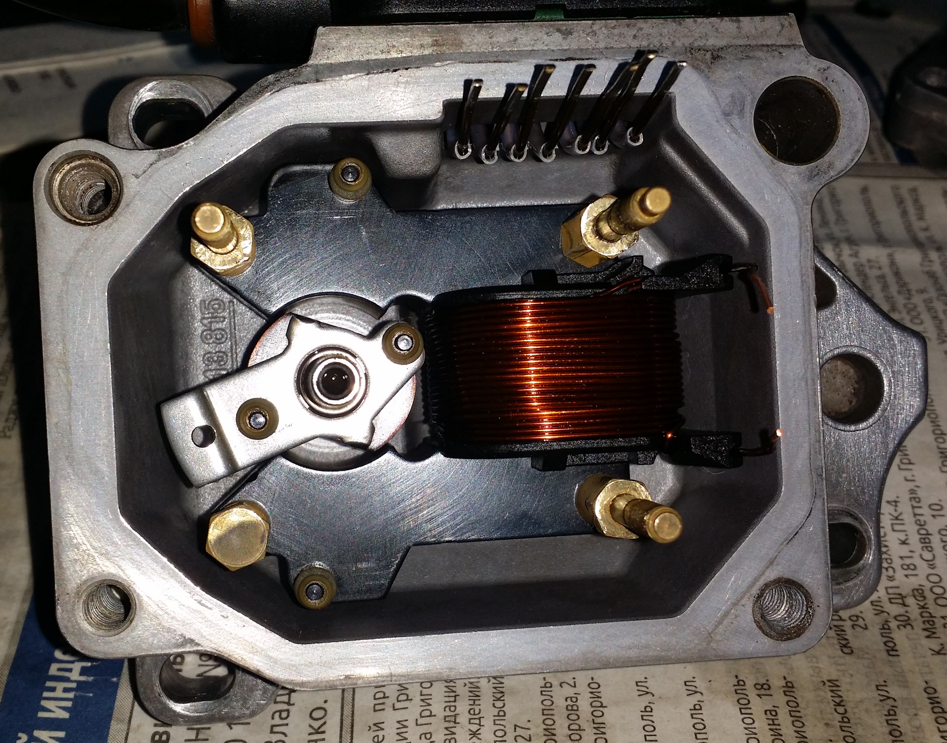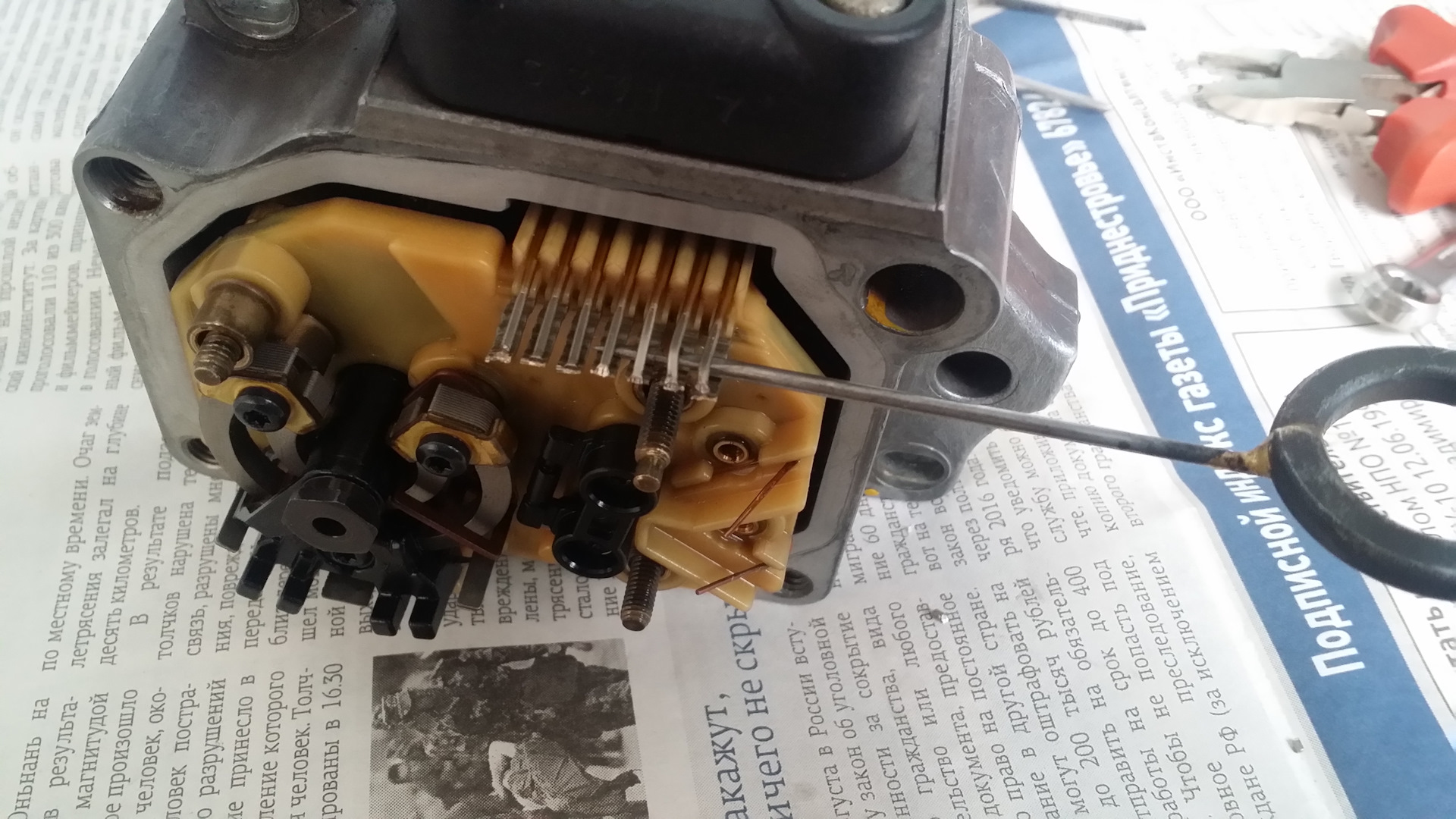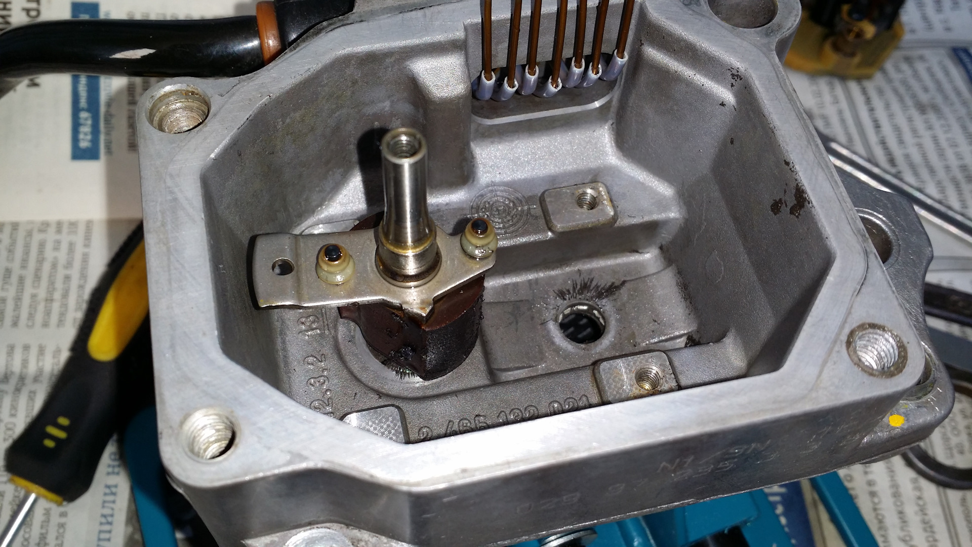 После снятия рамки датчика с платой, все осмотрел. Между электромагнитом и подвижной частью множество грязи и металлической стружки. За 20 лет впервые производится чистка не пригодного к ремонту датчика! Все отмыв и отчистив, собираю в обратной последовательности. Контакты хорошенько пропаял, рамку датчика не затягивал контрящим винтом. Это делал после установки в авто и регулировки напряжения рамки. Аккуратно установил голову ТНВД и отрегулировал подачу. Установил новые прокладки из ремкомплекта.