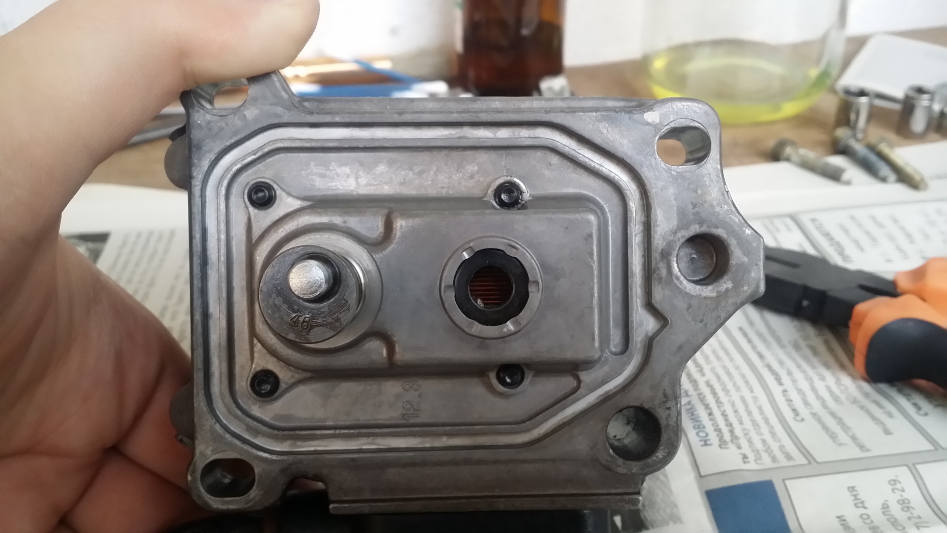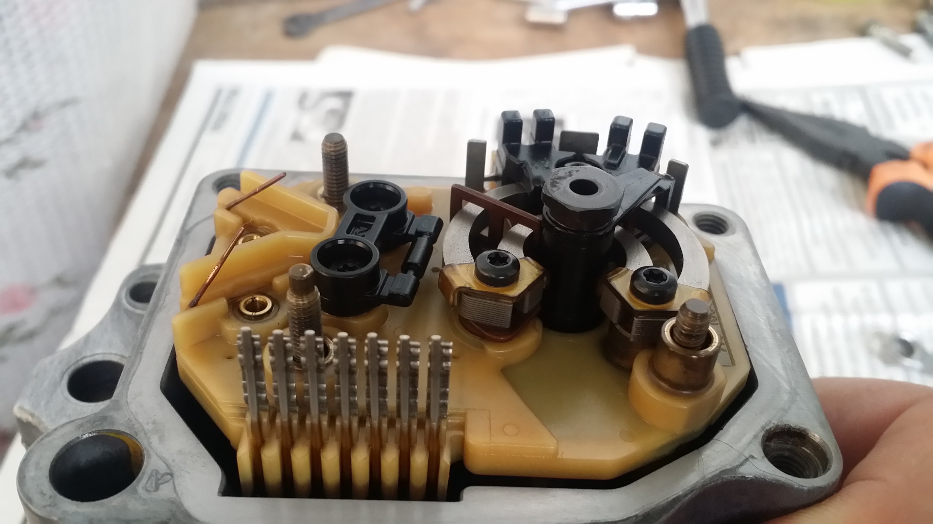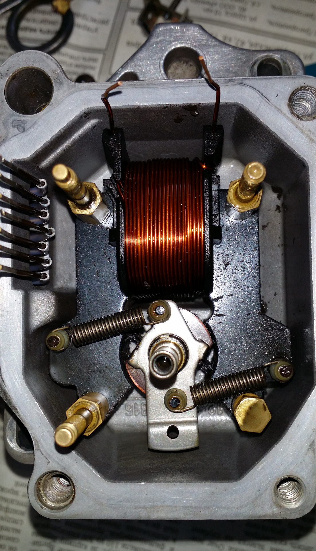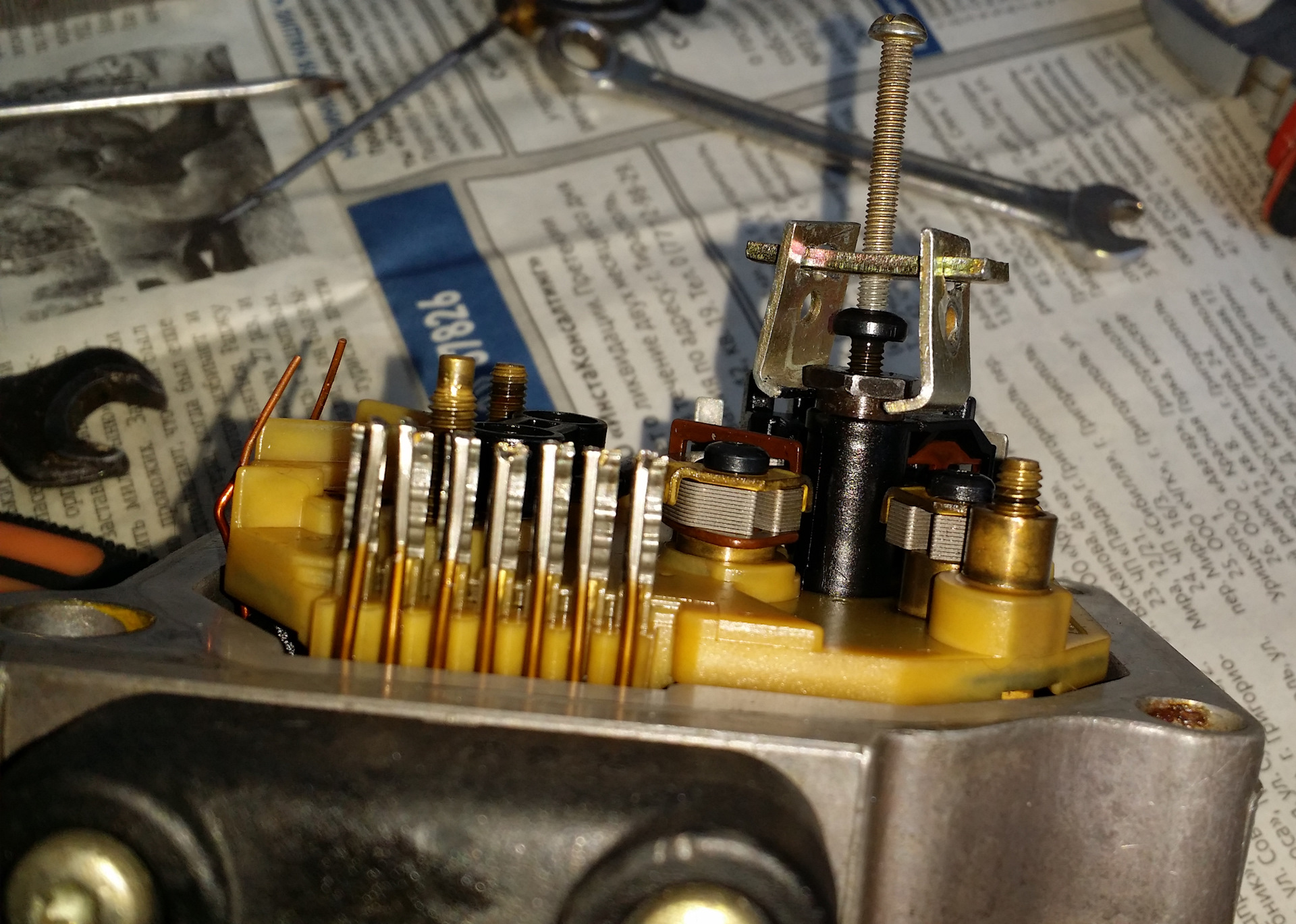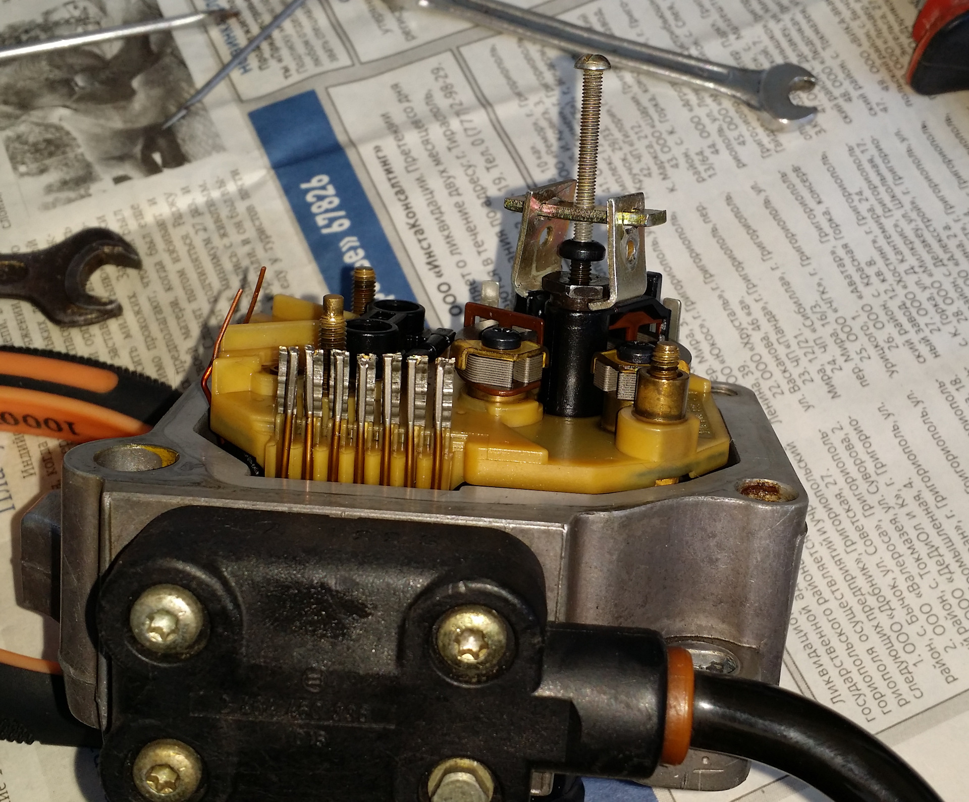После снятия рамки датчика с платой, все осмотрел. Между электромагнитом и подвижной частью множество грязи и металлической стружки. За 20 лет впервые производится чистка не пригодного к ремонту датчика! Все отмыв и отчистив, собираю в обратной последовательности. Контакты хорошенько пропаял, рамку датчика не затягивал контрящим винтом. Это делал после установки в авто и регулировки напряжения рамки. Аккуратно установил голову ТНВД и отрегулировал подачу. Установил новые прокладки из ремкомплекта.