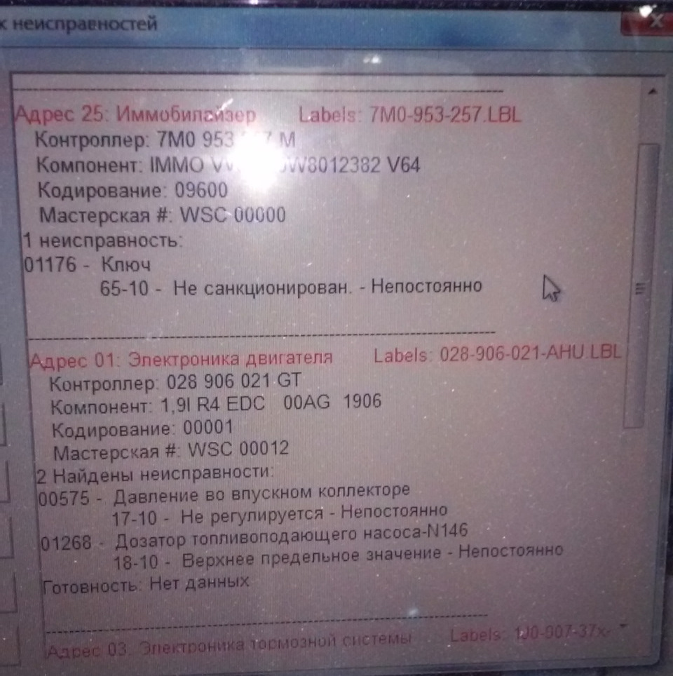 Восстановив нерабочий шнур (VAG-com) я принялся читать ошибки с блока управления! Конечно записал значение напряжения на индуктивном датчике, на этой машине (0,680V) и значение подачи топлива (5,4-5,8).