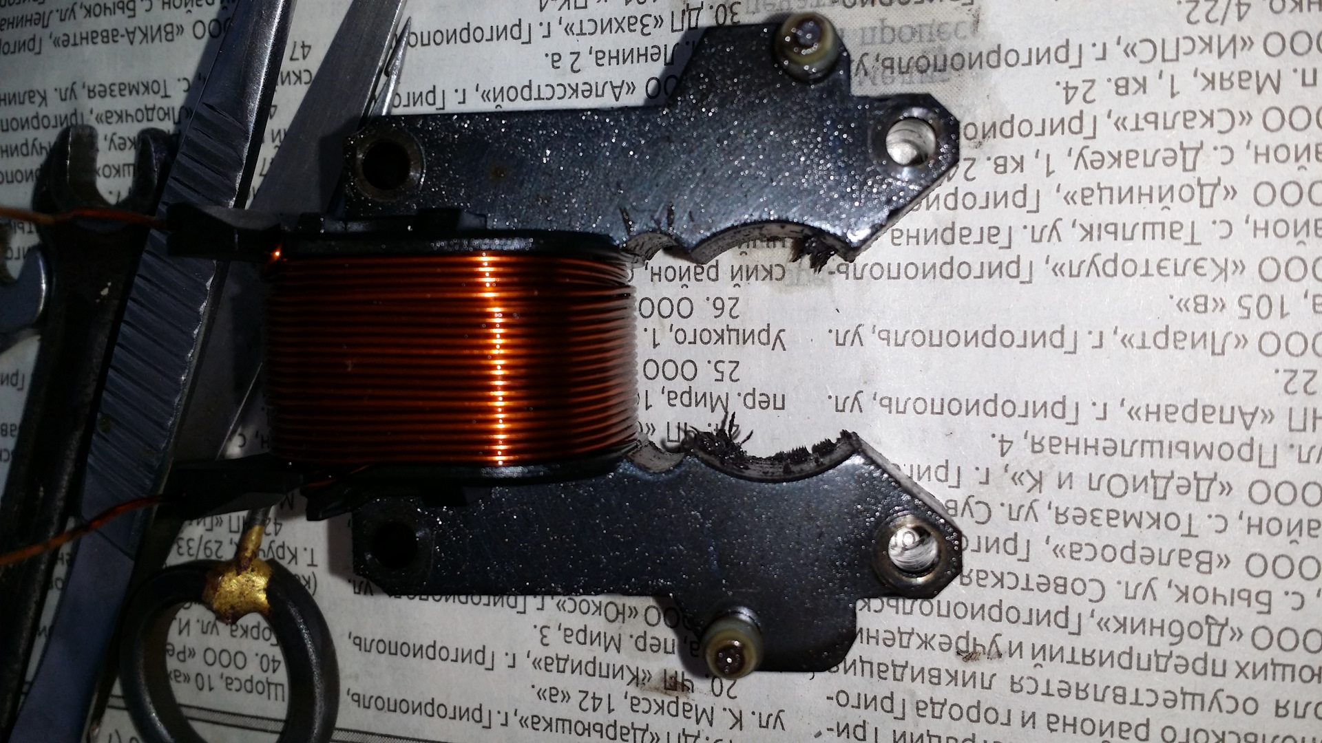 Начиная разборку, запоминал и фоткал как и в каком положении всё установлено. Открутил пару винтов (с левой резьбой) прижимающих контакты катушки электромагнита (э/м). Открутил винт индуктивного датчика, но снять подвижную часть так и не получилось! Для снятия подвижной части рамки, был придуман на скорую руку съёмник. Без этой штуки, снять рамку не сломав, просто не получится! Про снятие этой рамки толком нигде, ничего не сказано! Может кому пригодится!