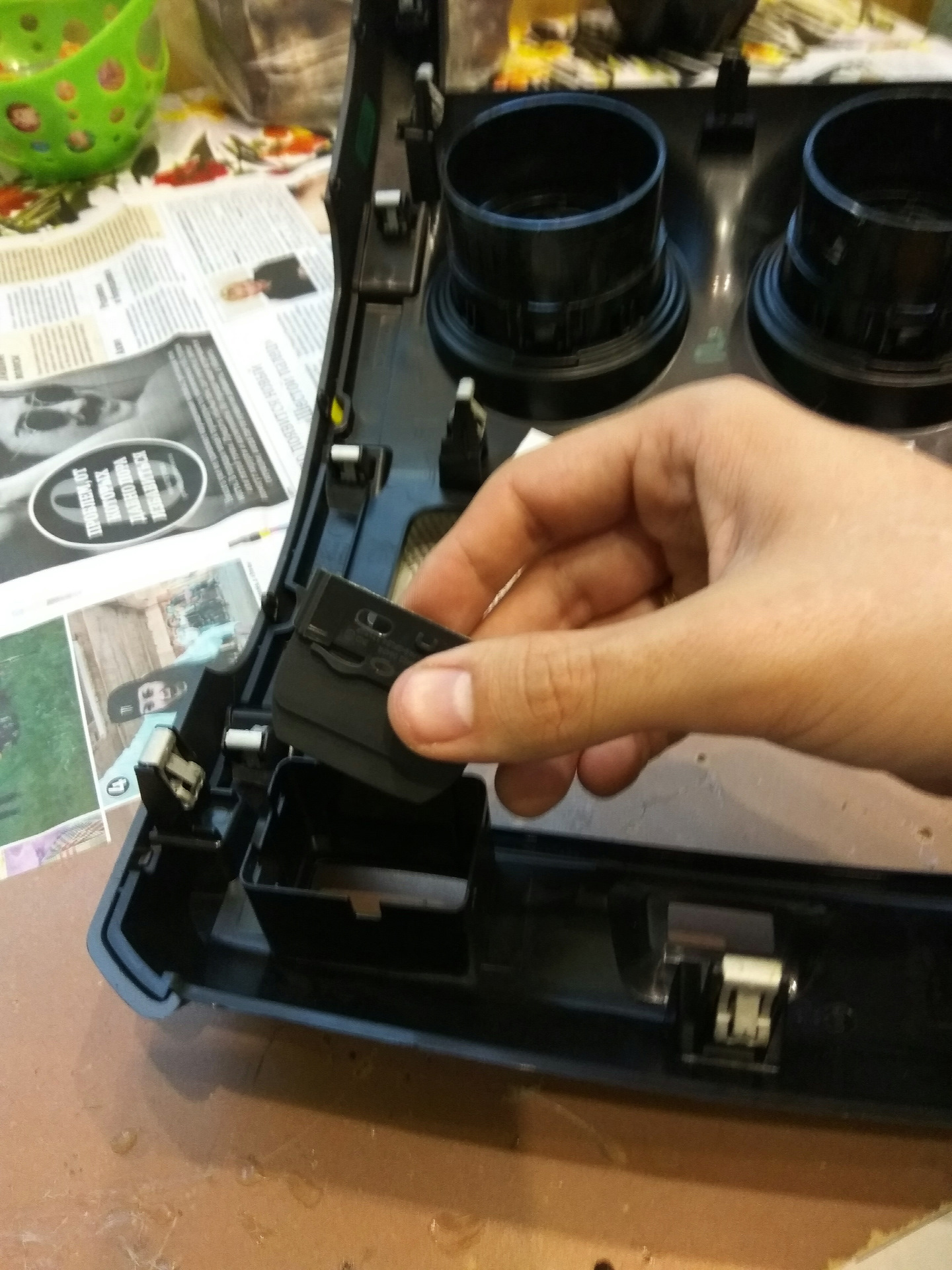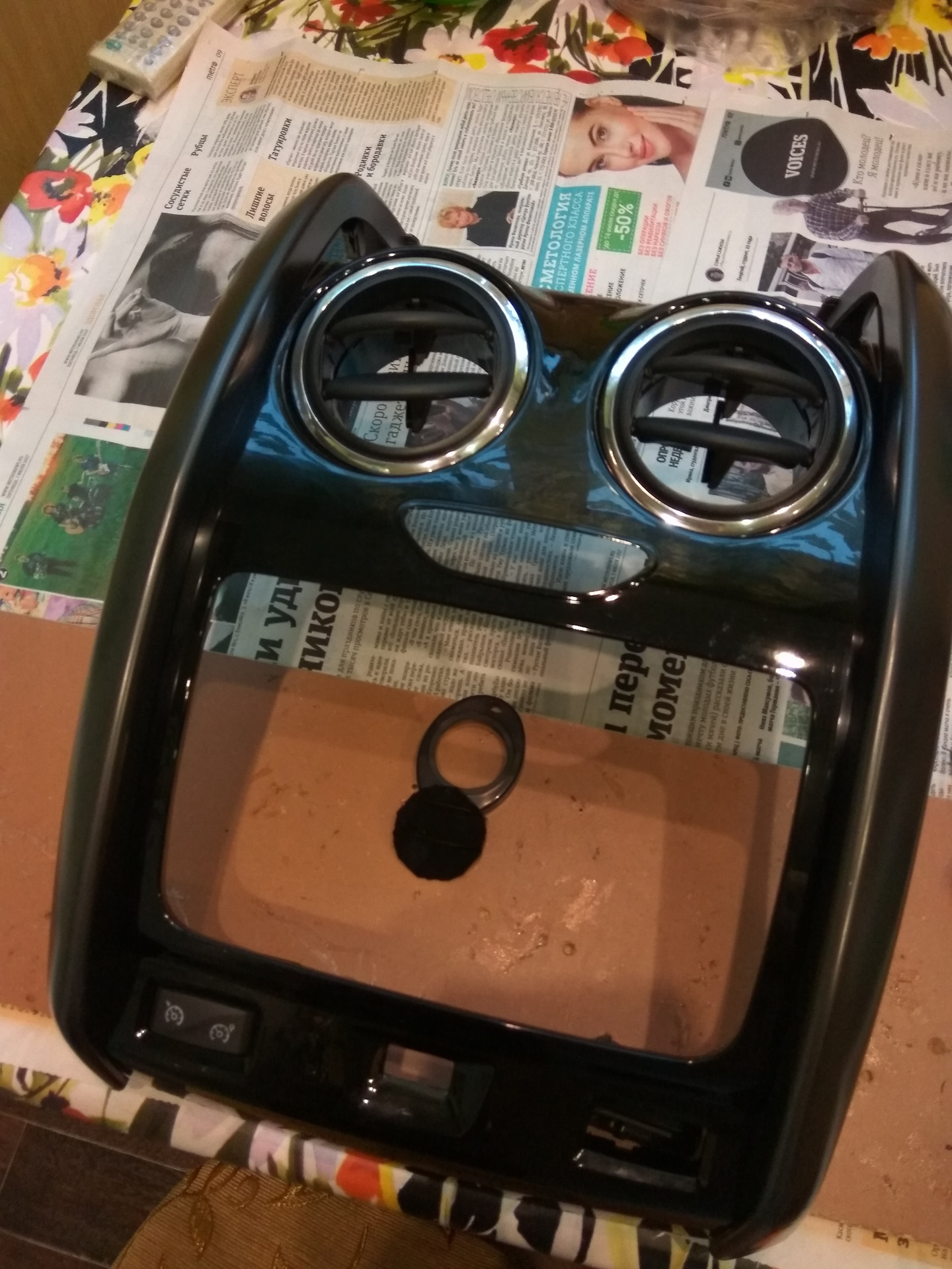Как известно рестайленговый Дастер обделён таким необходимым показателем как температура охлаждающей жидкости. Кто то скажет да зачем он нужен, но для меня эти показания очень нужные. На просторах драйва заметил очень интересный прибор а именно "Цифровой индикатор температуры двигателя от "Эланд" Долго не думая решил приобрести данный девайс. Ну вот он у меня и в руках. Осталось только установить, но вот куда озадачился вопросом. Подумав поразмышляв решил его внедрить вместо заглушки кнопки парктроника которого у меня нет. Процесс пошел, снимаем окуратно накладку.Посадочное место кнопки заглушки срезаем дремелем. Разбираем сам датчик температуры и проклеиваем термо пистолетом контакты проводов, так как все как говориться держится на честном слове) Примеряем стекло в отверстие кнопки заглушки (чуть хватило) сажаем его на клей. Далее примеряем дисплей датчика и так же фиксируем его термо пистолетом. Осталось провести провод и подключить его к ОБД разъёму. Ставим накладку на место и наслаждаемся результатом. Получилось очень даже ничего, можно сказать как с завода))) Теперь все под контролем) Спасибо за внимание, всем удачи!