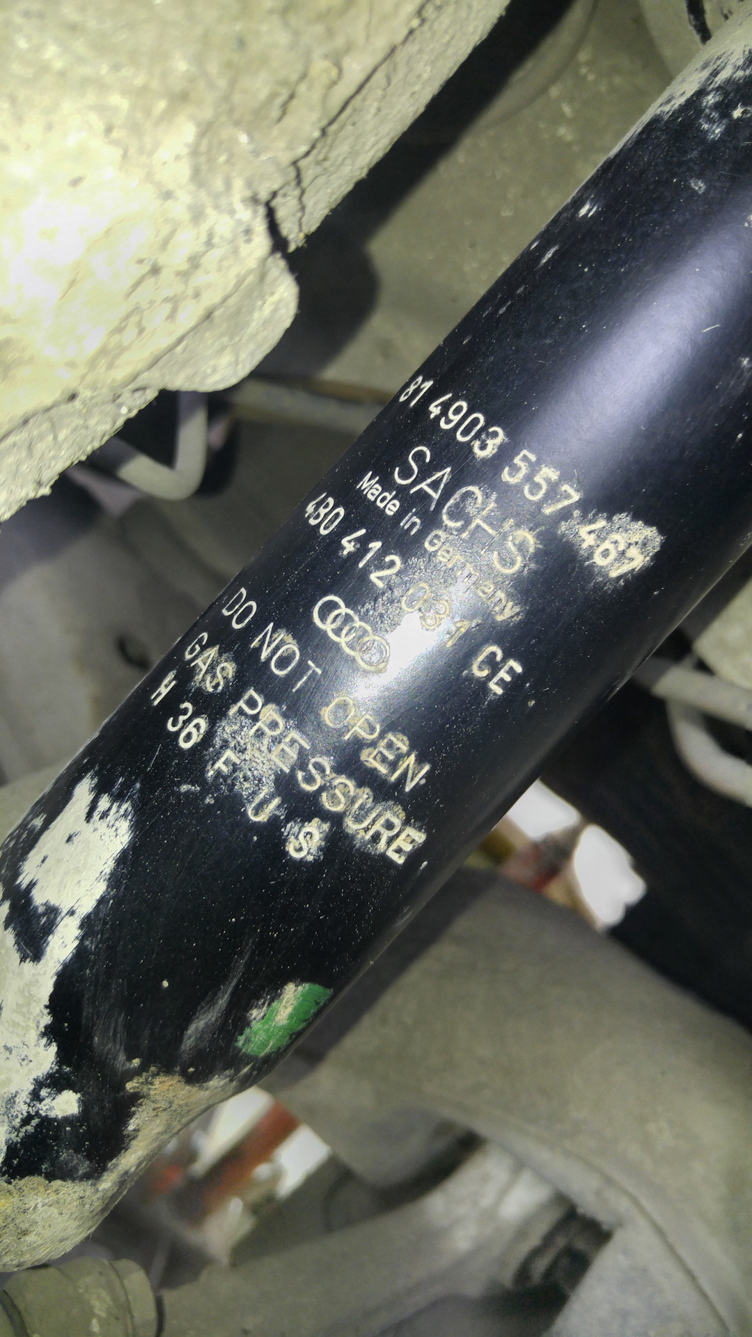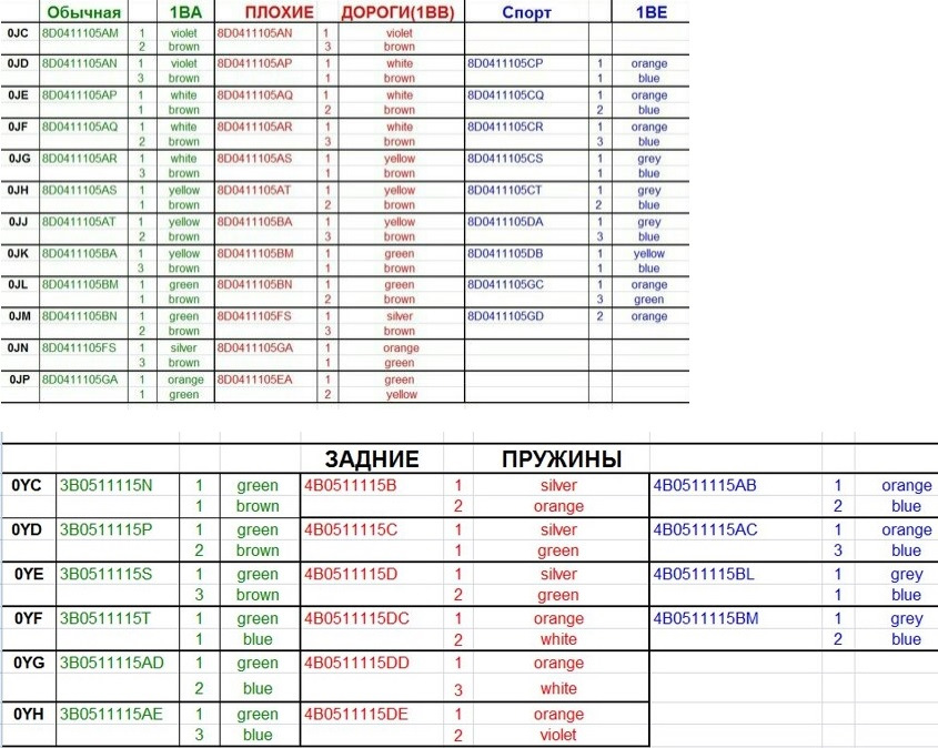 Сейчас у меня стоят пружины: оригинальные — с точно такого-же автомобиля, но c 1be типом подвески, а именно: 3 blue, 1 orange — задние пружины, что соответствует — 0yd с номером 4b0511115ac, а передние пружины — 1 blue, 1 orange, что соответствует 0jd с номером 8d0411105cp.