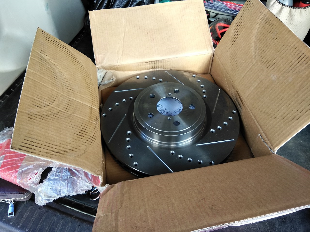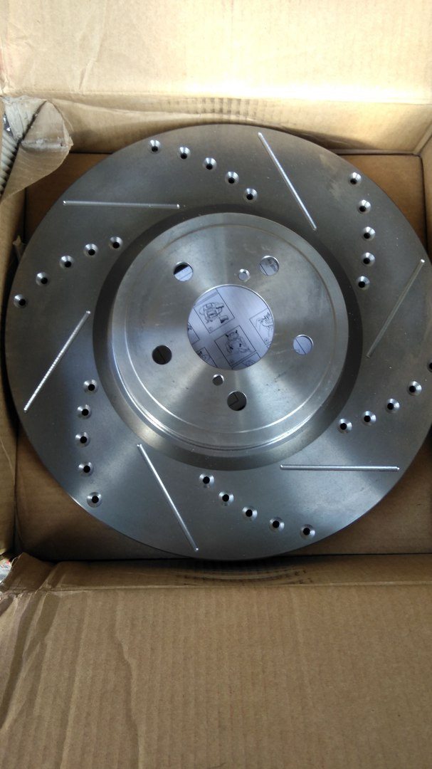 Субарь мне достался на больших суппортах от трибеки с колодками ендлесс, и работа тормозной системы меня вполне устраивала, но т.к. диски уже начали подходить, и машина в сервисе, решено было привести все в состояние нового. Нашел тему на сти клубе, про диски брембо на которые парни на ЧПУ наносят перфорацию и насечки, связался позадавал вопросы и решил заказать.