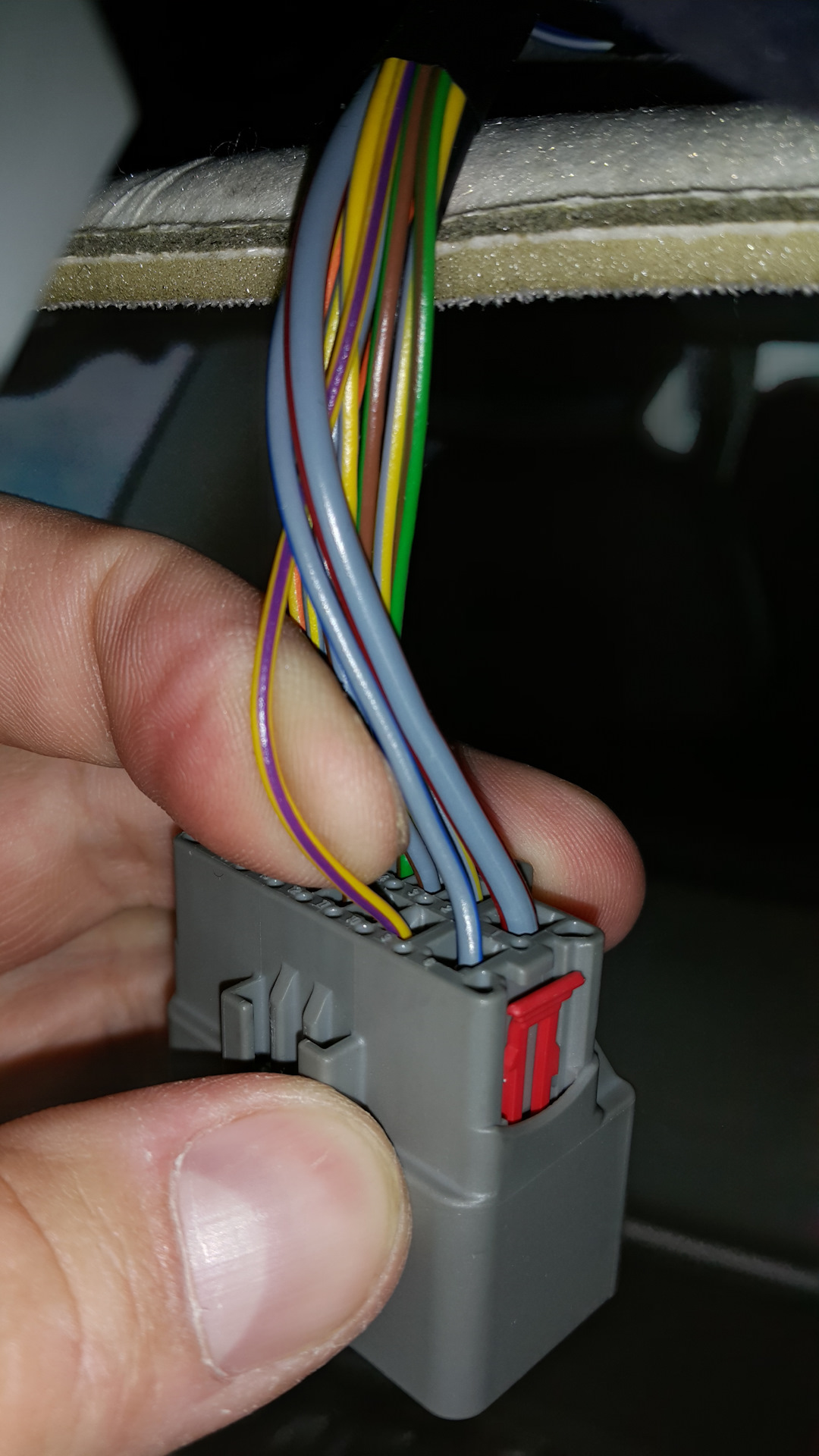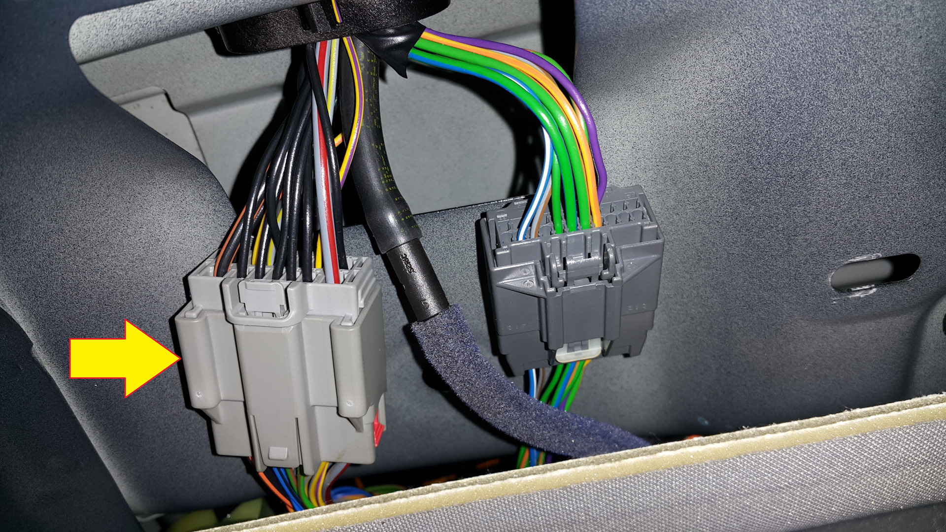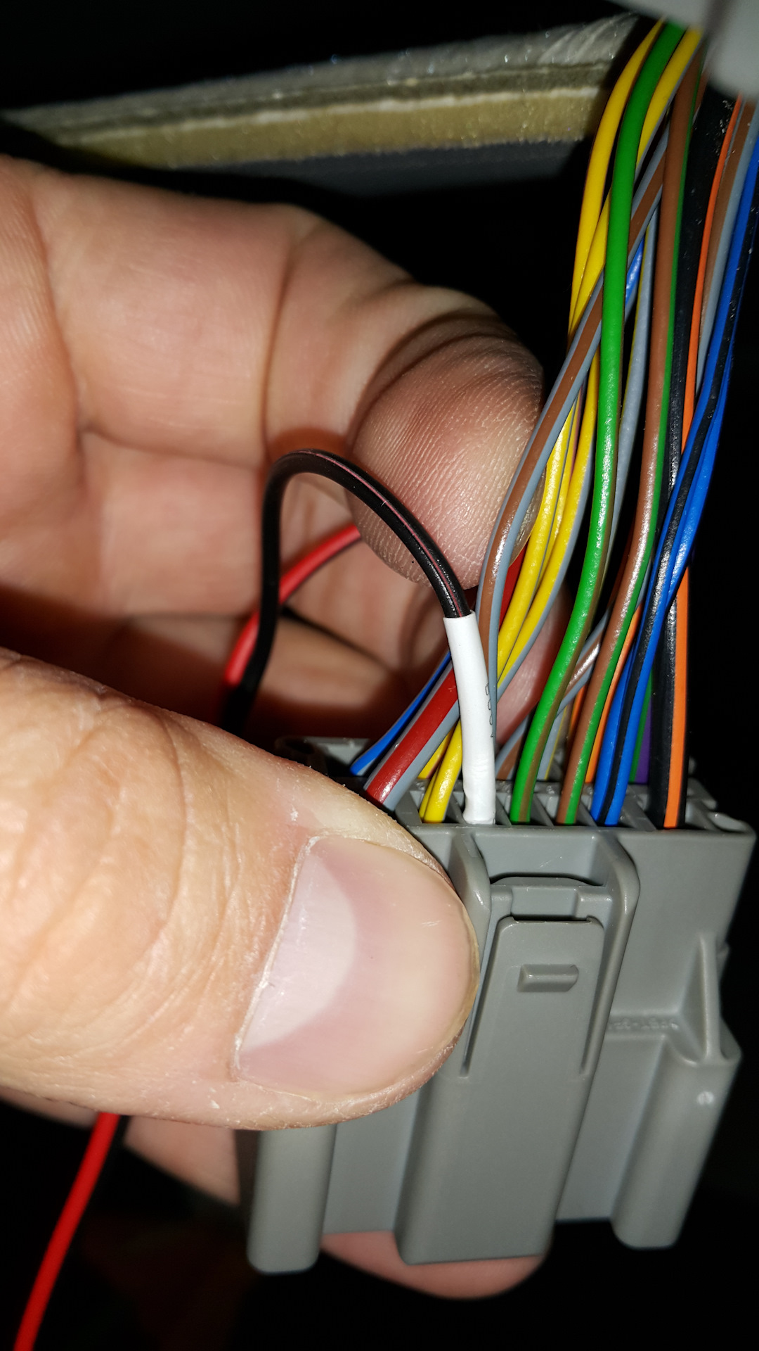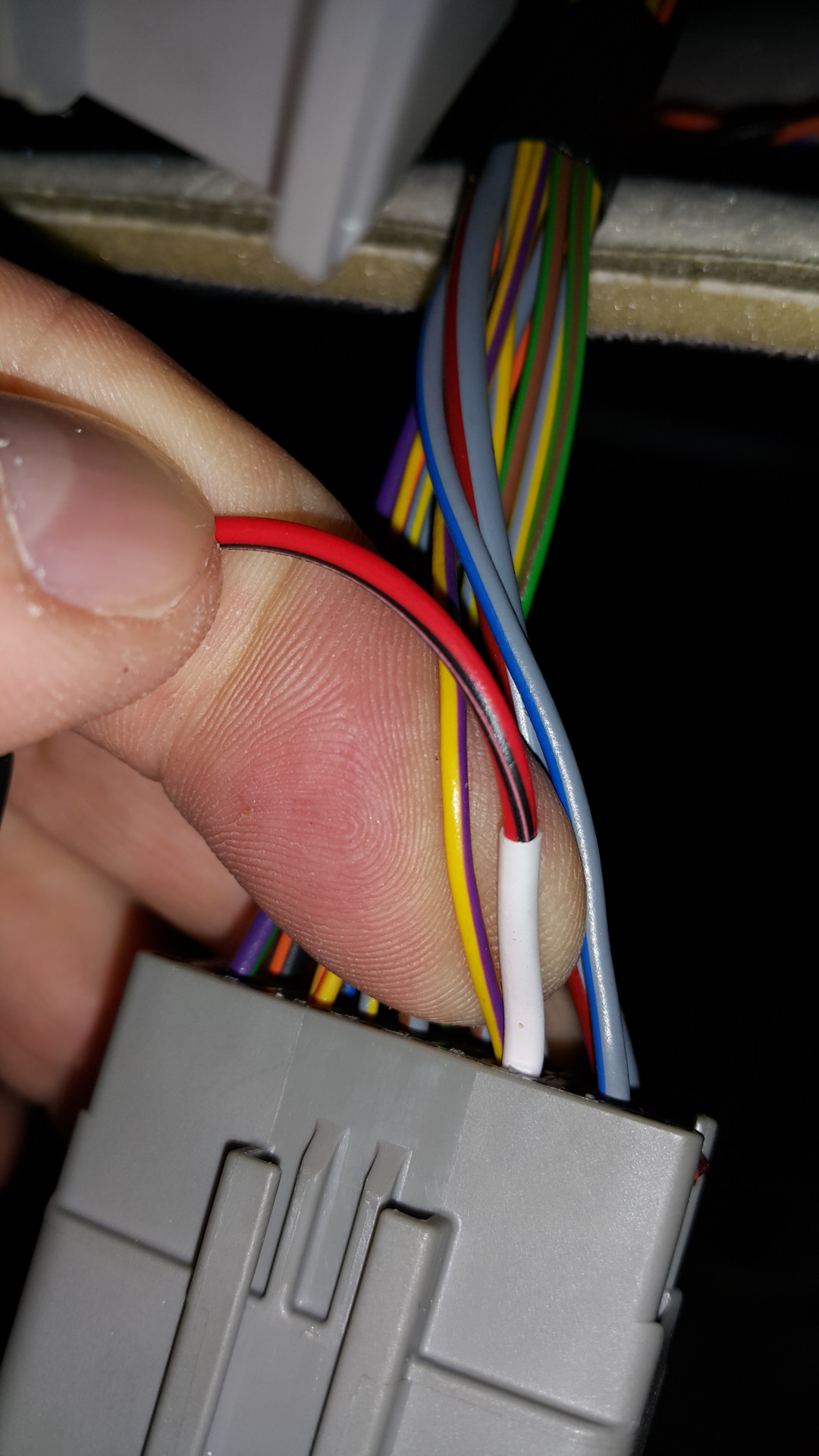 Теперь в пучке проводов отыскиваем ТОНКИЙ жёлто-фиолетовый провод.