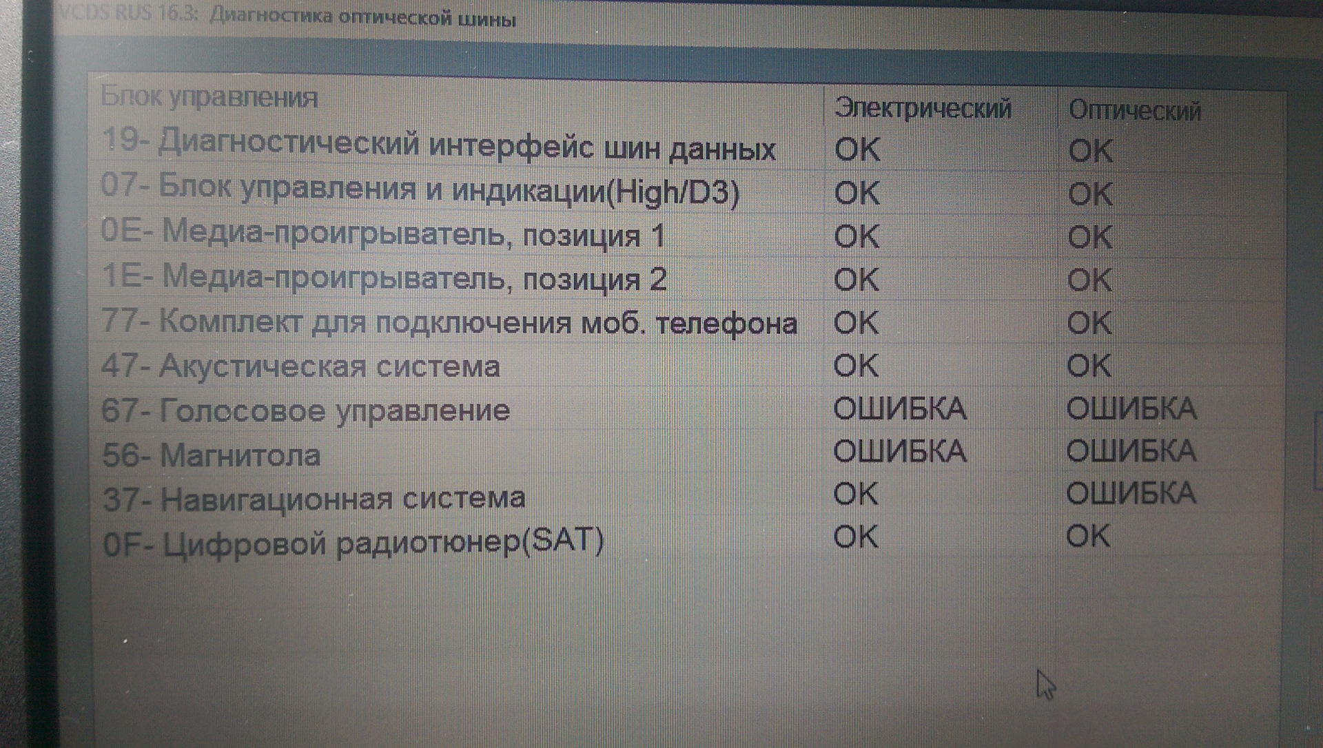 Однажды еду я по городу, поворачиваю на крутом повороте направо вниз и тут зависает музыка, а через несколько секунд тухнет дисплей MMI… Доехал до места назначения, попробовал перезагрузить MMI клавишами SETAP+центральная на джойстике+правую верхнюю клавишу управления возле джойстика. Экран заставки при этом загорелся и через секунду снова потух. На нажатия клавиш на центральной консоли ответа нет, звука нет, ничего не меняется… Тут я опечалился и пошел за "Васей"… Подключаю, читаю блоки и вижу, что все висящие на оптической шине данных (блок MMI, медиа, аккустика, блютуз и т.д.) не читаются. По 19му блоку — гетвей, он же диагностический интерфейс шин данных, через который они все связаны, бьется вот такая ошибка: