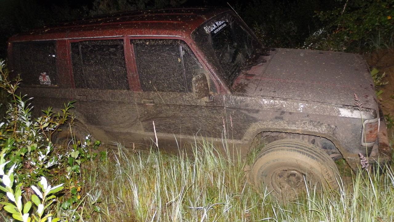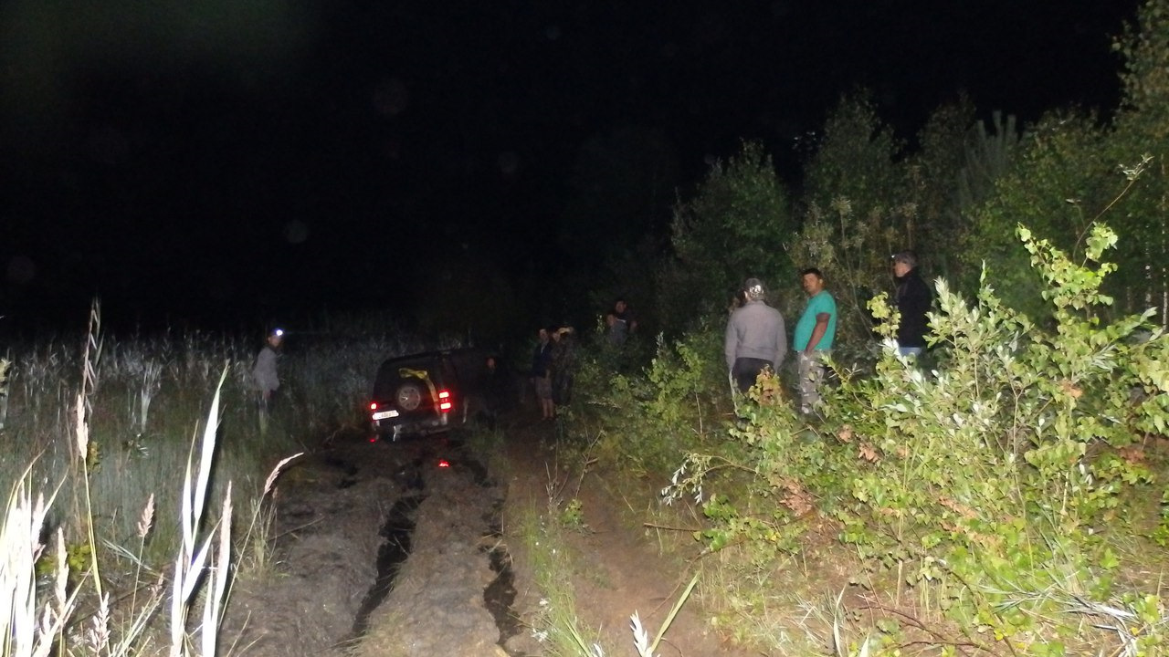 Несмотря на наступившую темноту, операция по спасению Чероки успешно завершилась. Однако покинуть злополучное болото оказалось не так просто. Было принято решение использовать следующую тактику: Pajero I, как наиболее легкий автомобиль, должен первым делом взяться за водную преграду и закрепиться на «берегу», после чего, с помощью тросика, вы тащите за собой Cherokee. Pajero II, в свою очередь, должен был обеспечить буксировку Cherokee до начала сложного участка.