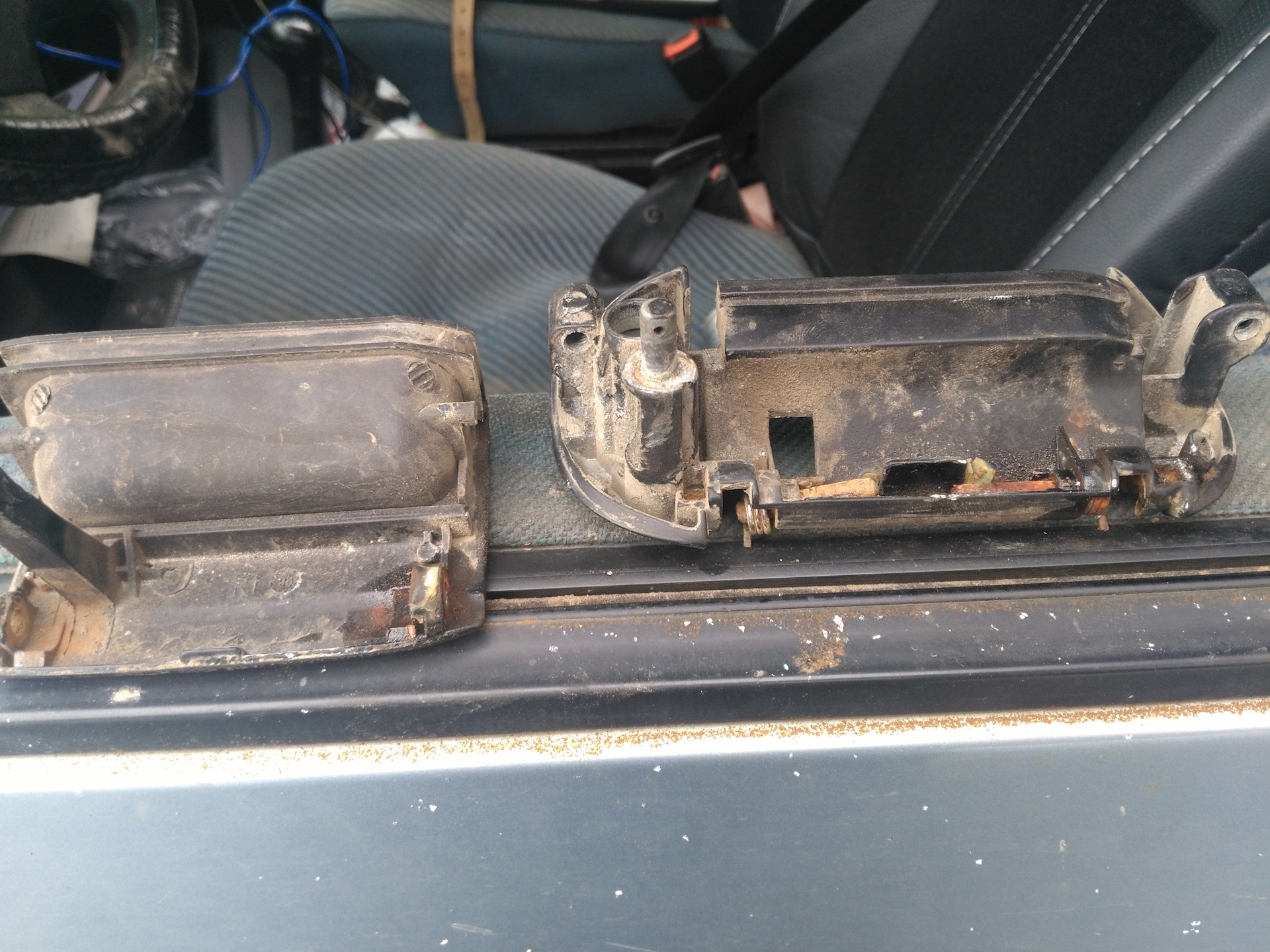 Если вдруг у вас сломалась ручка и вы не хотите попасть на 6500 рублей а именно столько стоит ручка наружная и идет она только в оригинале. Вам нужно купить правую наружную ручку переднего пассажира вытащить среднюю подвижную часть старой сломанной. И поставить туда среднюю часть новой. Цена вопроса 800 рублей
