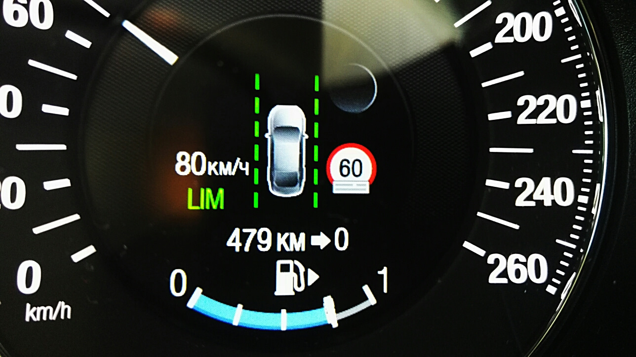 Позже добавлю видео работы удержания в полосе, так как реально прикольно она это делает. Когда машина уезжает с полосы ( если разметка есть=)), то руль плавненько тянет машину назад, пока разметка на приборке снова не станет зеленой.