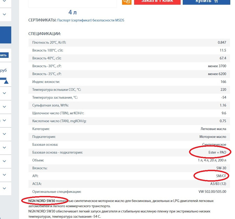 Да и поводом к замене послужило то, что после длительного изучения одного известного интернет-ресурса по маслам, я решил скорее залить масло NGN Nord 5W-30 A3/B3/B4, API SN. Масло изготовлено в Нидерландах, завод Eurol. Понравились характеристики масла, состав (ПАО и эстеры), много отзывов по нему, цена конечно не самая низкая, но с другой стороны аналоги, со схожими характеристиками будут стоить ещё дороже. Второй повод, подталкивающий к замене — интерес, как двигатель будет работать на масле с вязкостью 5W-30 летом, а ещё более интересны холодные запуски, зимой. Масло имеет CCS (вязкость имитации холодной прокрутки) при -30 градусов, равное 3400. Просто я никогда не был сторонником масел, жиже чем W40, но интерес возымел верх.