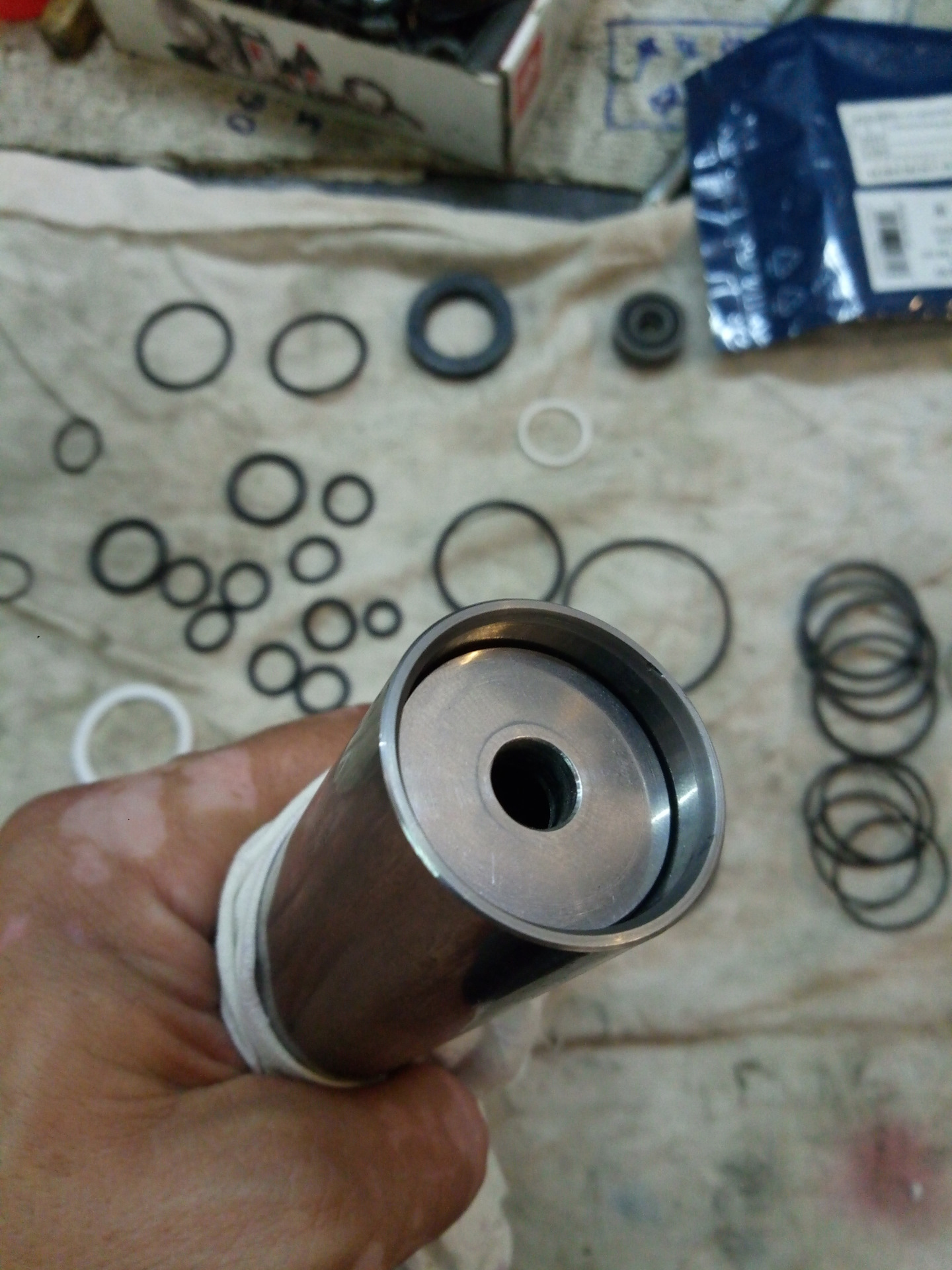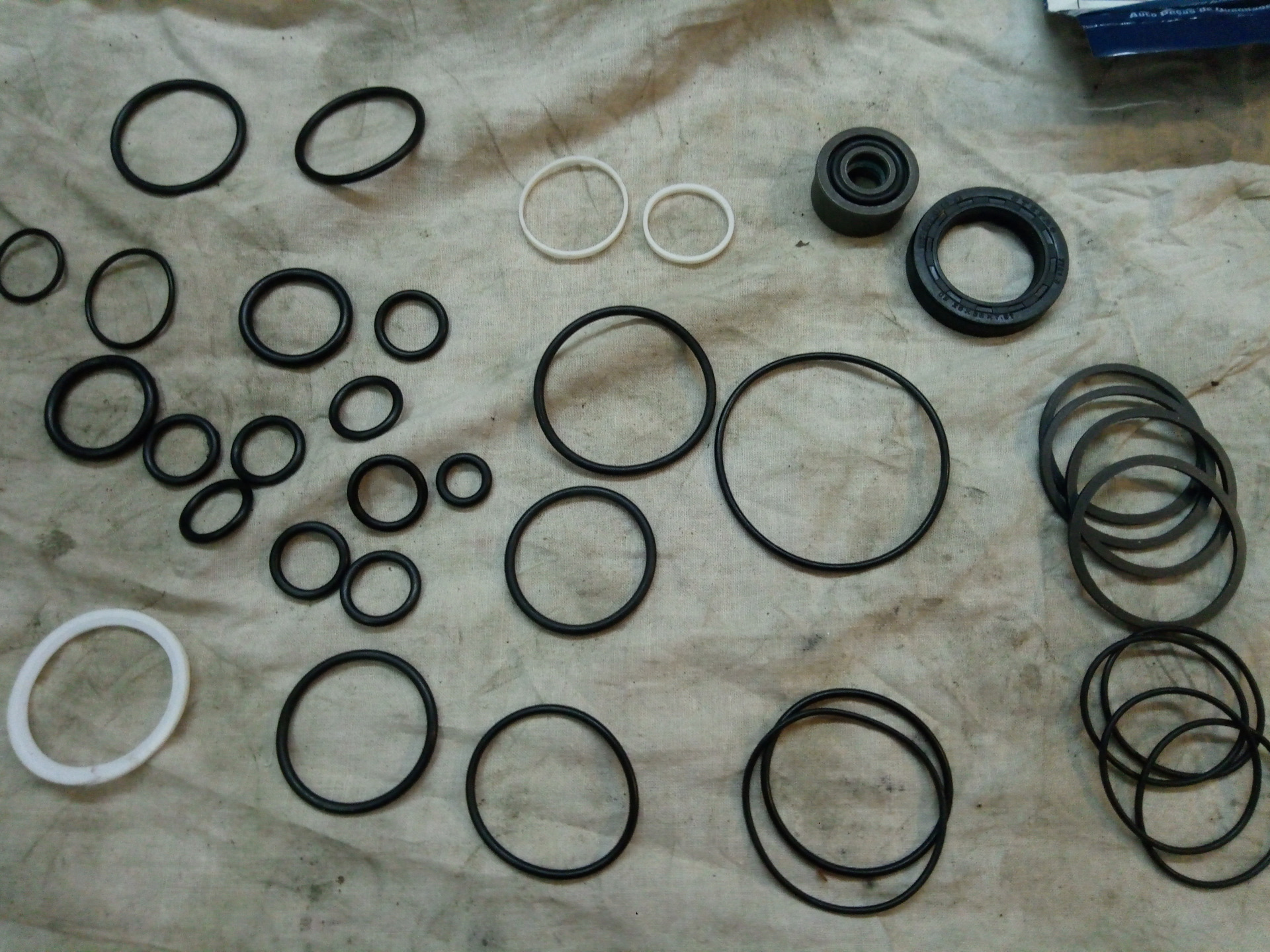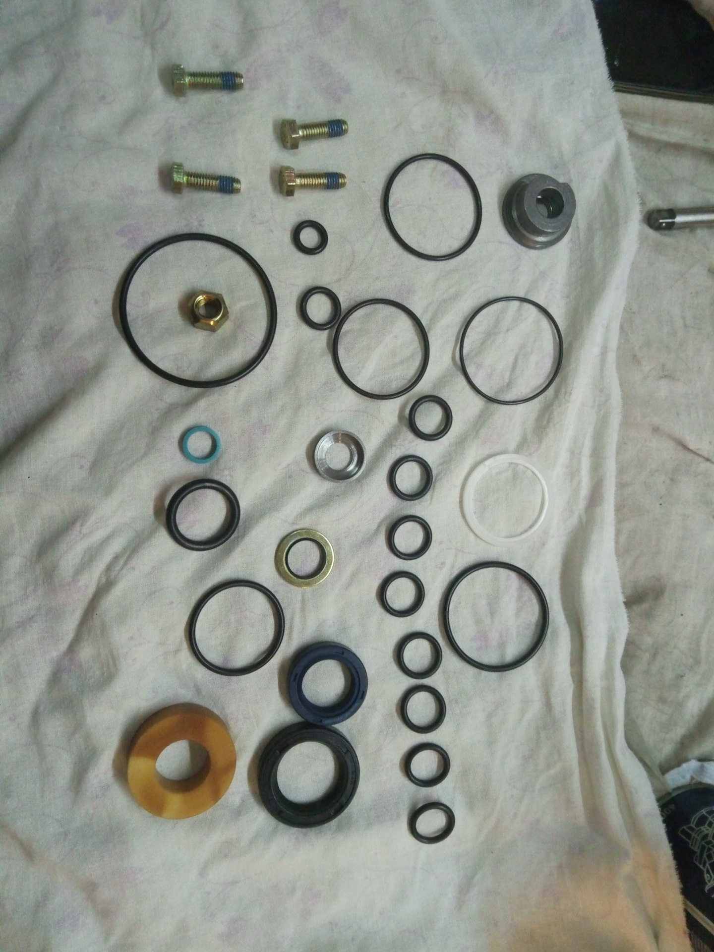 Итак что есть в первом и чего нету. Оба сальника хорошего качества малый и большой. Болтики корпуса с локтайтом и гаечка поршня гидроцилиндра. Колечки уплотнений банджоболтов и колечки уплотнений гидроцилиндра. ПО сути это все что из него надо!