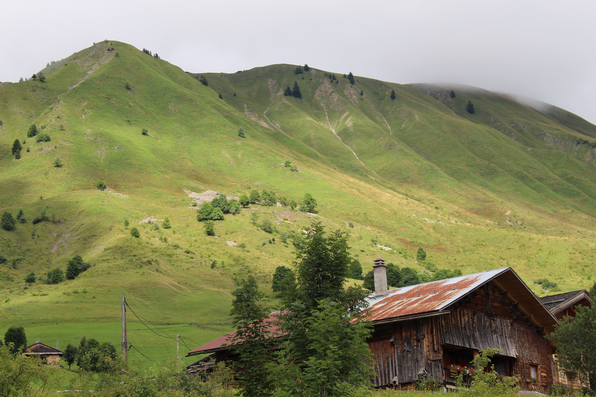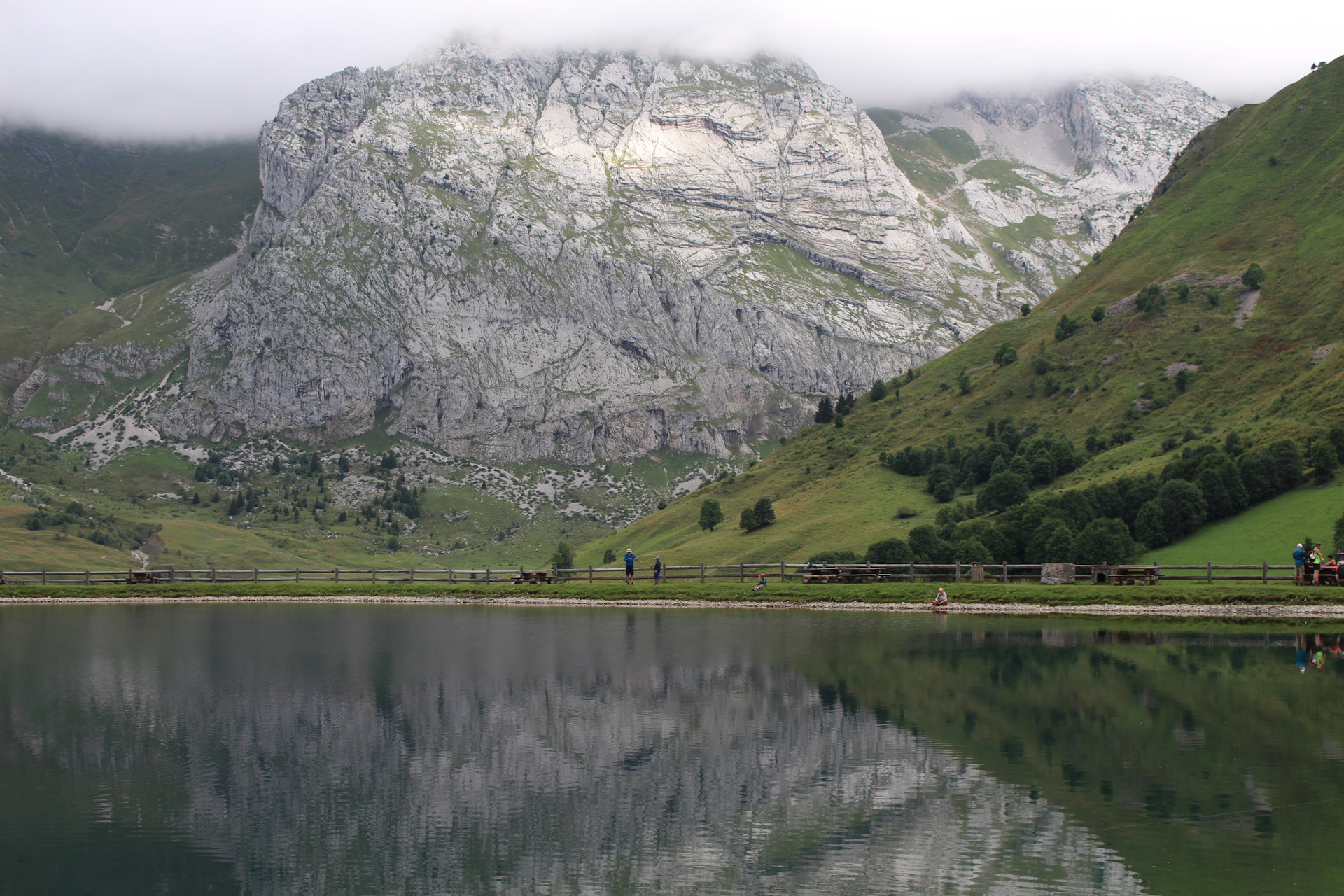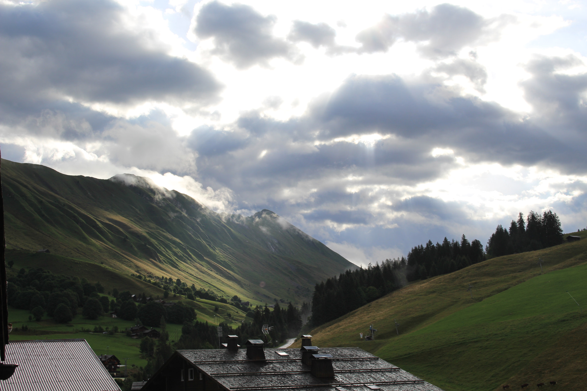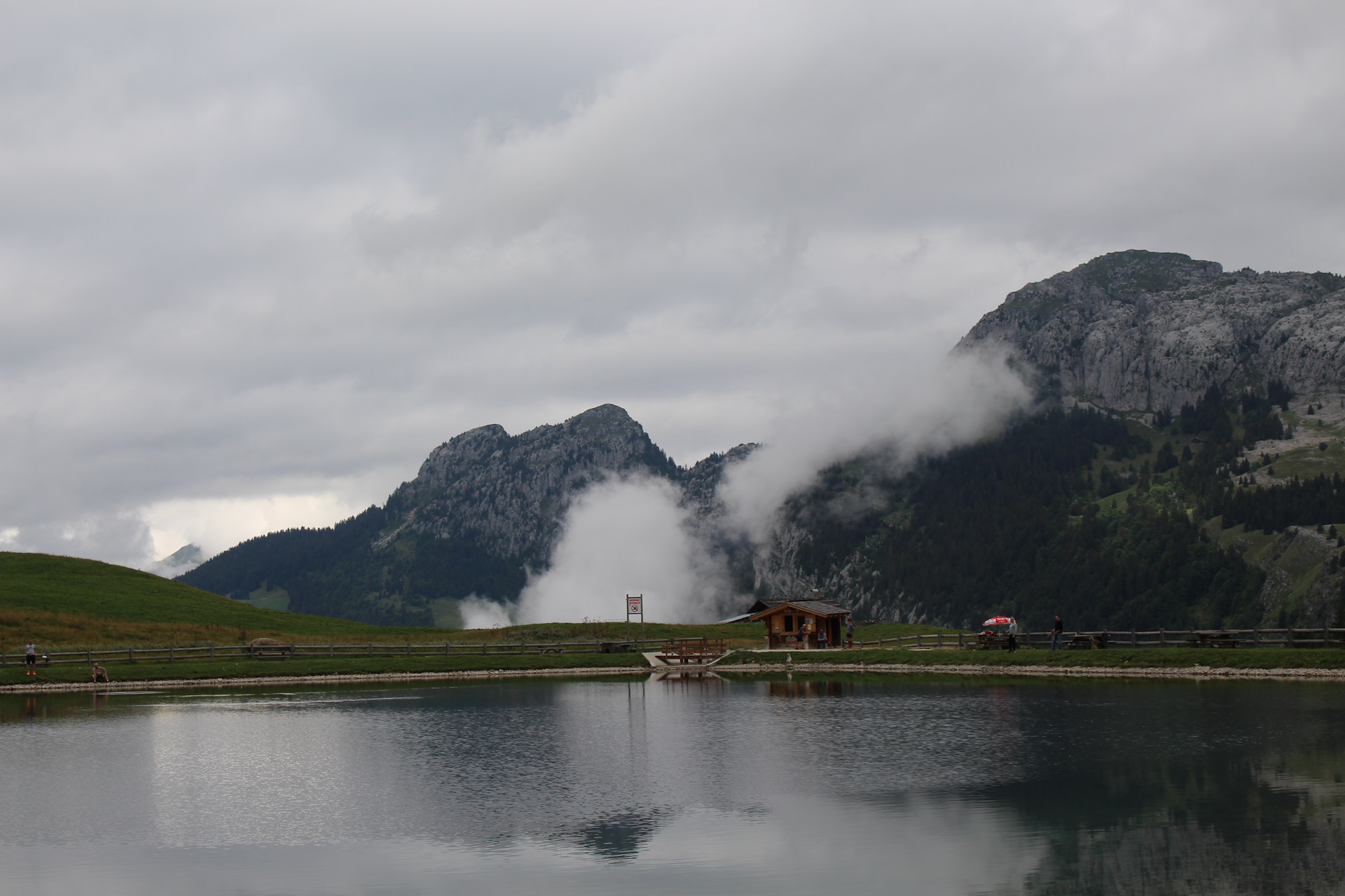 Один из дней был полностью без осадков, и мы, воспользовавшись этим прошлись до горного озера дё ля Кур (Lac de la Cour). Оно находится примерно в трех километрах от отеля на высоте 1450 метров. Погода в горах меняется быстро – это известный факт. Если по пути туда светило солнце и было даже слегка жарко, то на обратной дороге набежали тучи и температура по ощущениям упала градусов на десять. Теплые вещи в горах надо брать обязательно при любых условиях!