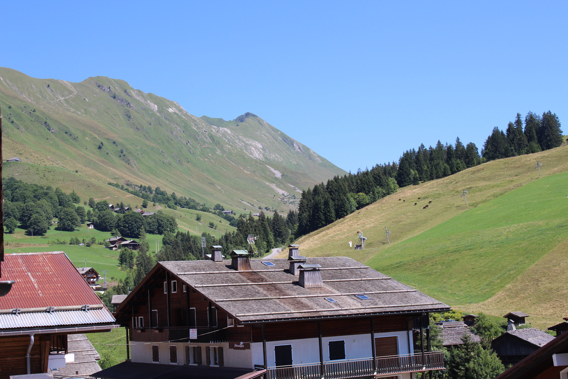 Все номера выходят на общий балкон с видом на горнолыжный склон, в данное время, разумеется, пустующий и пестрящий ярко-зеленой травой.