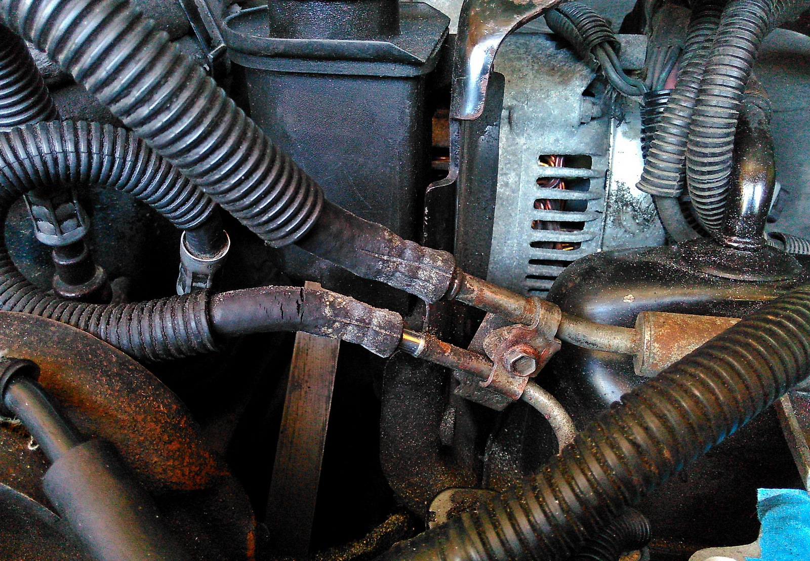 Заодно ещё проверил топливные шланги, им тоже требовалось внимание, под алюминиевой завальцовкой была эрозия шланга и он начал трескаться.