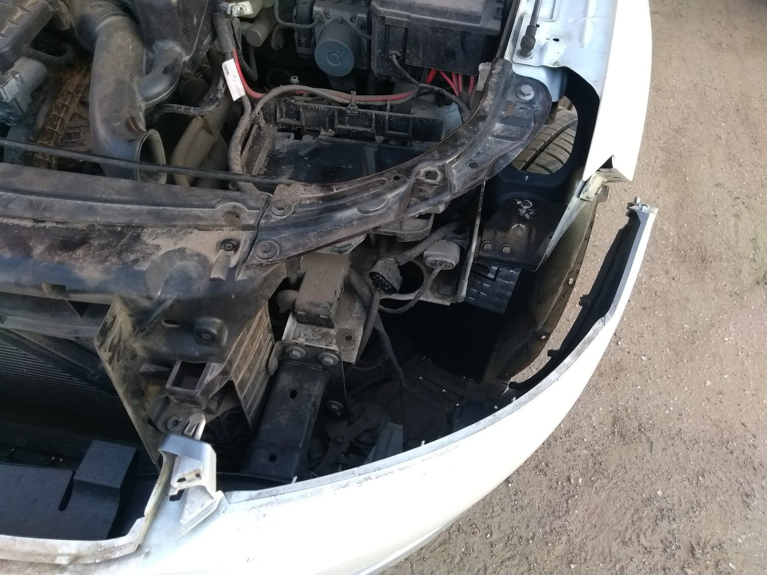 3. Снимаем аккумулятор — будет мешаться. Далее для удобства демонтажа(а для обратного монтажа — обязательно, ибо ксеноновая фара массивнее, и рука не пролезает к креплению) поддомкрачиваем передок почти до отрыва колеса, чтобы максимально подвеска провисла. Снимаем заглушку с локера для удобства. Откручиваем два винта крепления бампера к крылу(КТО БЛИН ПРИДУМАЛ ТАМ ВИНТЫ!). Теперь можно отогнуть бампер для съема фары.