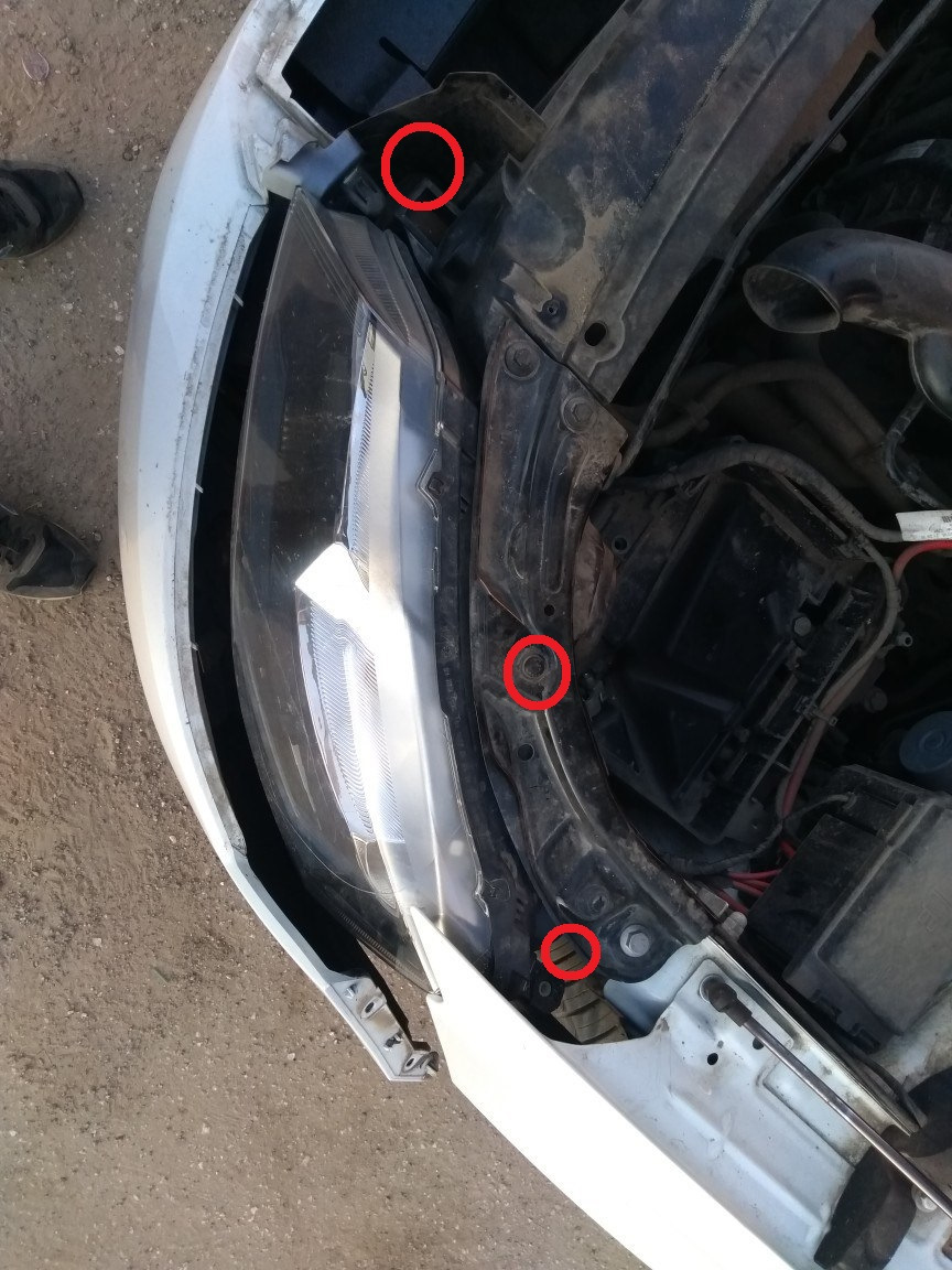 5. Ставим новую фару, наживляем болты. Выставляя зазор между крылом и фарой, затягиваем.