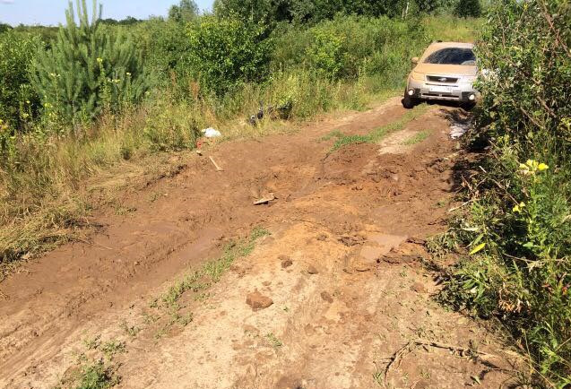Середина широкая плоская, справа трава, как могло стащить, не очень понятно. Видимо не там поехал, да и судя по машине закопался после этого.
