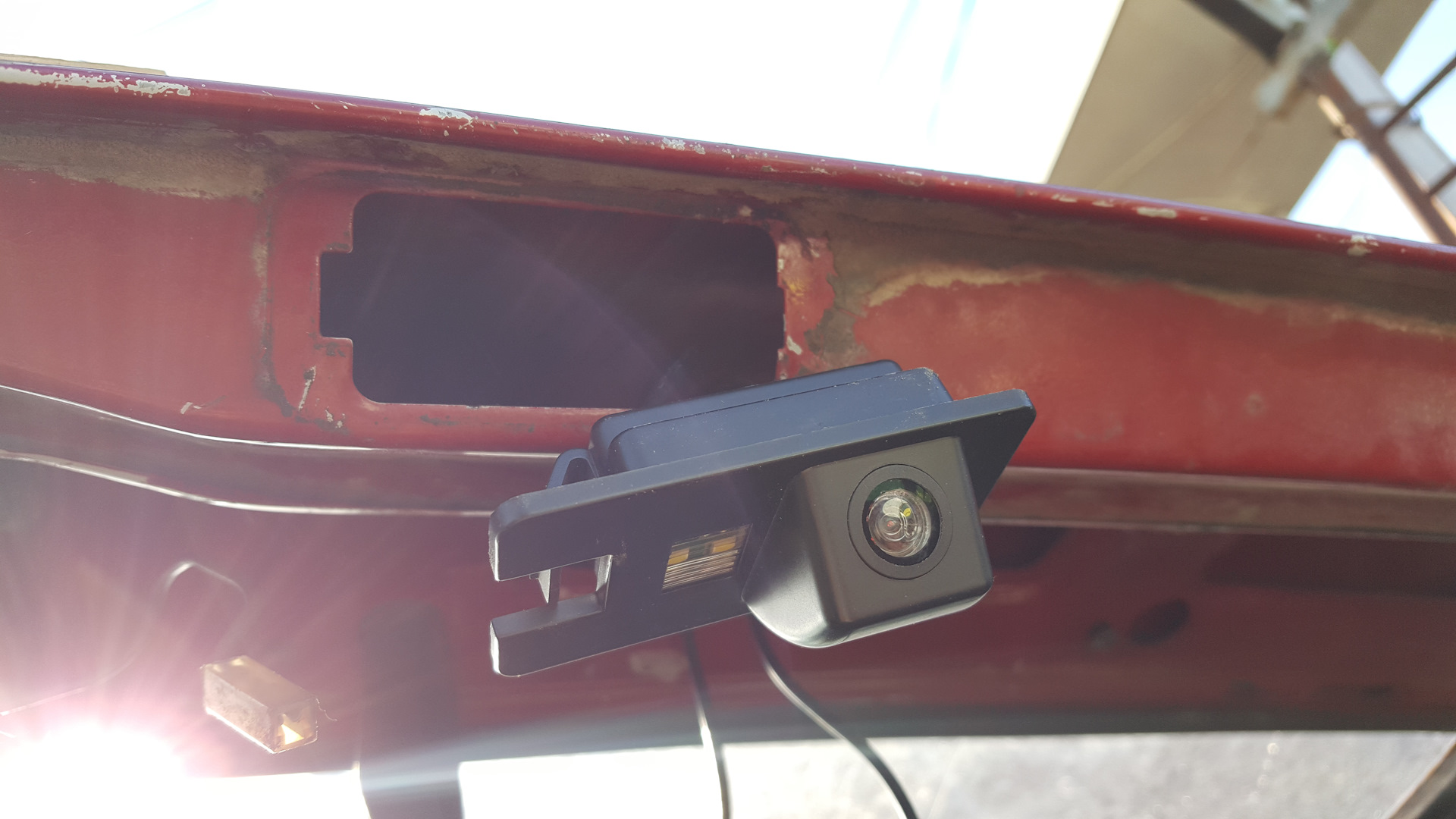 Чтобы не вырезать на козырьке полукруг под глазок (что выдаст зевакам наличие камеры), придётся напаивать на гнездо всякие проставки, чтоб чуток понизить камеру (это ещё сильнее выдвинет бампер в кадр, поэтому придётся поиграться с углом наклона, либо не закрывать до конца багажник :-) ).