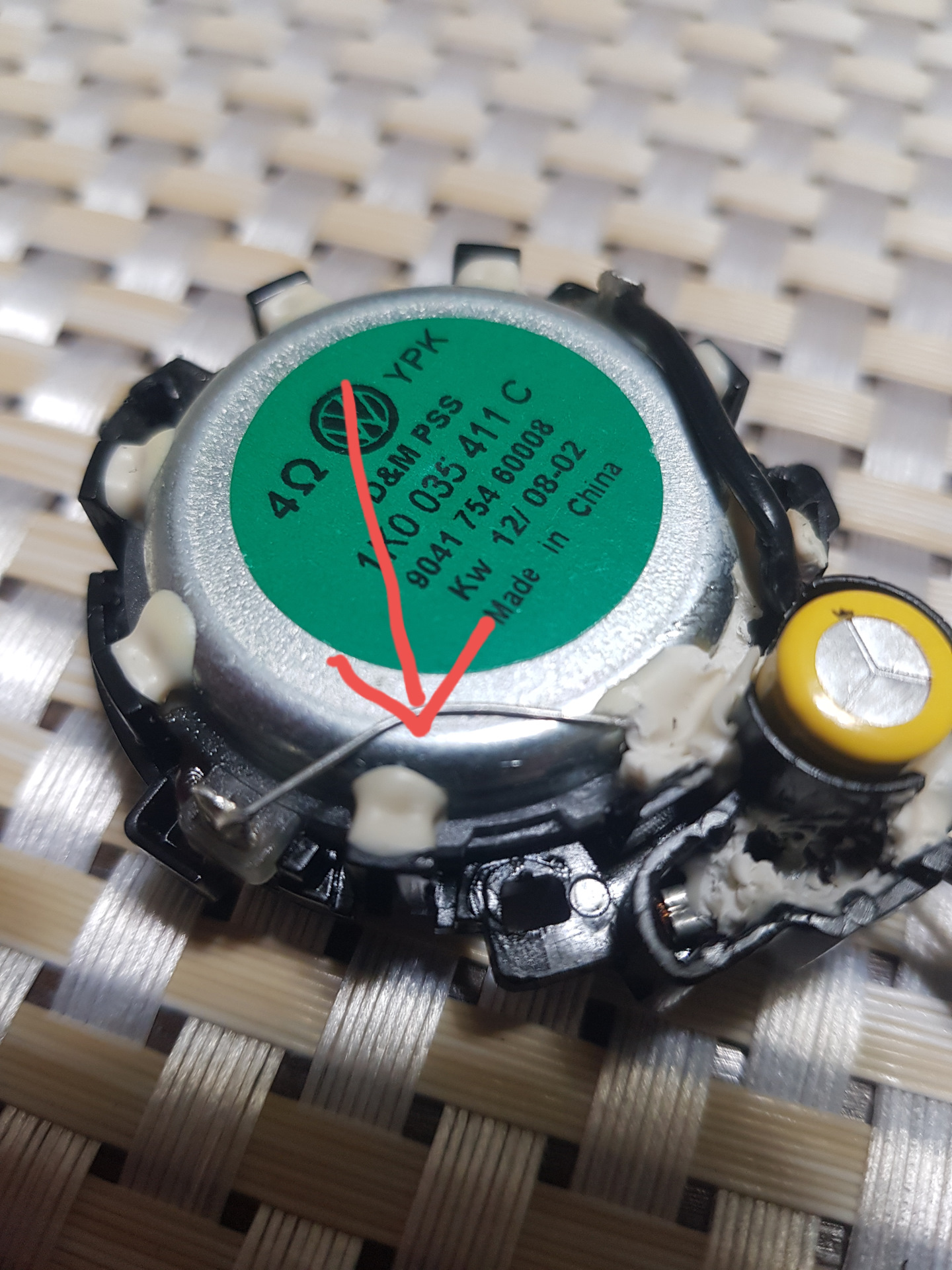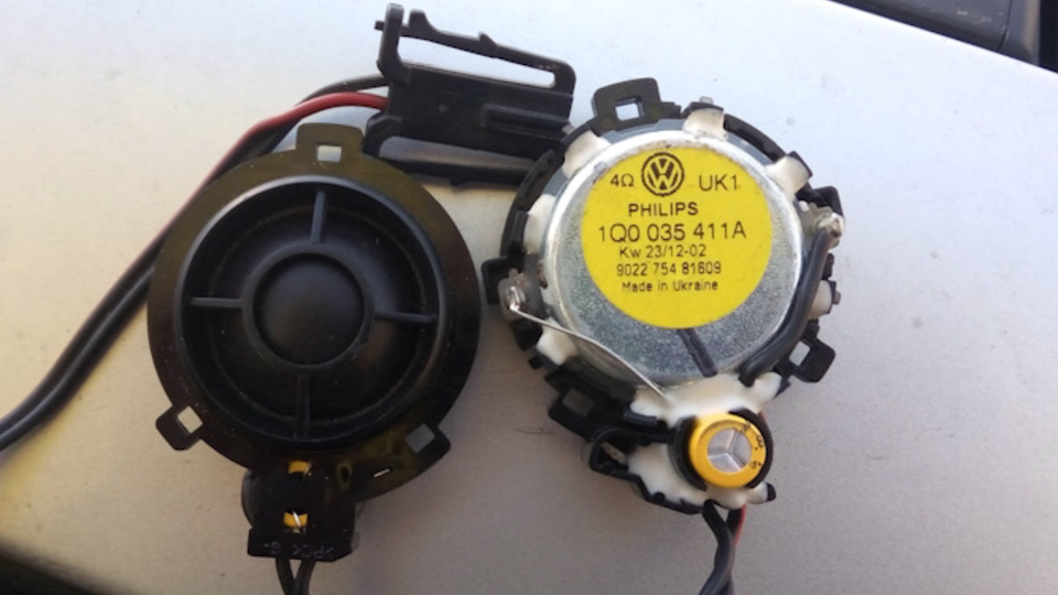 Проверить полярность штатных твитеров VW: 2 KD 035 411 можно при помощи пальчиковой батарейки — видно куда двигается купол, можно и от плоской 3В CR2032.