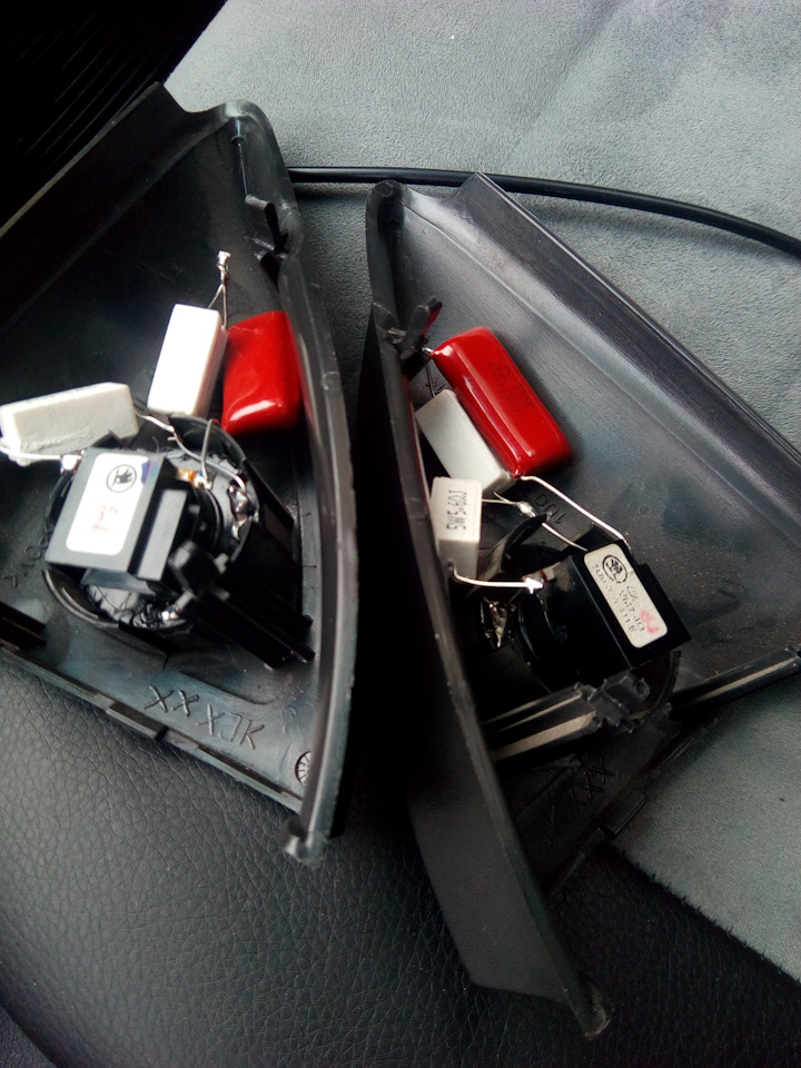 Там стоят электролитические конденсаторы на 6,8 мкФ и на 4 Ом твитер — это ФВЧ 1-го порядка с частотой среза 5,8 кГц (по уровню -3 дБ). Это оптимально, но нужно пригасить уровень твитеров на -3 дБ относительно мидов в дверях для правильного тонального баланса.