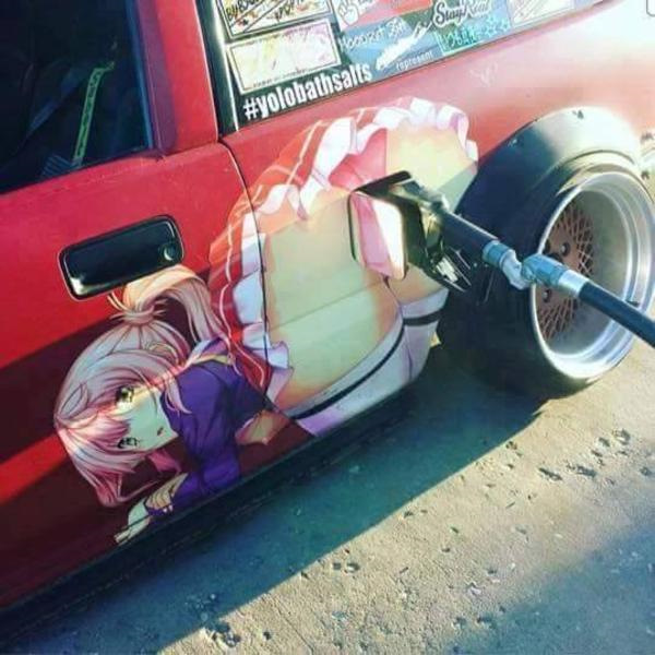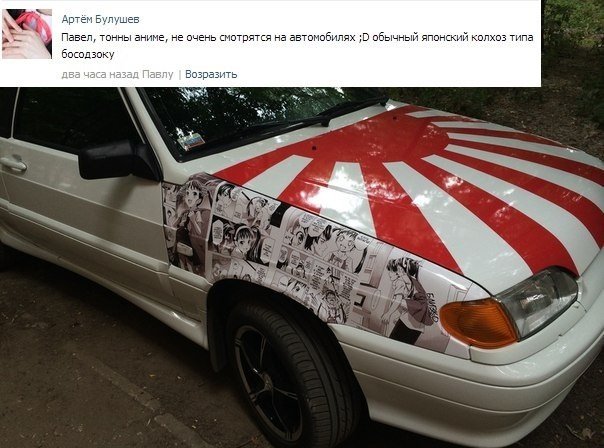 Колян посмотрел пару картинок в интернете, а потом написал в яндексе ГОЛЫЕ ДЕВКИ ИЗ АНИМЕ СКАЧАТЬ после чего в куче хентая выбрал одну из картинок и понес ее на флешке в ближайшее рекламное агентство. Там покрутили пальцем у виска типа, «каких-то Сейлормун печатают, совсем обалдели!» и объявили Коле цену. Она оказалось такой огромной, что вместо всего борта, как изначально планировалось, винил распечатали только на дверь. Причем квадратом. Зачем парится и вырезать?
