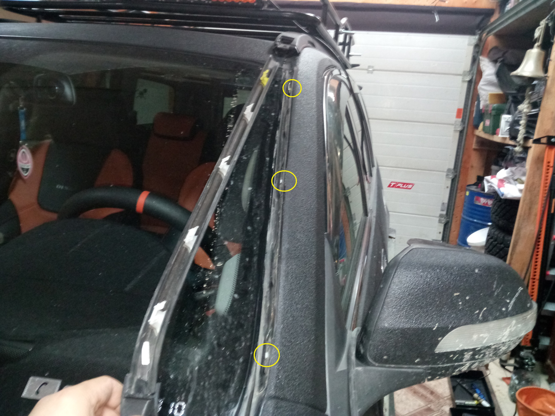 Не знаю каким образом, но мне удалось протянуть по этой стороне лобового стекла кабель от антенны без снятия пластиковой накладки. На другой стороне при прокладке кабеля от люстры пришлось снимать. Клипсы поломал, посадил их точками на герметик.