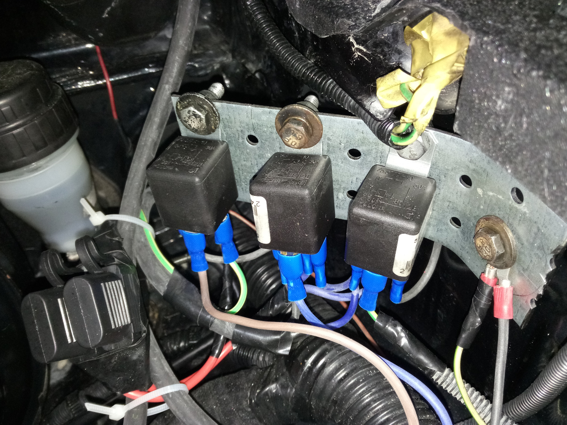 Из монтажной пластины валявшейся у меня в гараже, под капотом авто электрик смастерил такую панель с массой, куда разместил купленные нами три реле два из которых на балку и одно на мини балку над гос номером так сказать разгрузить наши кнопки, два предохранителя, и завел провода в салон через резинку которая возле бочка сцепления.