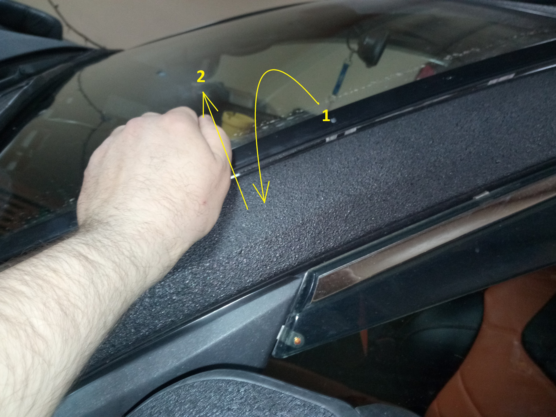 Вот такими движениями я снял боковую планку лобового стекла.
