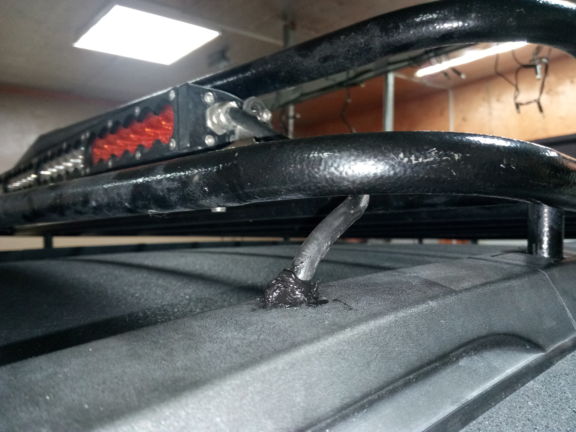 Чтобы загнать провод под металл леера, было решено просверлить дырку тут в пластике на 12, и в железе на 10, толщина трехжильного провода в оплетке 9, но ему еще там сгибаться!