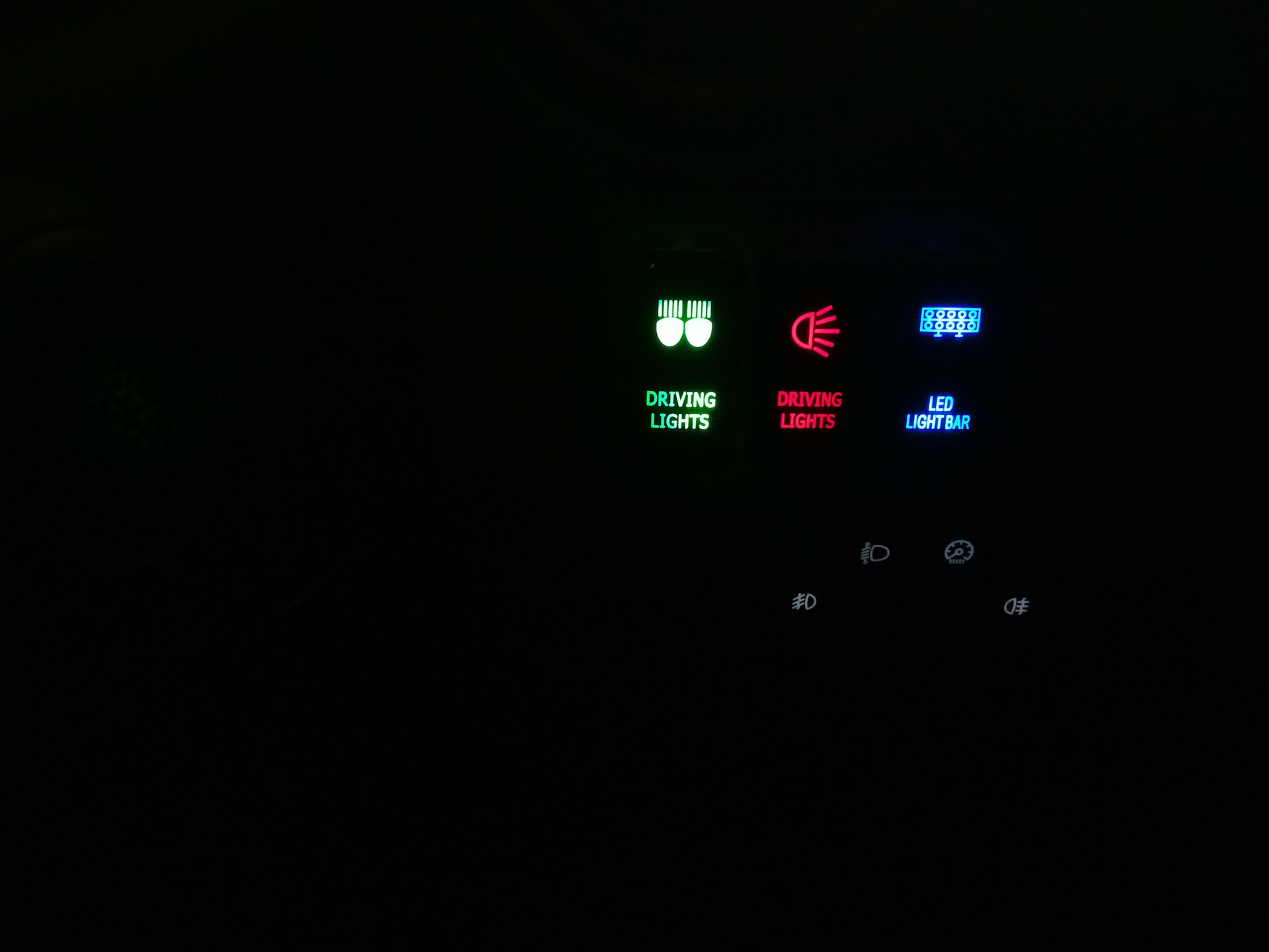 Первая кнопка на моей панели врубает Мини LED LIGHT BAR над гос номером, и так как я её обтянул желтым винилом свети она слегка зеленцой и кнопка под её стать! Вторая кнопка для боковых желтых огней на LED LIGHT BAR на крыше, ну и третья это центр LED LIGHT BAR на крыше. Все в унисон получилось!