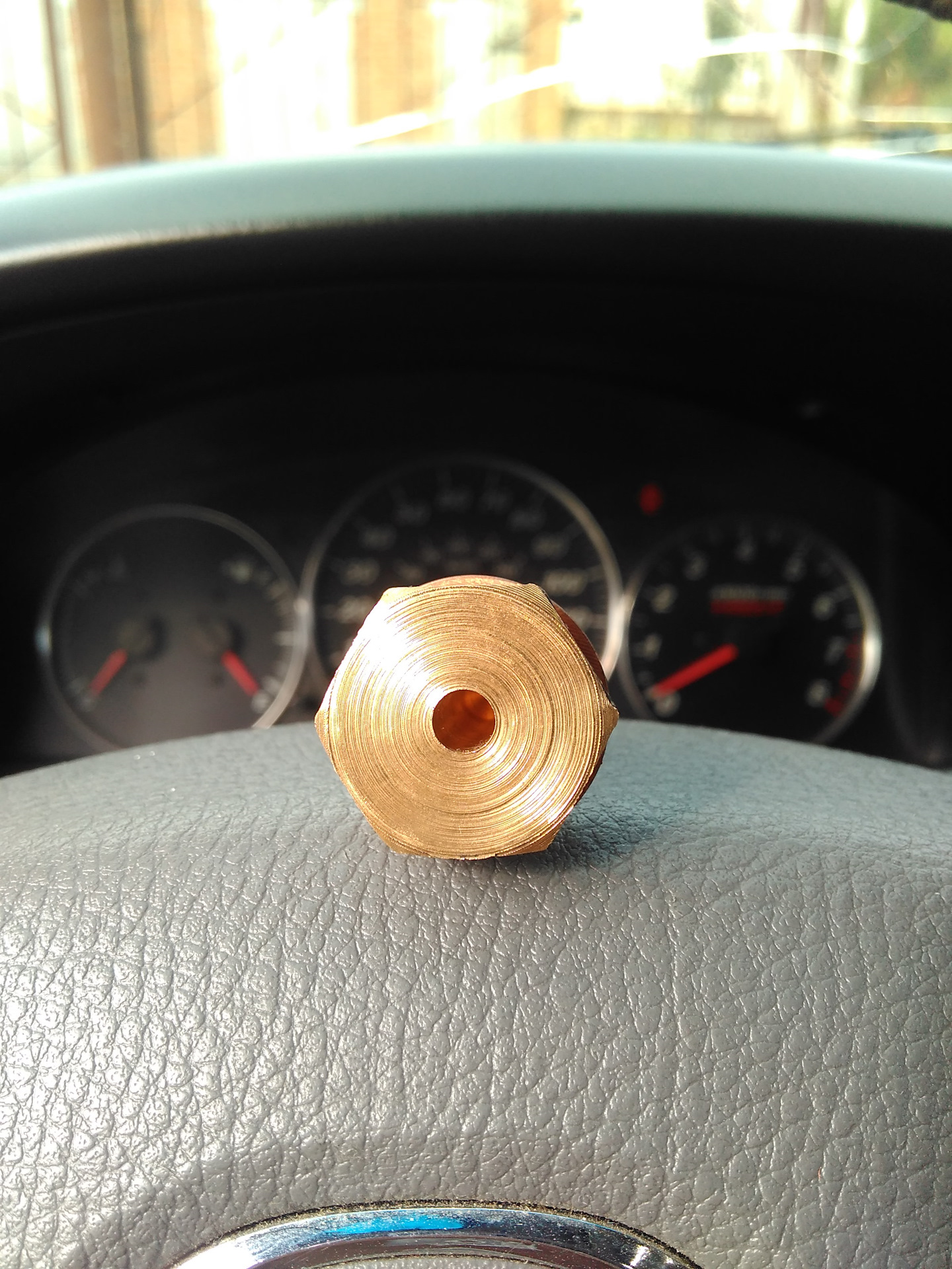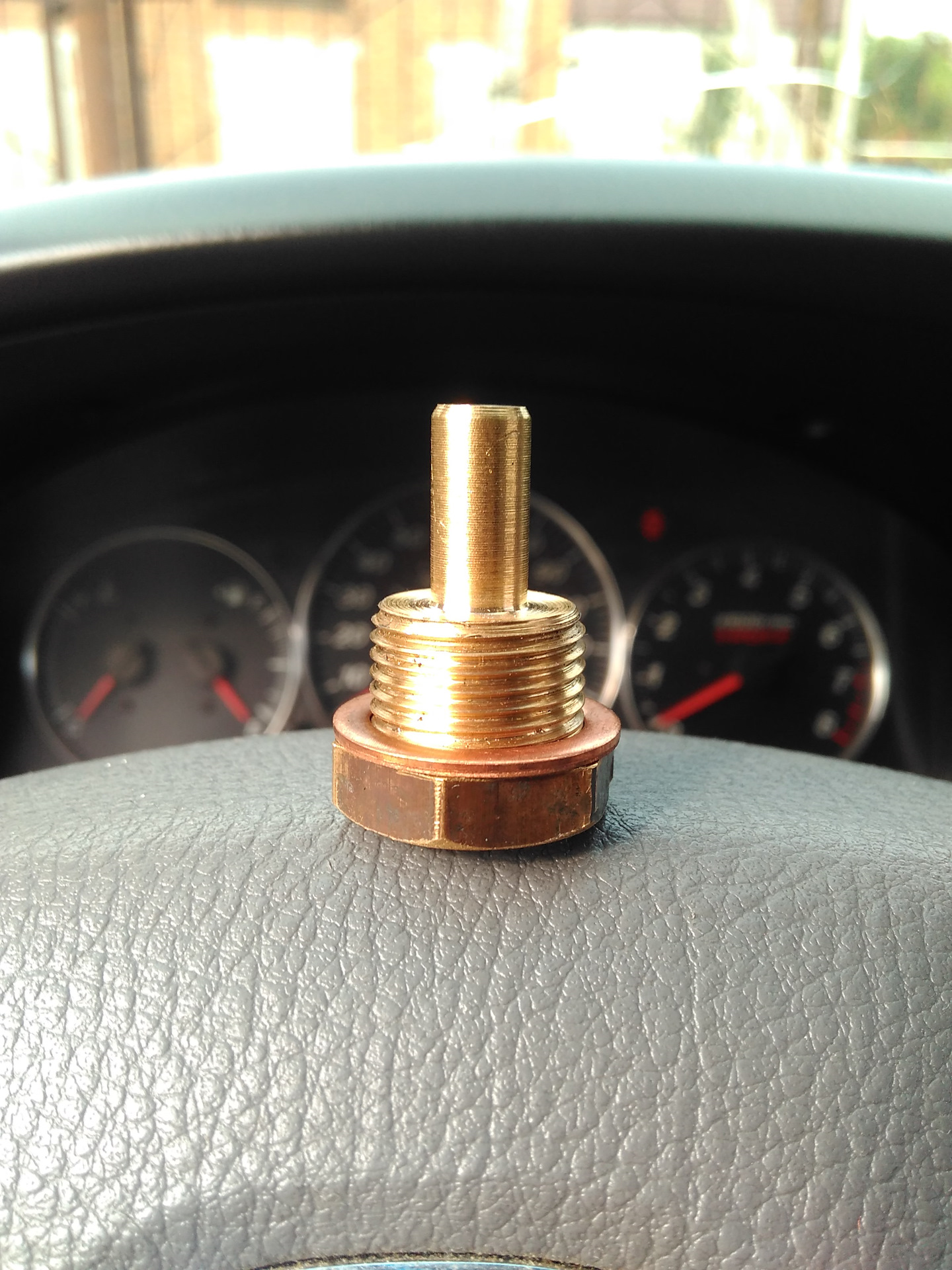 Было принято решение термометр встроить в АКПП без резки шлангов охлаждения, выбор пал на пробку слива жидкости с коробки, на заказ у знакомого токаря изготовил пробку из бронзы, почему бронза? более подходящего материала с характеристиками по прочности и теплоотдачи я у себя не нашел.