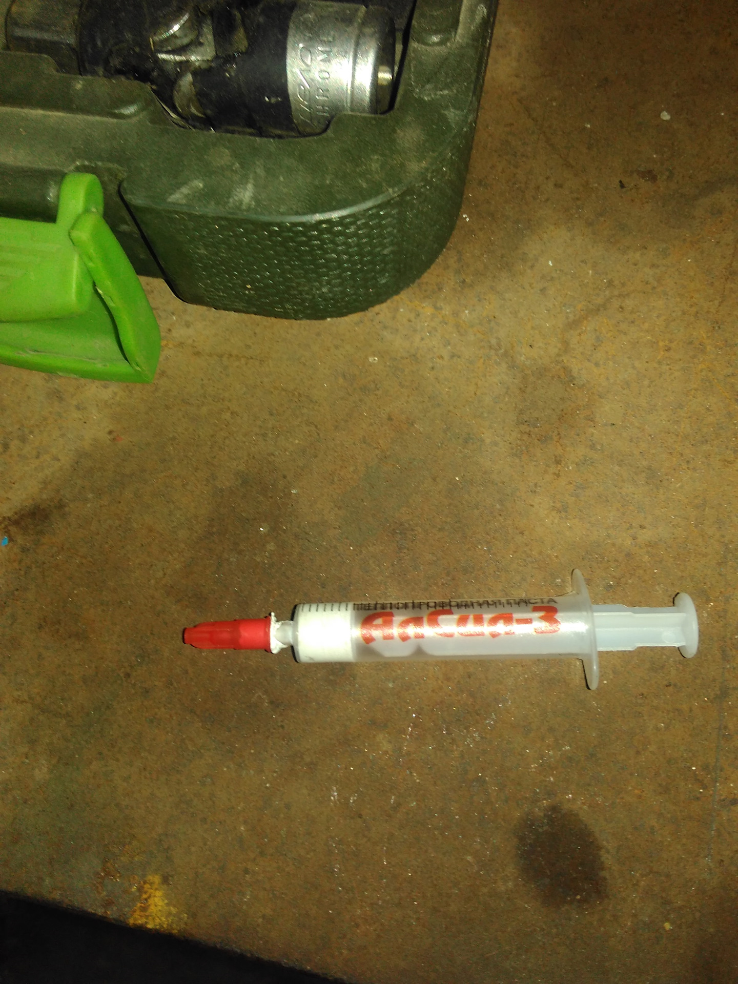 Шприц вставляем отверстие пробки и вгоняем термопасту пока она не полезит наружу.