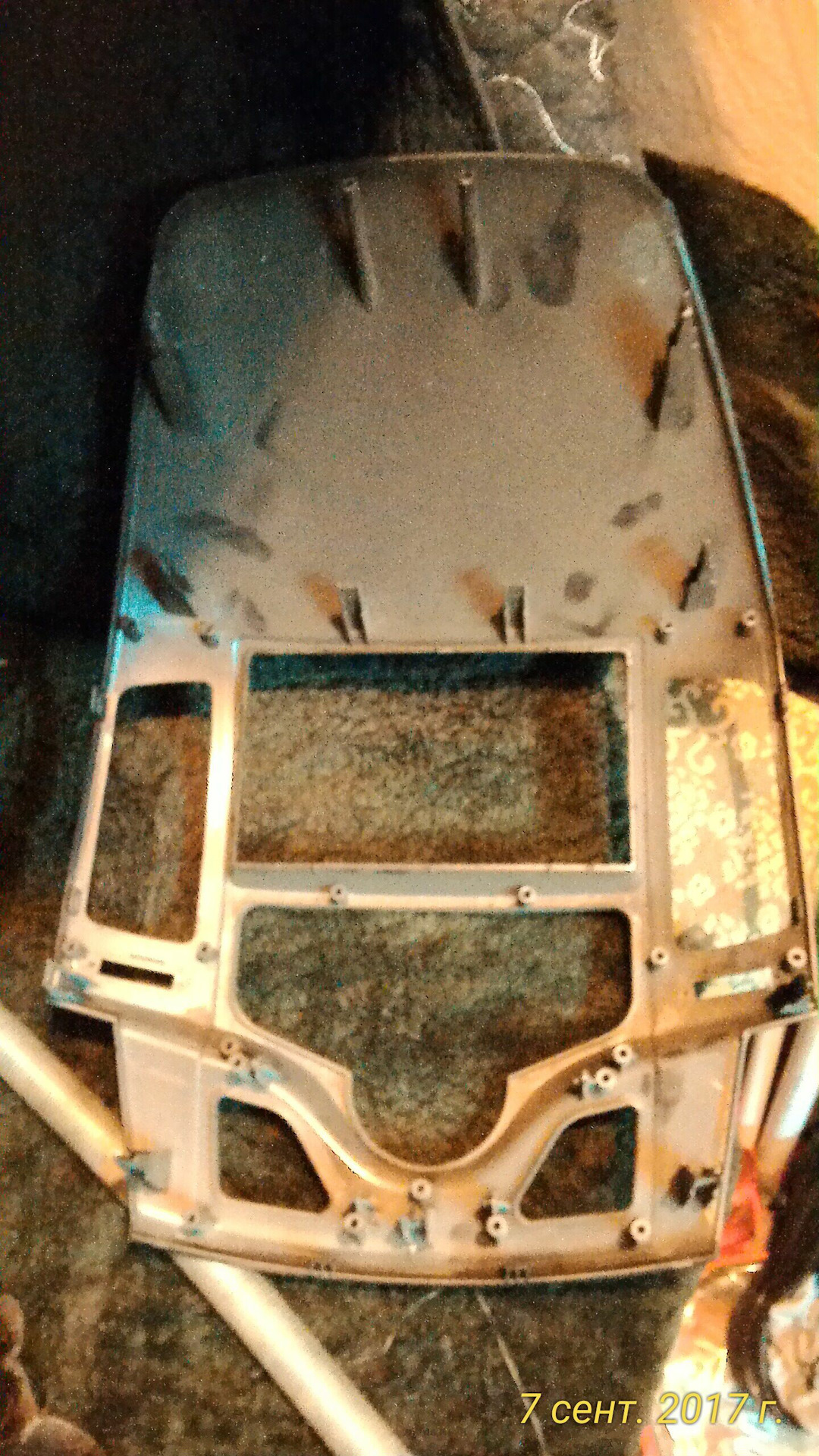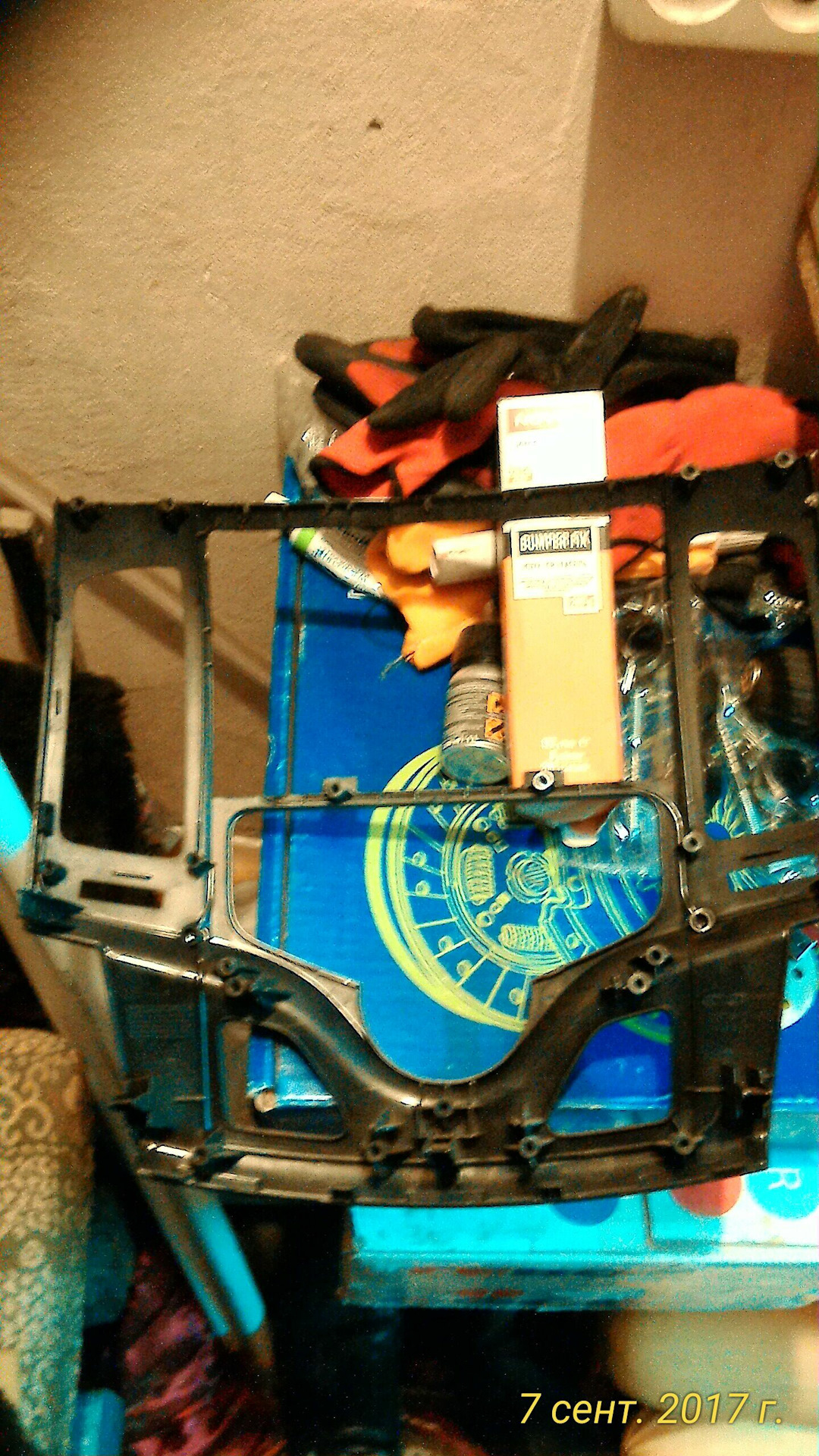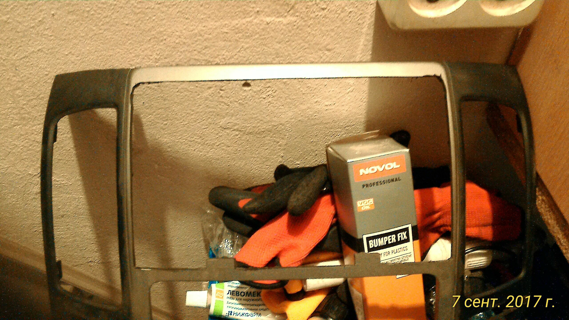 Пишу краткий отчет по изготовлению рамки лет 5-7 назад был спрос, фото самого процесса нет.но нашел остатки от рамок фото приложу ниже.все срезы видны, но можно чтонибудь изменить.если бы я отпиливал сейчас то крепления воздуховодов распилил бы в разных плоскостях одно крепление оставил бы на одной рамке, а второе на другой.от родной рамки оставляем верх под бардачок от второй низ под видео.полотном по металлу или чем-нибудь подобным отпиливаем ненужное, края проходим надфилем всехороше обезжириваем инаносишь праймер для пластика.праймер будет на фото с лева, инструкция будет в коробке.форму панели я делал из проволки.Потому чторамка полукруглой формы и если приклеить не правильно то придется изгибать потом, а стык может не выдержать напряжения .но если крепления воздуховодов будут на разных половинка то можно заранее прикрутить воздуховоды и будет проще клеить.разводим клей для пластика как написано в инструкции промазываем все что соприкасается друг с другом, с внутренней стороны можно намазать побольше и потолще, а с снаружи поокуратней чтоб потом м еньше шкурить и идем пить чай.после полного высыхания обрабатываем наружный шов.шкурим, шпаклюем, красим.вообщем делаем все возможное чтобы шва не было видно!затемрамку можно покрасить.я покрыл альконтарой.черной.но с годами она выцвела, была черная.стык обработал не очень и если приглядеться то его видно через материал.будут вопросы по отдельному фото-отвечу.