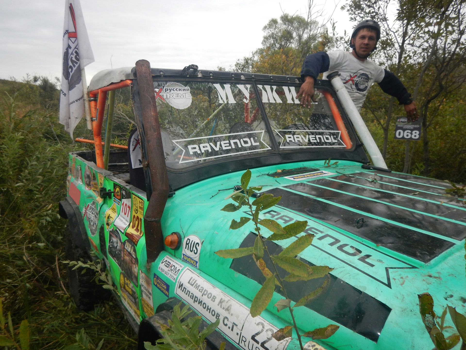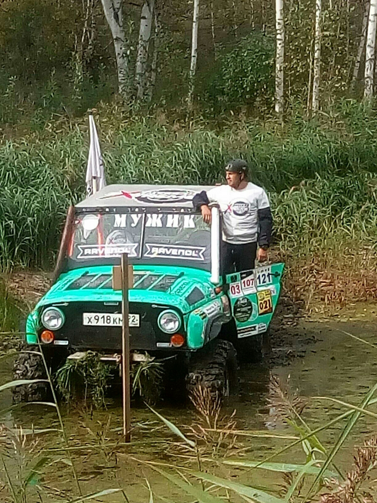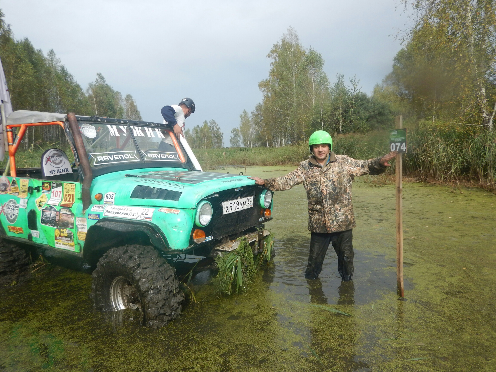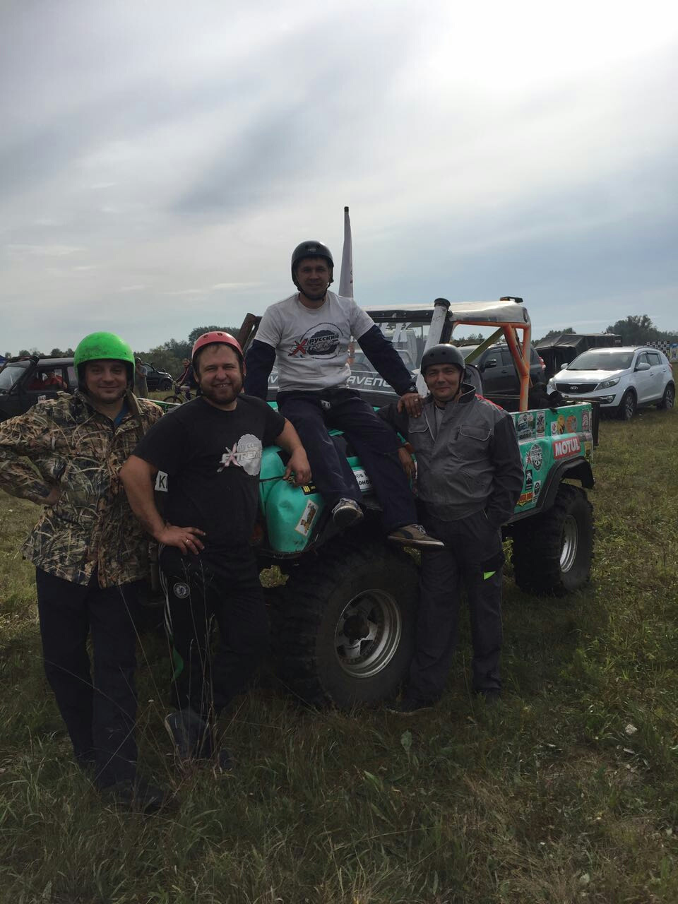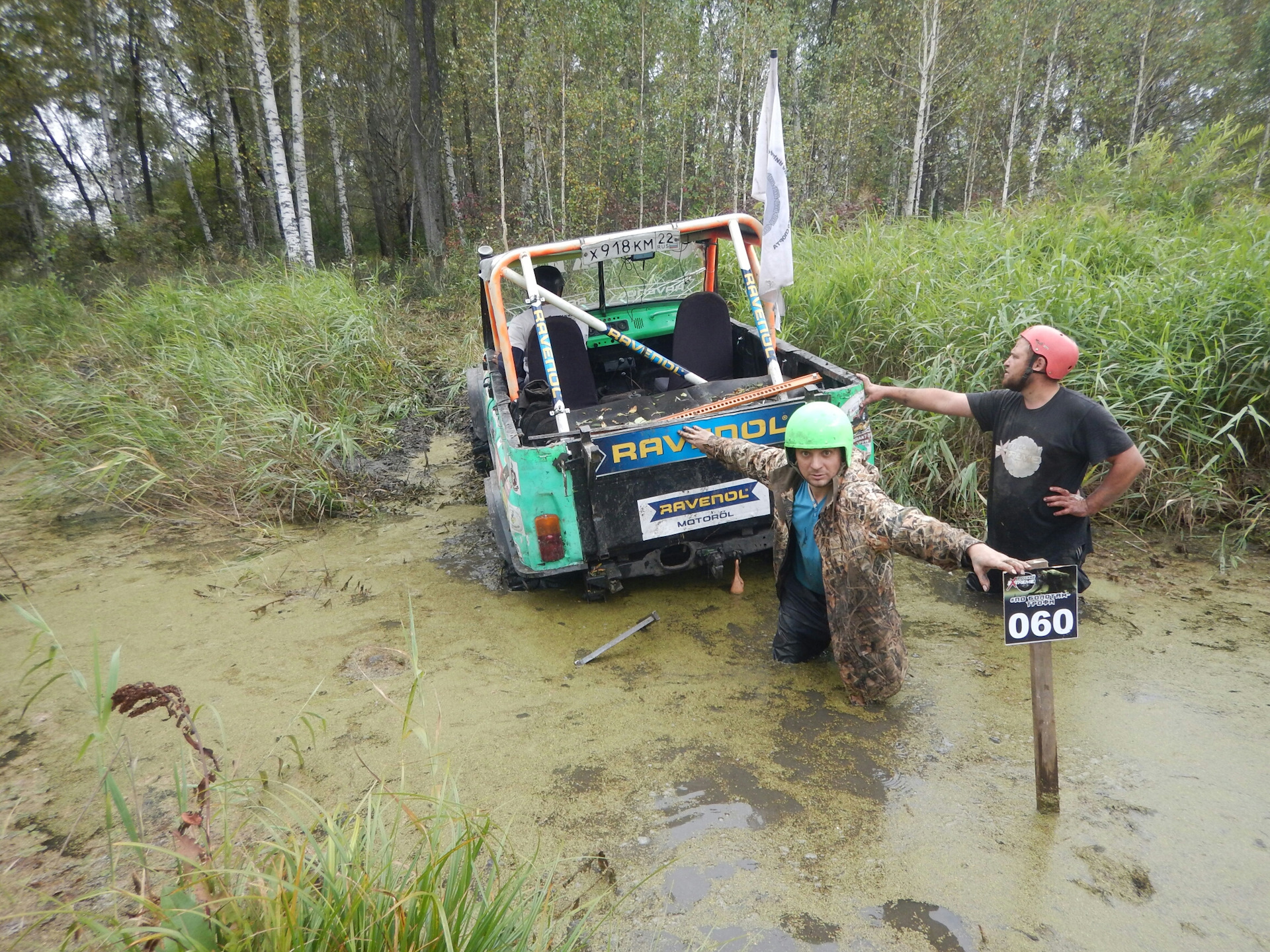 И так доезжаем до первой точки спускаемся в болото и к нашему удивлению машина спокойно двигается сама без какой то помощи, мы легко собираем 4 точки и спокойно выезжаем в крутой подьем, . Дальше легко собираем ещё несколько точек и выезжаем к реке на которой по руслу бьётся много точек. Так как берега были крутые нам долго пришлось искать спуск в реку и тут пробираясь через непролазные кусты и ручьи мы первый раз встряли( уронили машину в ров четко по длине машины и не туда и не сюда) все бы ни чего но по регламенту ЧГ 2017 в классе ТР2 запретили лебедки, а мы в "жопе", но для таких случаев у нас есть ручная лебедка. 5 минут работы и мы снова в бою. Спустились в русло и проехали по нему около 1 км. собирая точки по берегам. Дальше все как всегда едем собираем баллы и особо не напрягается. Хотелось отметить одну вещь, трасса хоть и была компактная но очень каварная так как была расположена в старом русле реки и извивалась вся как змея. Было очень тяжело работать штурманам по навигации и нам пришлось неоднократно возвращаться и терять время на поиски путей подъезда к точкам. Что хотелось бы сказать в итоге: очень интересная трасса, но точки для нас были лёгкие, хотя нашим соперникам было не так легко, только мы собрали все точки и больше половины мы взяли первыми.