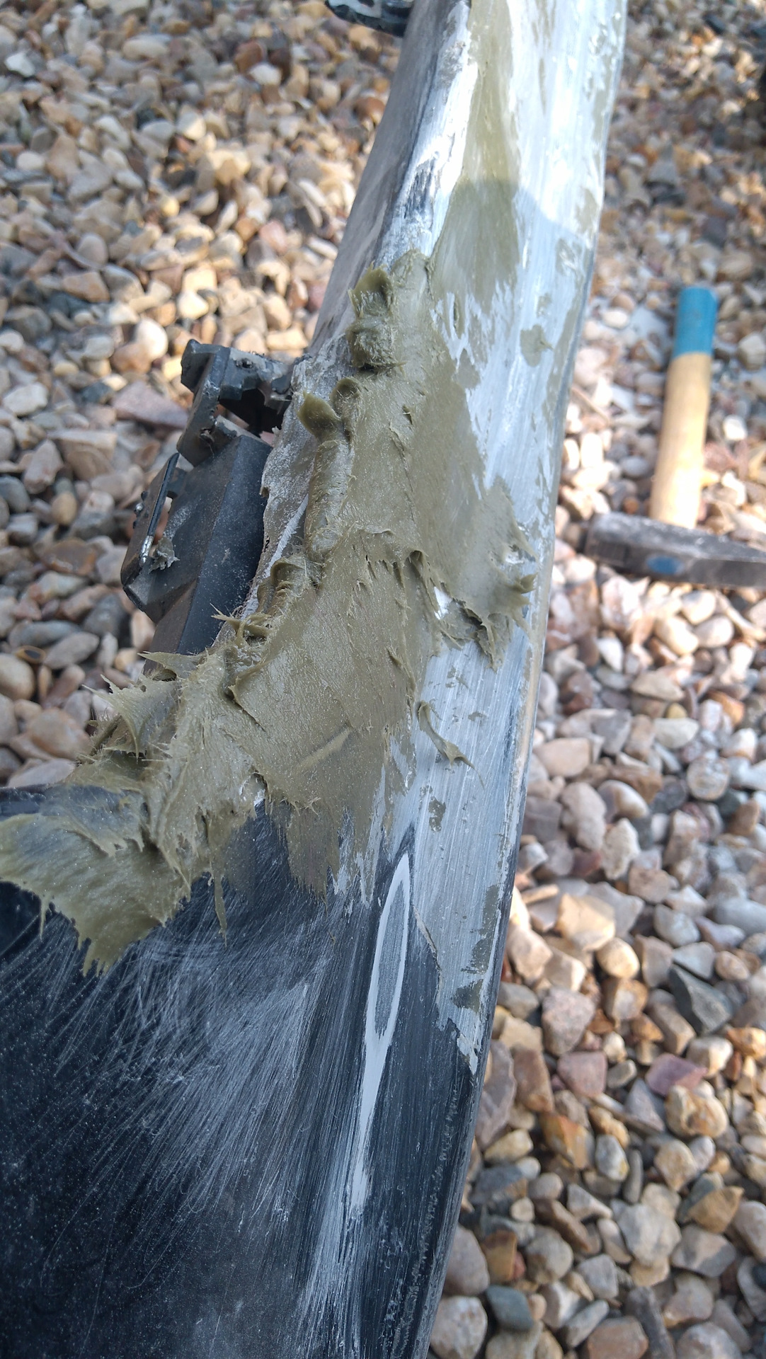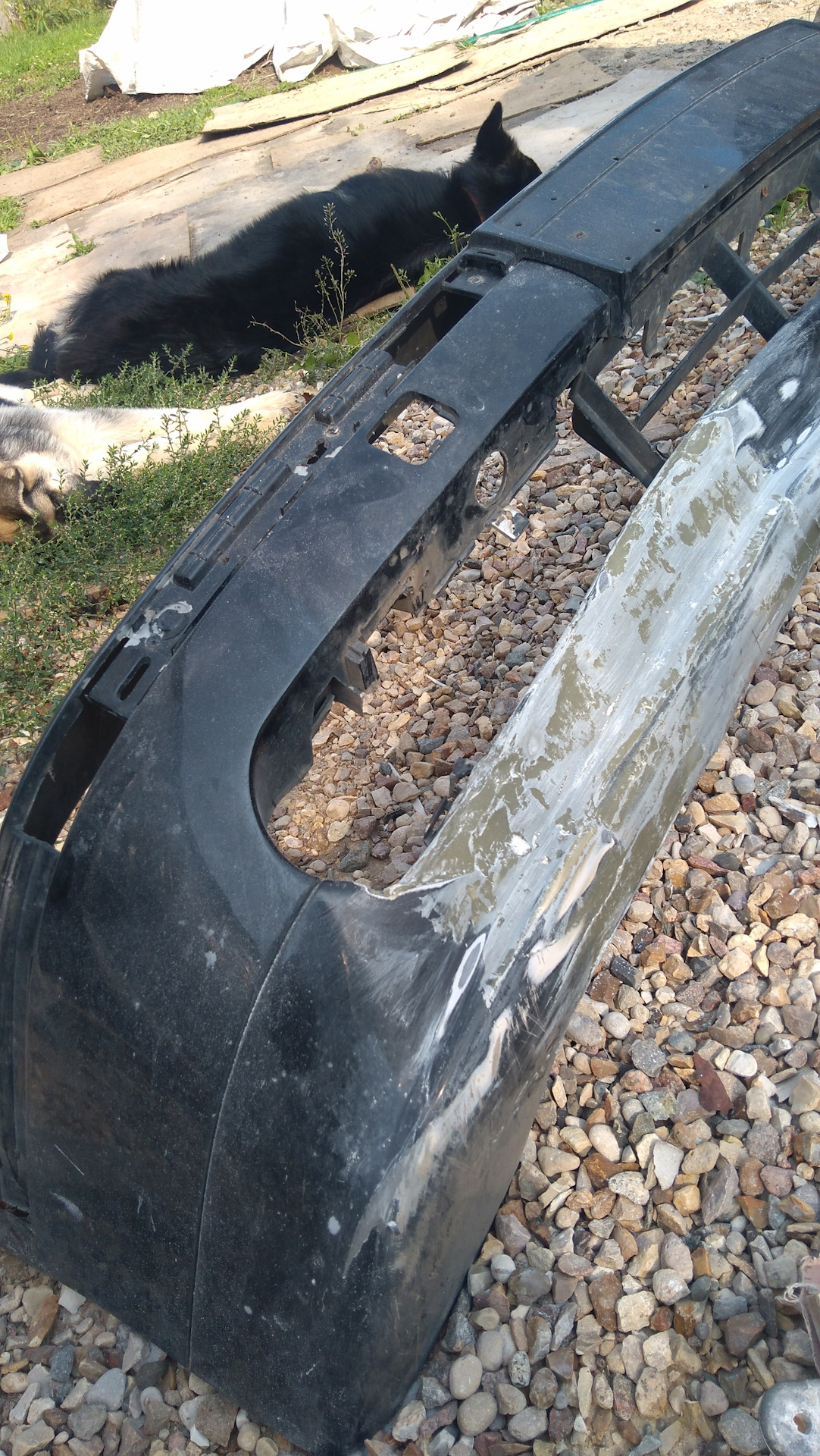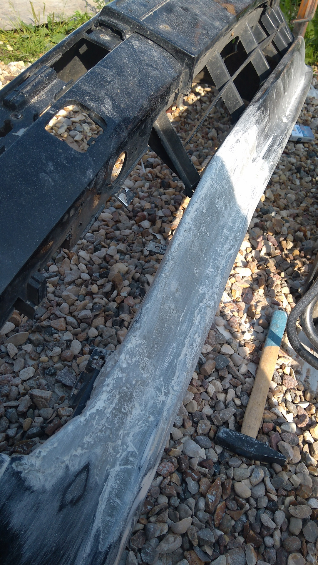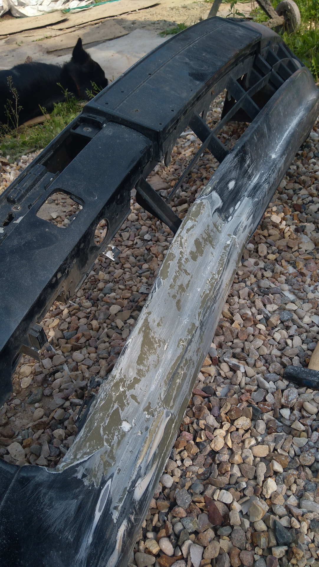 надо паять, отвалится шпакло, эт жирный пластик, я такой бампер паял феном и полосками такого же пластика, хорошо выходит и крепко.