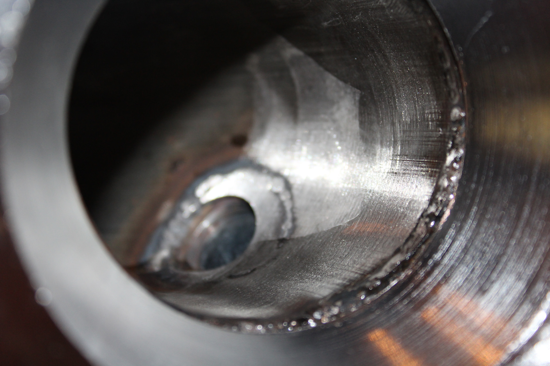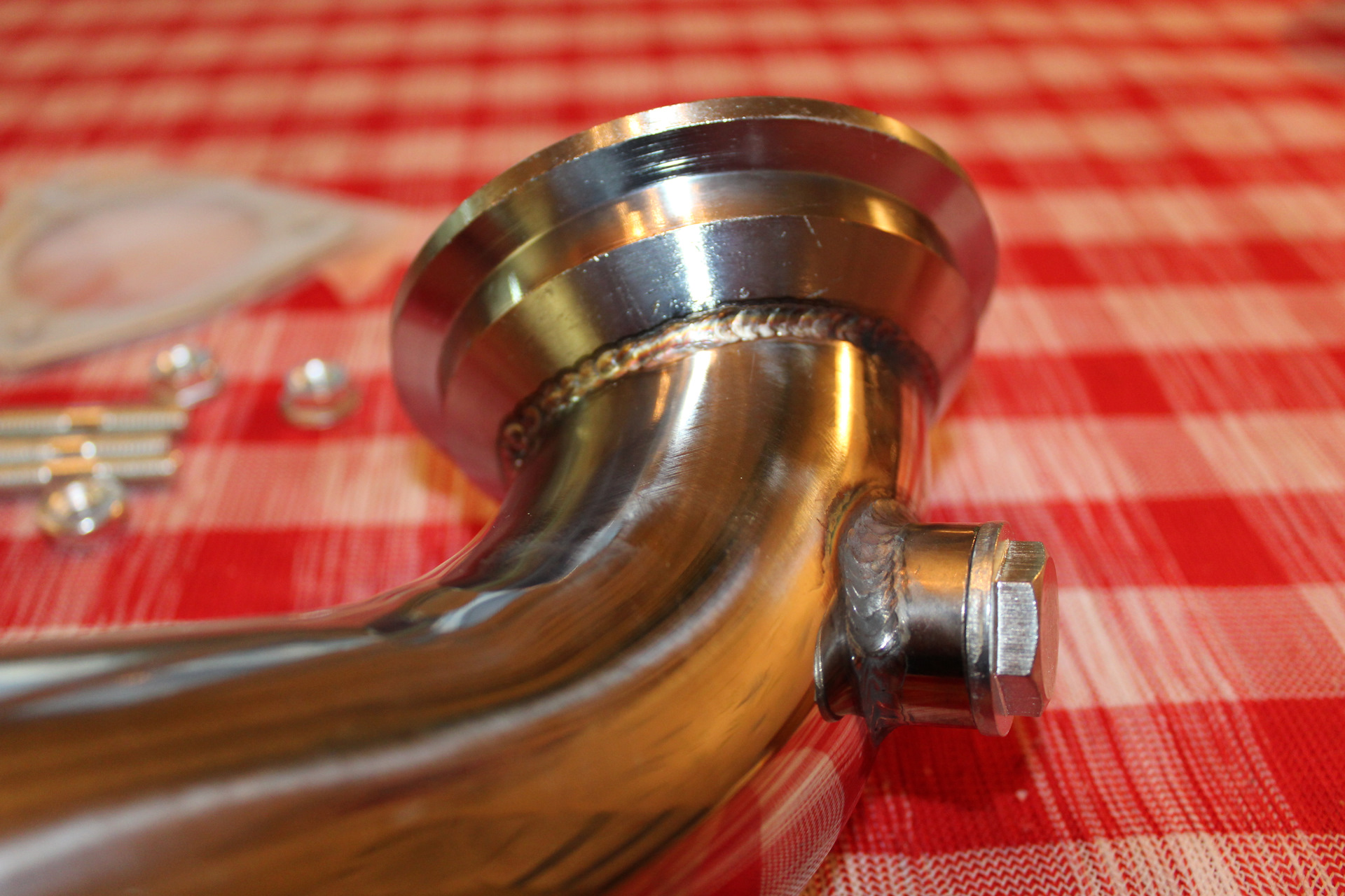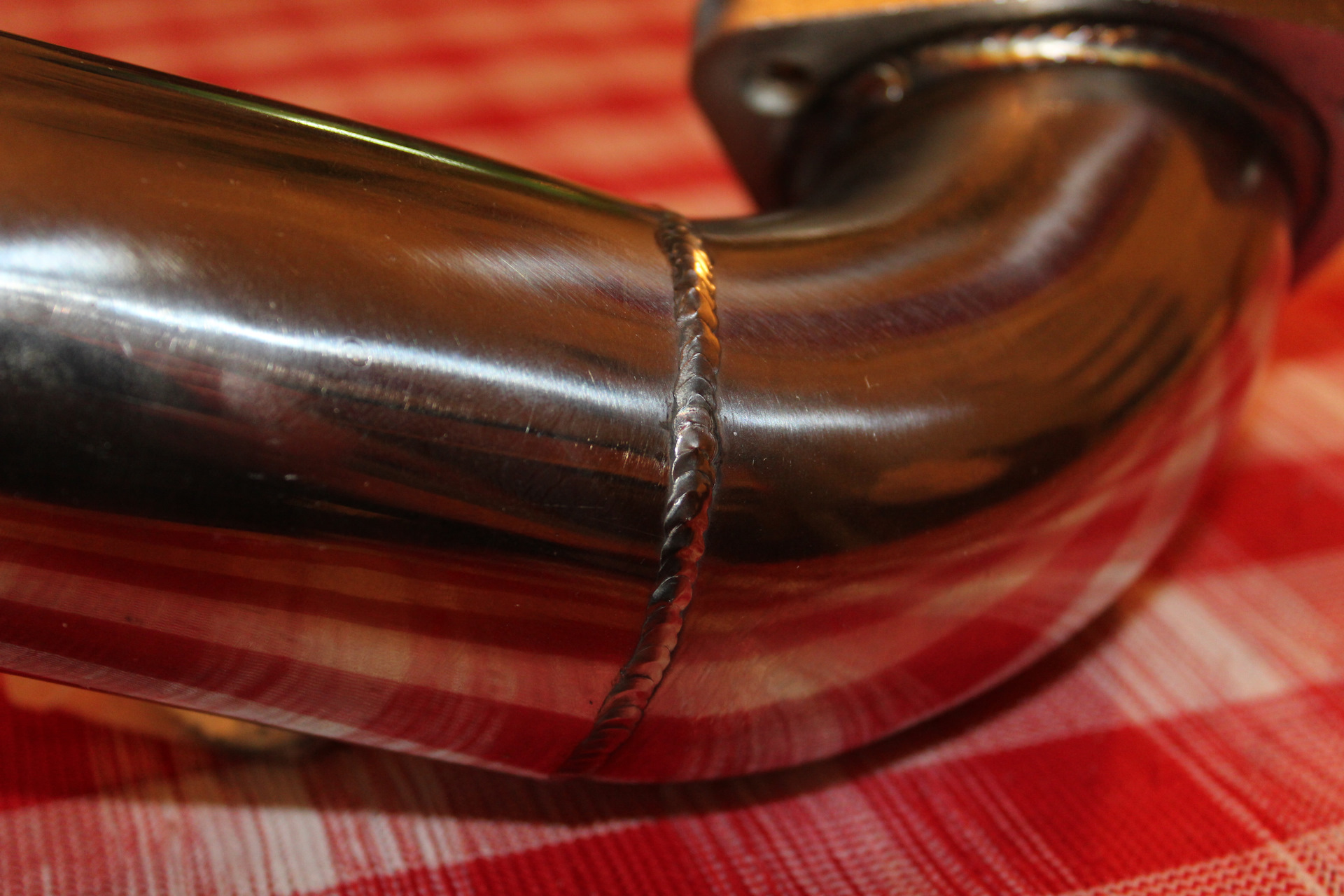 Декат 63мм диаметром. Сталь 2мм. Проварен только снаружи, внутри сделано механическое шлифование после сварки. От картинки продавца отличается, приехал сваренный из двух отводов. Магнит липнет только к фланцам, к трубе не липнет — похоже отводы, действительно нержавейка. В нижнем фланце (который к приемной трубе) в отверстиях нарезана резьба для шпилек (которые пришли в комплекте с пайпом).