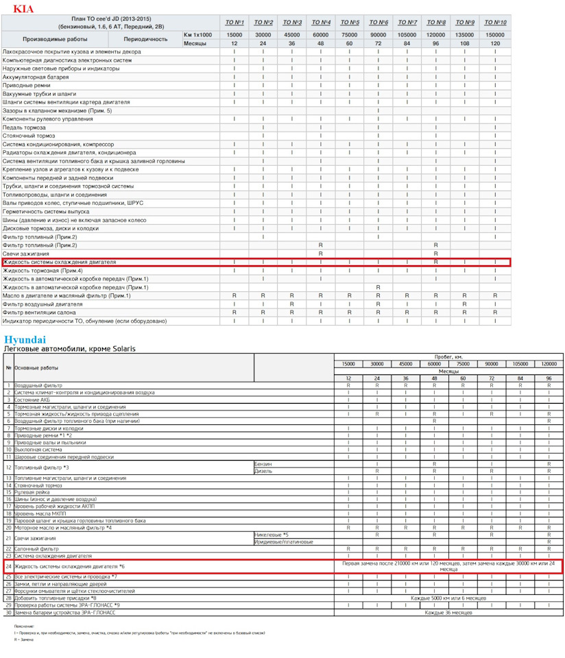 По регламенту допустим меняется на 120000 км, мне кажется это поздно слишком, у меня например машине 4 года, пробег 80000 км, планирую менять скоро. А так на доливку брал только cool stream и всё. А главное в Hyundai в регламенте вообще не меняется можно сказать такой-же антифриз…(Написано на 210000 км) О_о И вообще на те же расходники совершенно другие интервалы пробегов и времени, где истина?