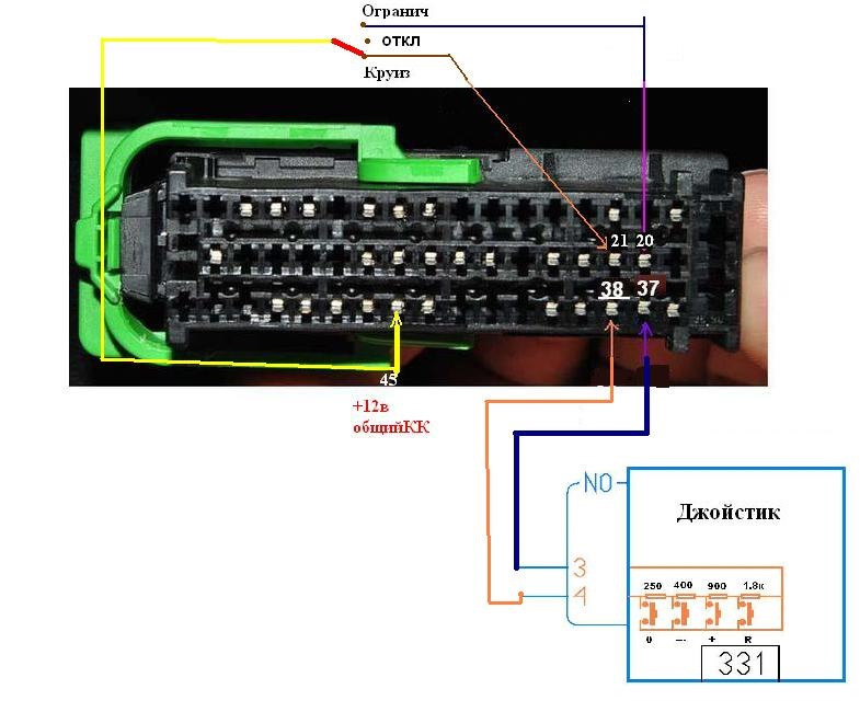 И вот с этого места каждый идет своим путем .Эти проводки нужны для того, чтобы подключить кнопки управления круиз контролем. Вариантов много каждый выбирает по желанию и возможностям. Я тоже старался сделать все более бюджетно, так как до последнего момента не был уверен в полном успехе данного мероприятия и тратиться сильно не хотелось. Некоторые подпаивались к этим проводкам и дальше мастрячили кнопки, кто как пожелает, я решил выяснить куда эти проводки уходят и в этом помогла схема ну и обсуждения на форумах. Так вот 20 и 21 проводки идут как раз на тот разъем, который был обнаружен в районе рычага переключения режимов АКПП, а 37 и 38 проводки уходят на серый разъем, который находится под кожухом руля в районе подрулевого джойстика управления магнитолой. В этом разъеме присутствуют еще два проводка для сигнала. Они располагаются попарно и понять какая пара за что отвечает очень просто — надо замкнуть попарно проводки .В первом случае раздастся гудок, а во втором случае ни чего не произойдет, так вот эти два нам и нужны, к ним мы будем подсоединять наши кнопки. Бояться чего -нибудь закоротить не надо — ничего не коротнет, хотя бы потому что один из режимов работы кнопок как раз и есть режим при котором они замыкаются накоротко.