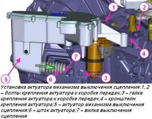 — переместить актуатор 5 в направлении стрелки до касания штоком 6 вилки 7 выключения сцепления и отметить безударным способом положение кронштейна 4 относительно коробки передач;