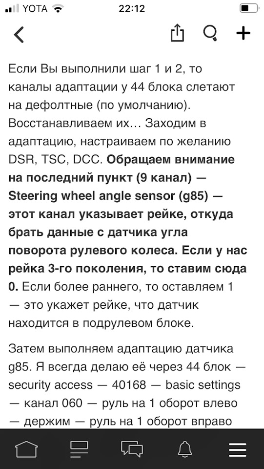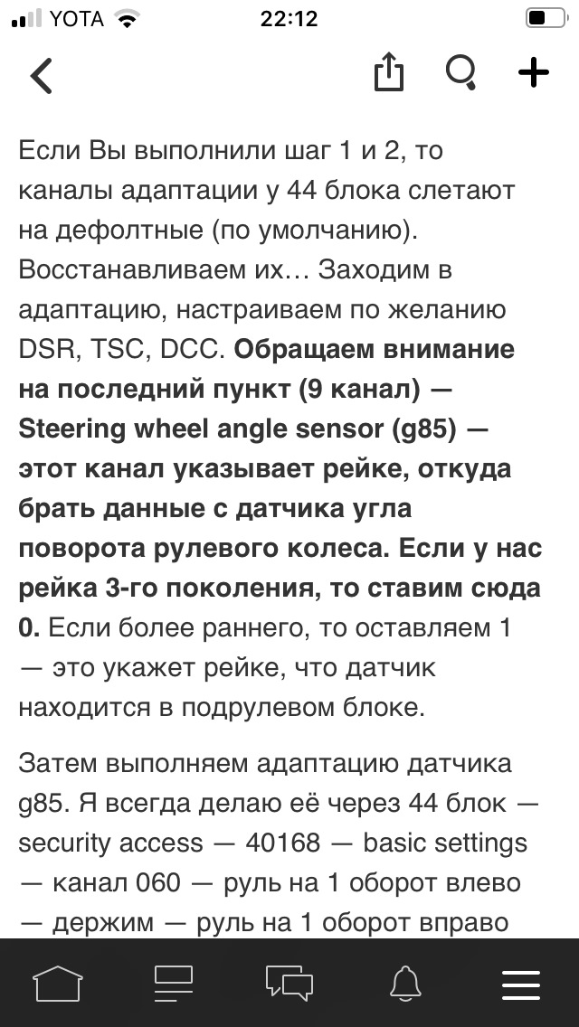 Затем выполняем адаптацию датчика g85. Я всегда делаю её через 44 блок — security access — 40168 — basic settings — канал 060 — руль на 1 оборот влево — держим — руль на 1 оборот вправо — держим — возвращаем назад в 0 — кнопка on/off. Готово.